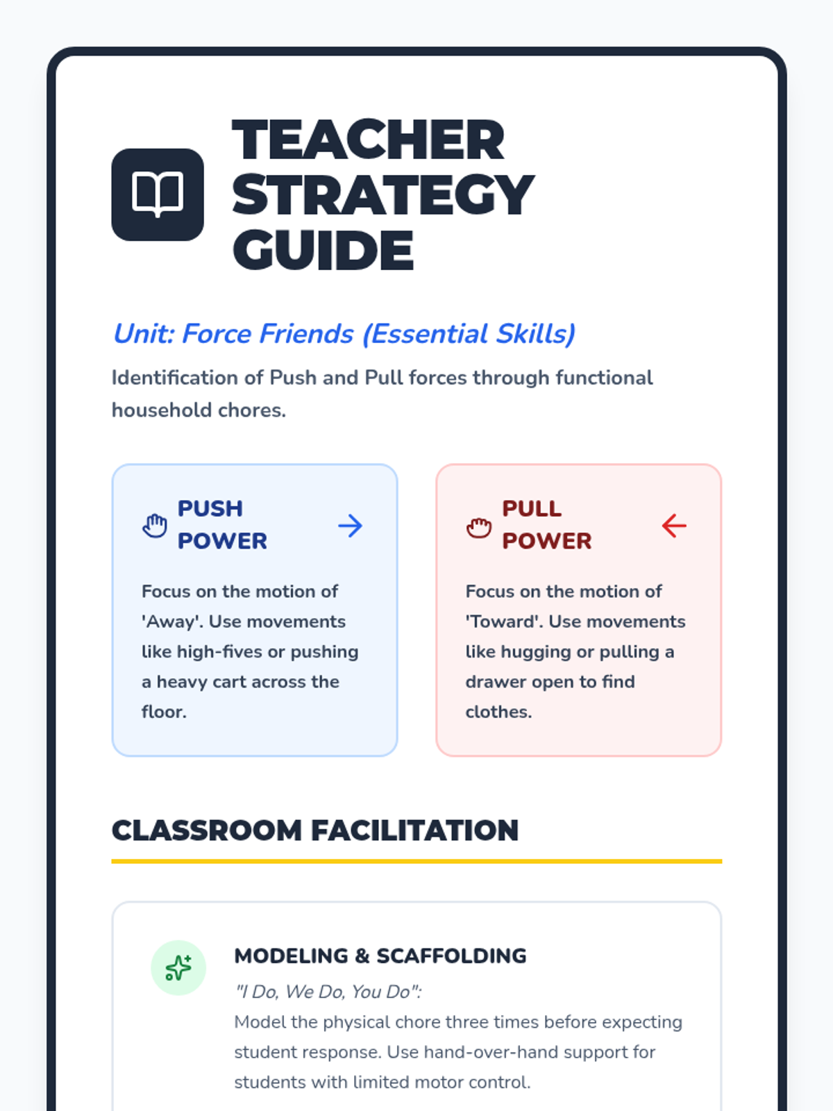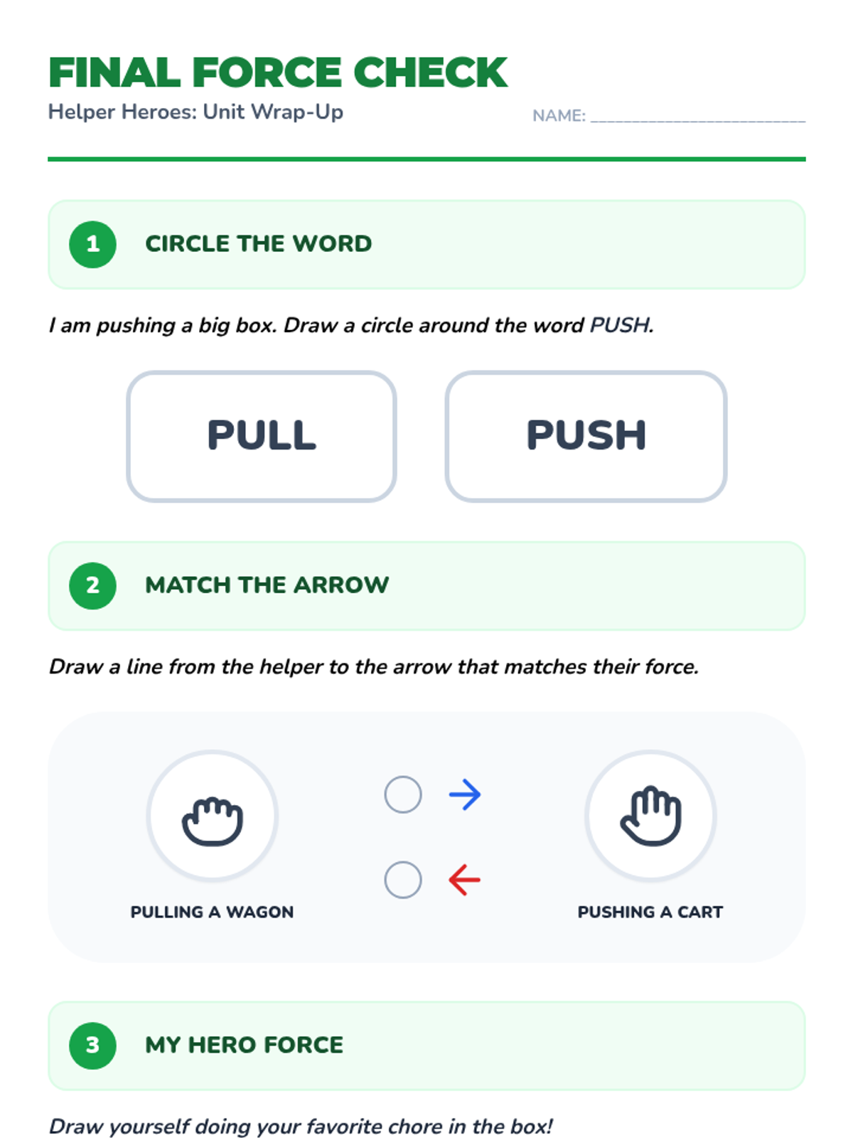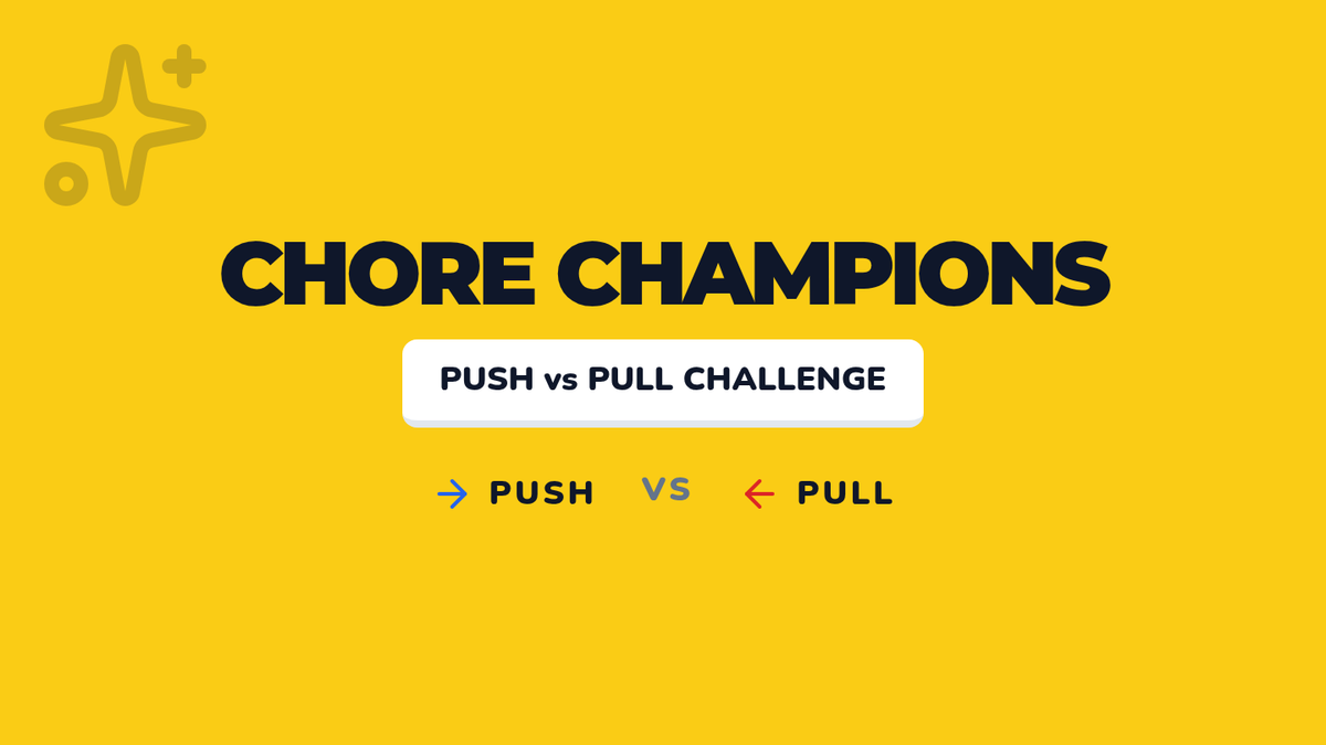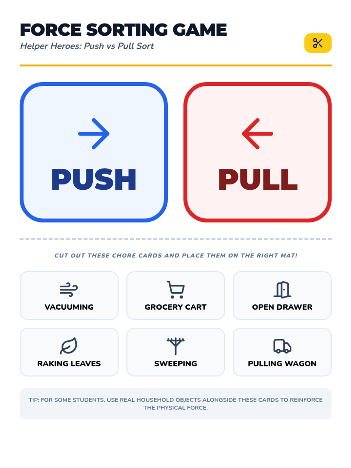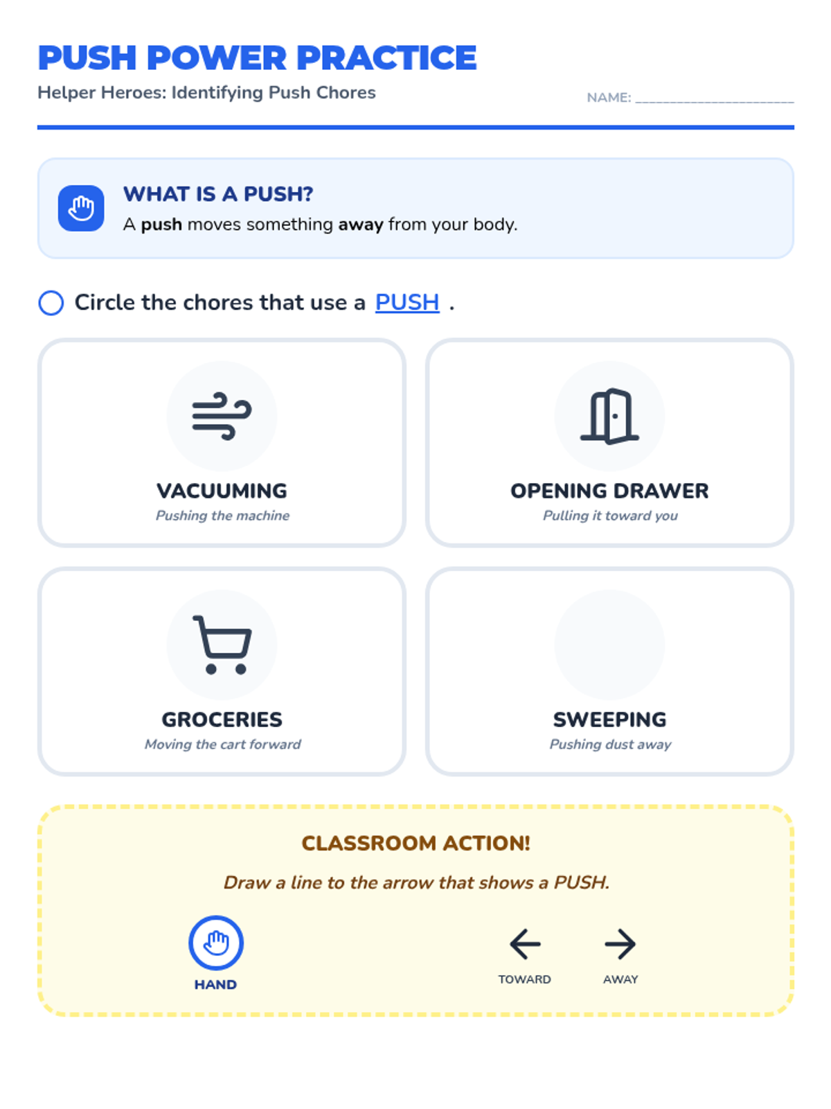 A review lesson where students sort various chores into push or pull categories and participate in a class-wide 'Chore Challenge' game.