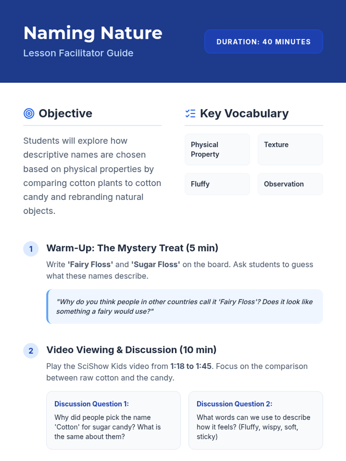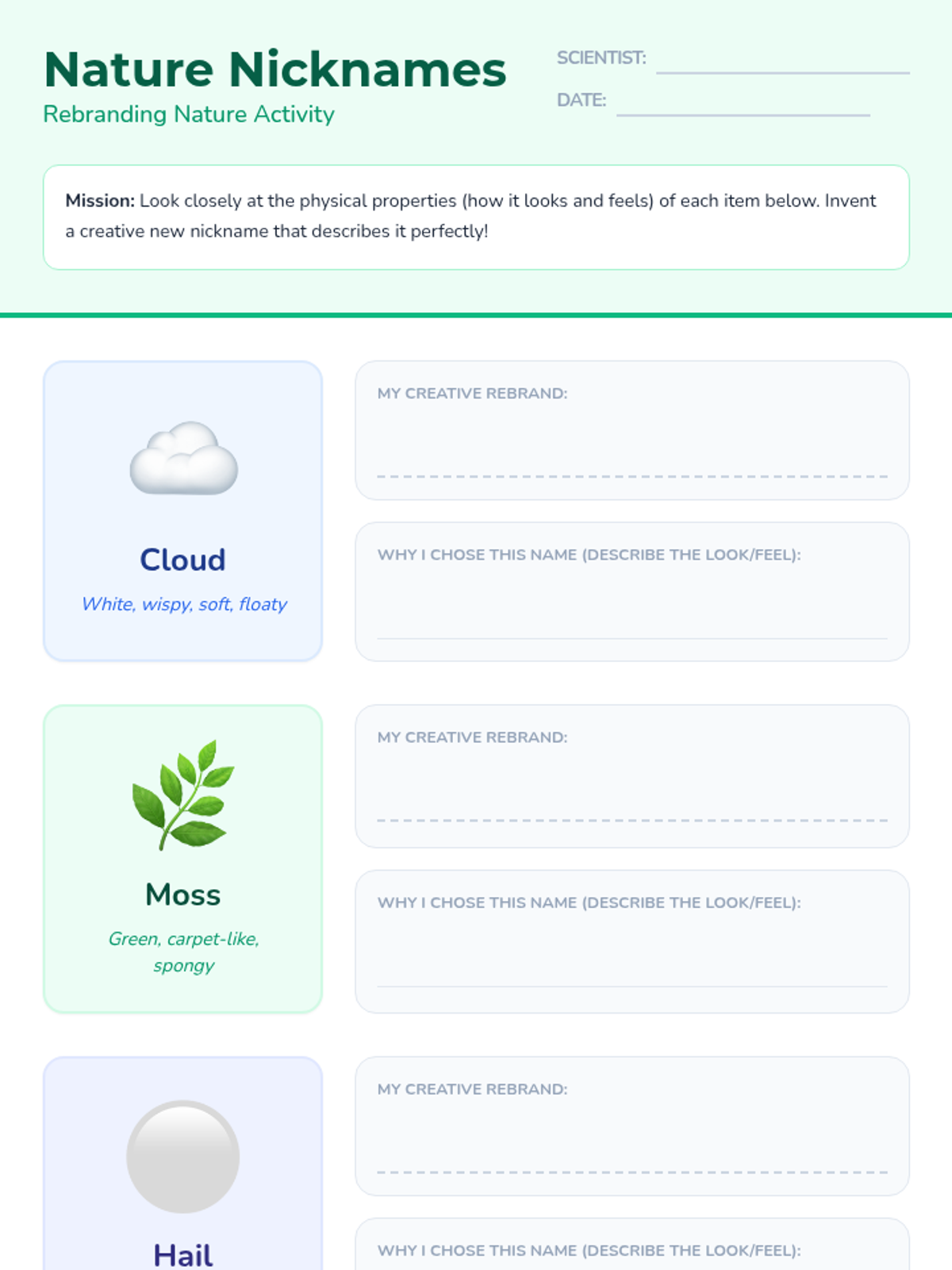 Students will investigate the relationship between physical properties and descriptive naming by watching a video about cotton candy and rebranding natural objects like clouds, moss, and hail based on their texture and appearance.