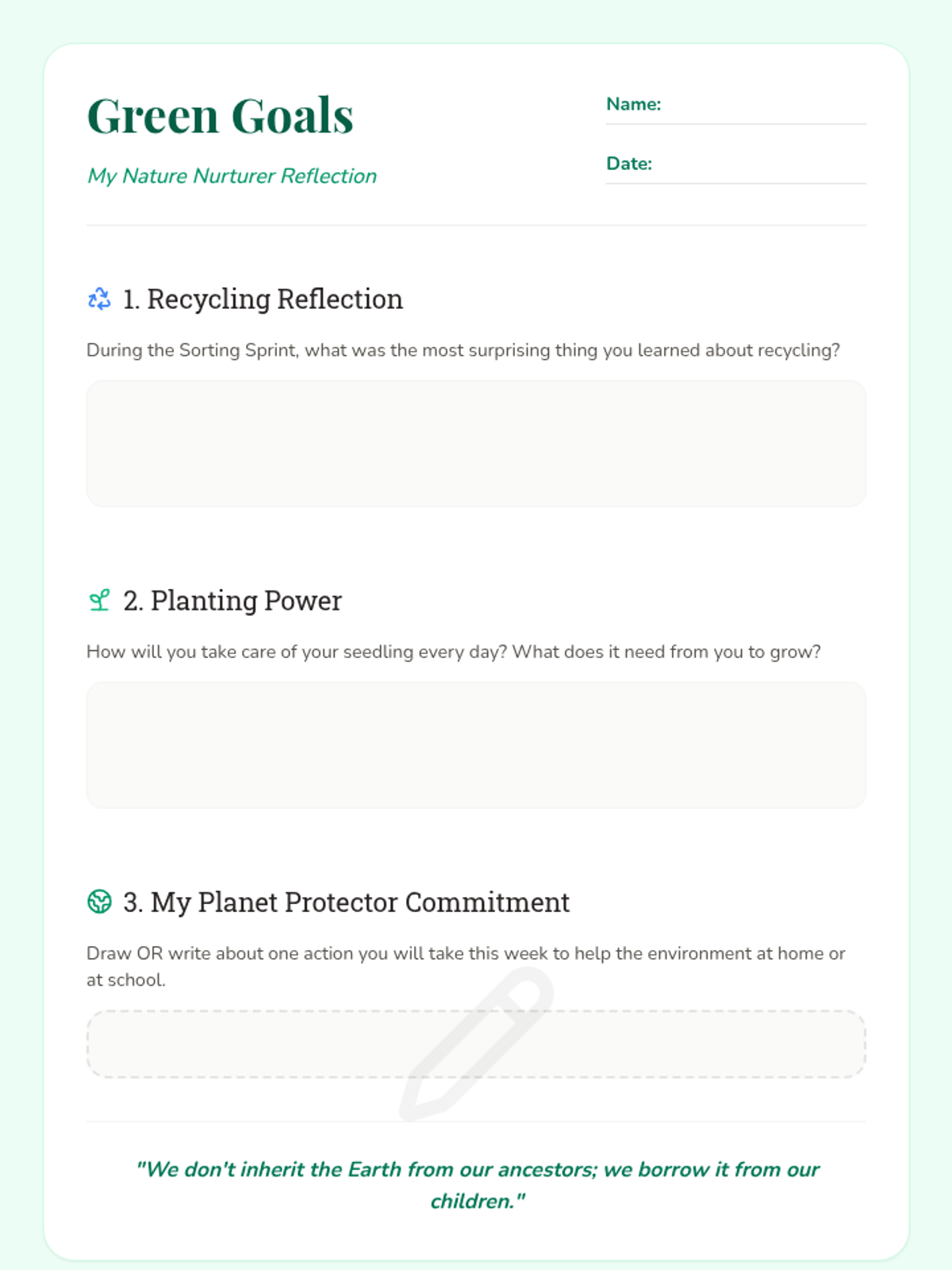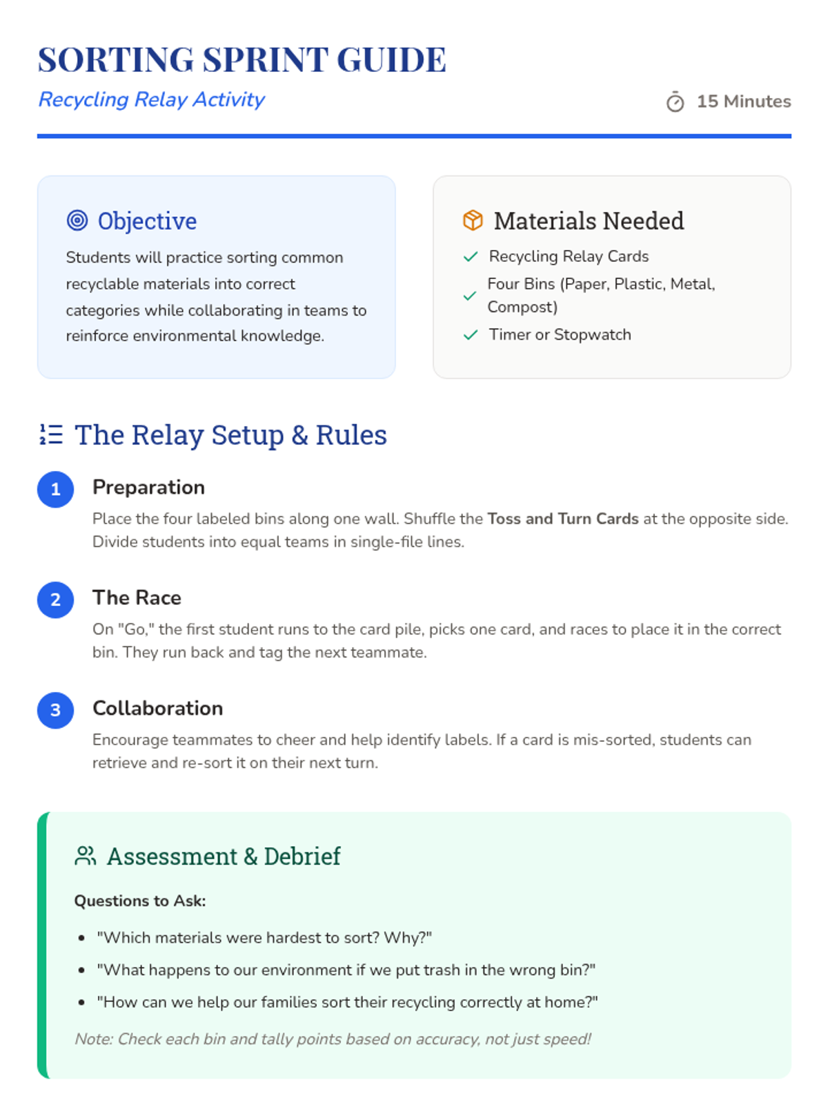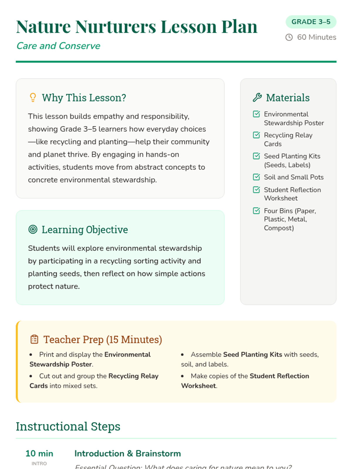 A 60-minute lesson for Grades 3-5 that inspires environmental stewardship through a recycling relay, seed planting, and reflective goal-setting. Students explore how small actions like sorting waste and nurturing plants contribute to a healthier community and planet.
