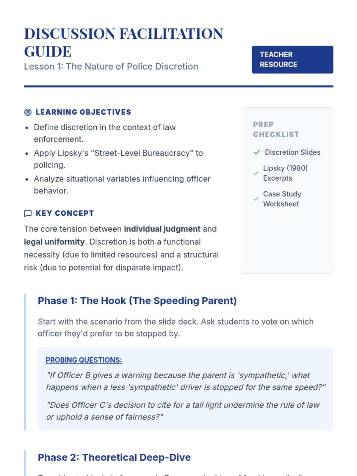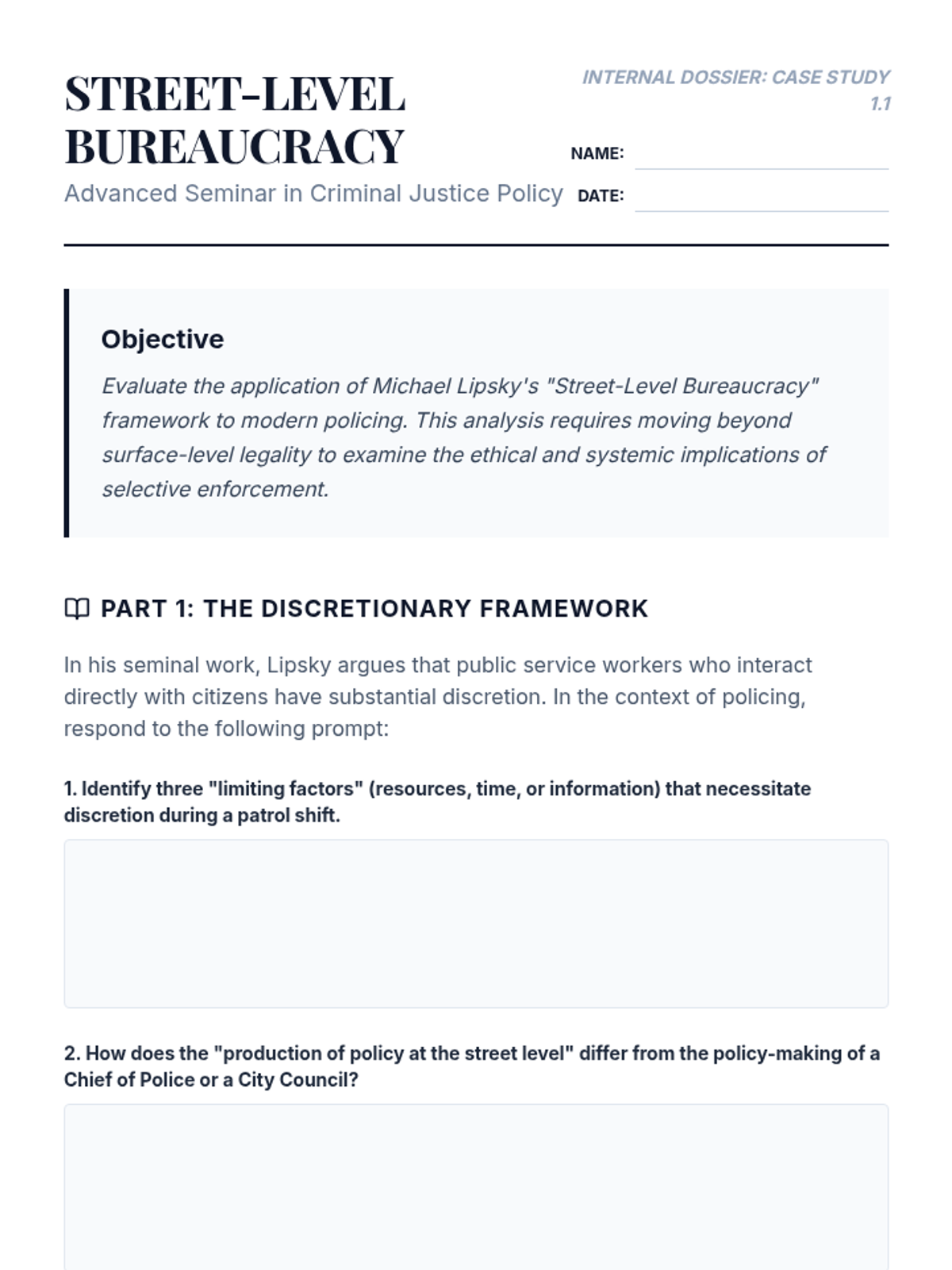 Analyze the necessity and ethical implications of discretionary power in law enforcement. Students explore the concept of 'street-level bureaucracy' and the factors that influence officer decision-making in the field.