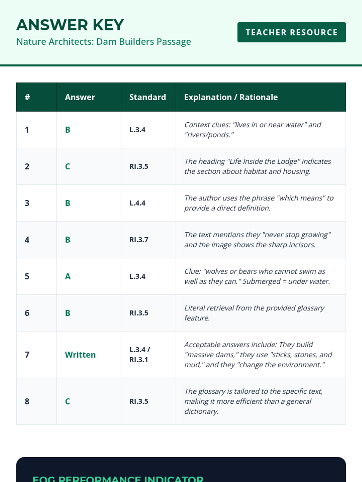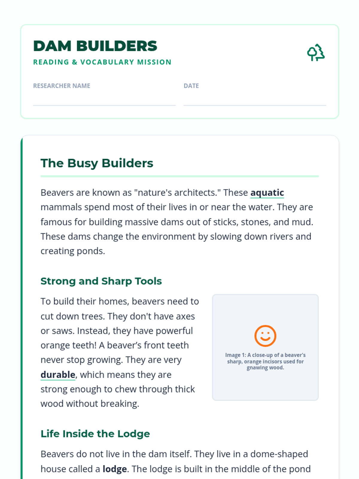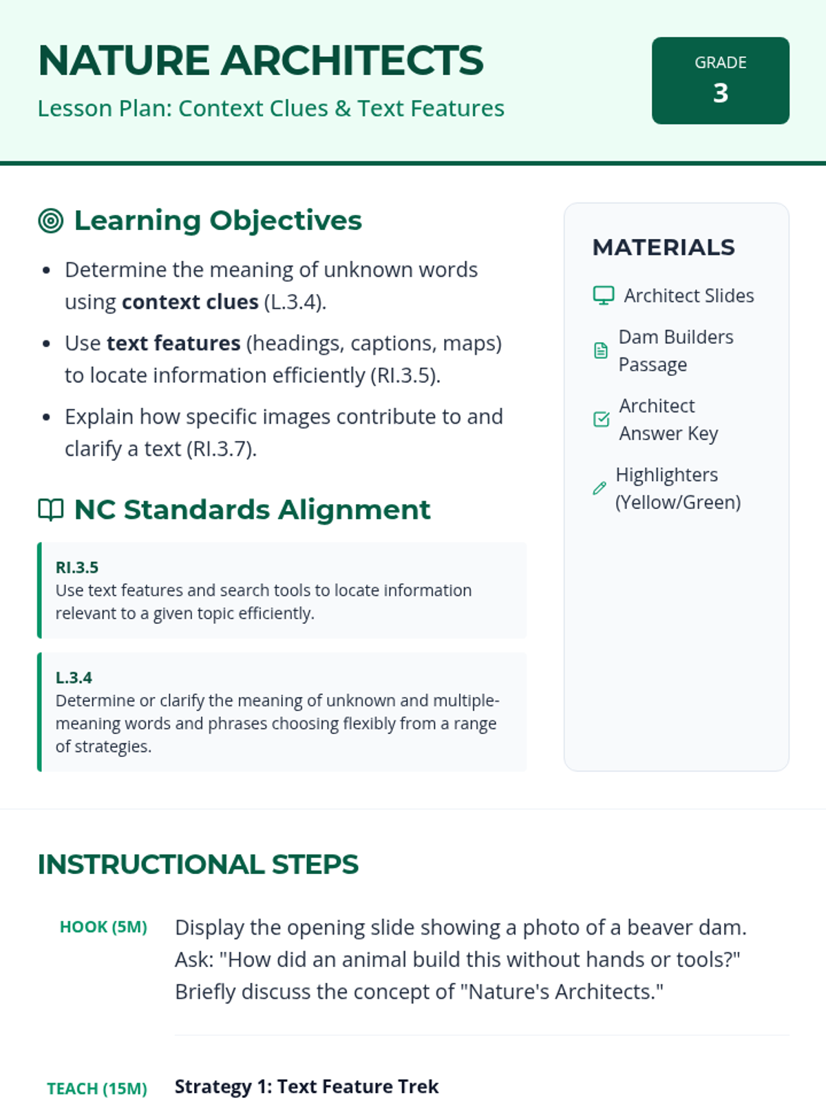A 3rd grade ELA lesson focused on mastering context clues and navigating nonfiction text features, aligned to NC Standard Course of Study RI.3.5 and L.3.4. Students explore the fascinating world of beavers while practicing EOG-style vocabulary and comprehension questions.