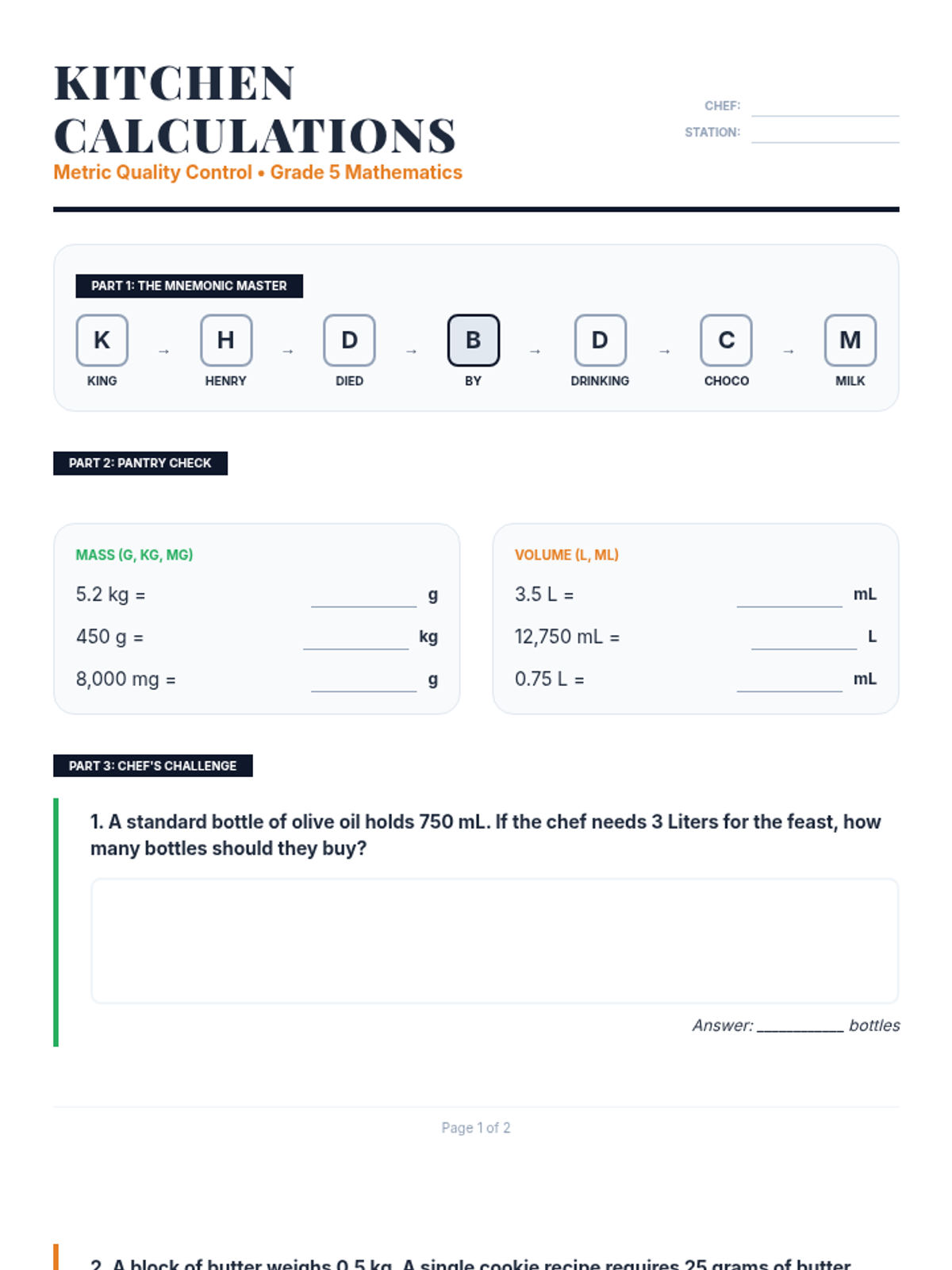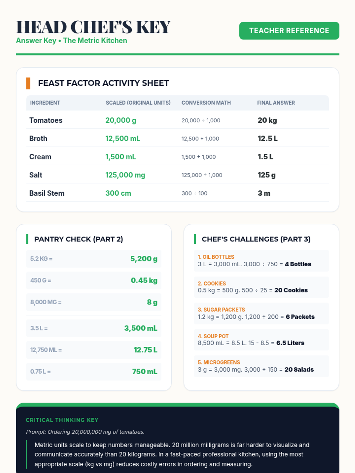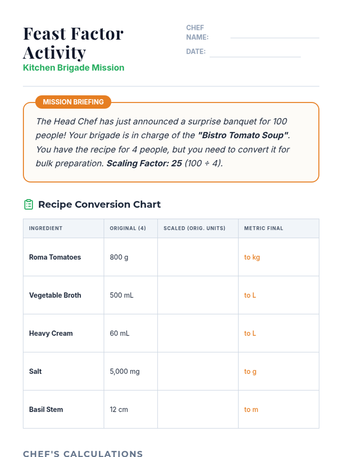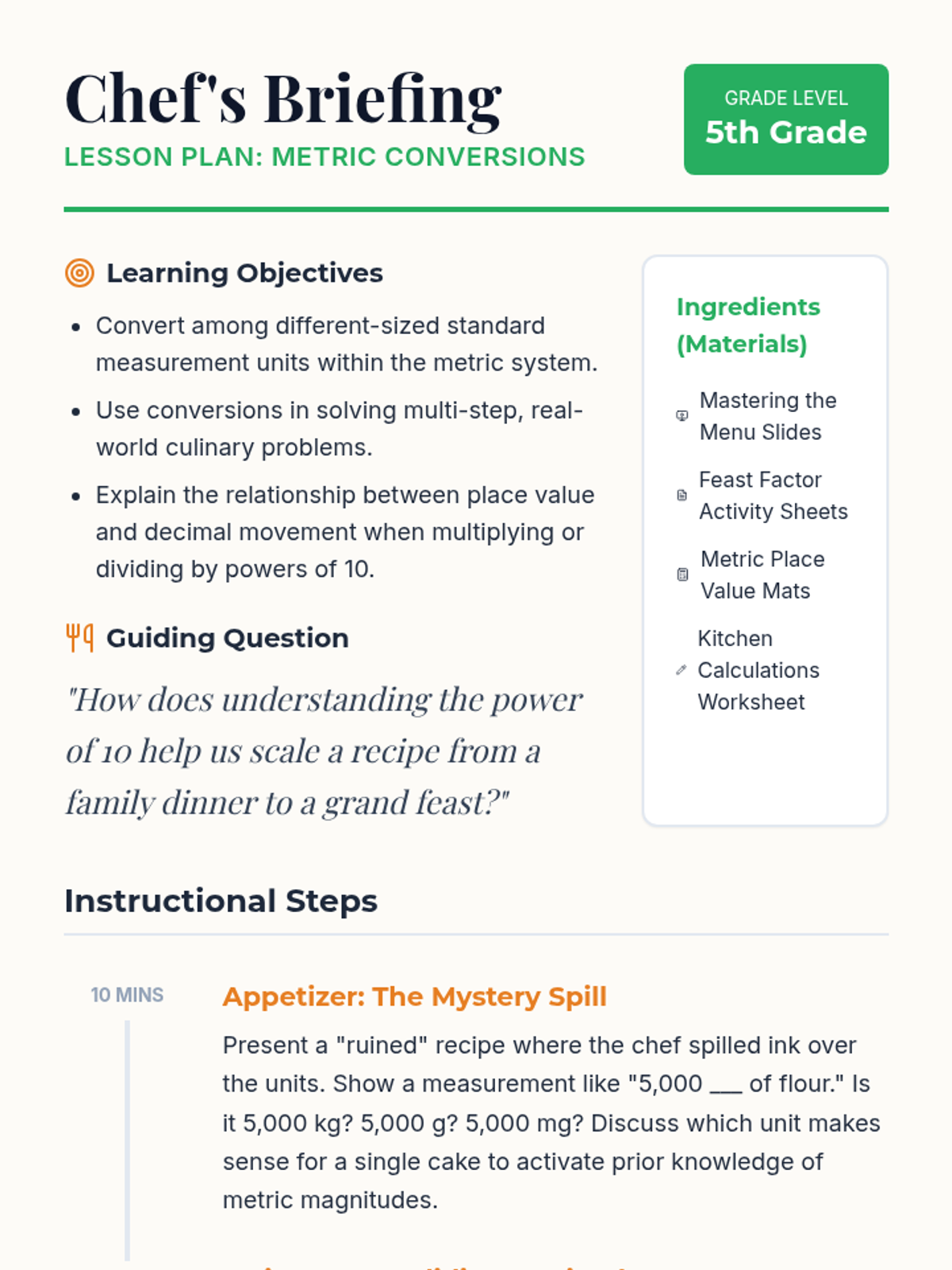 A hands-on math lesson where students master metric conversions (mass, volume, and length) by scaling and adjusting recipes for a grand class feast. Students apply decimal movement rules to transform ingredients from small kitchen measures to bulk quantities.