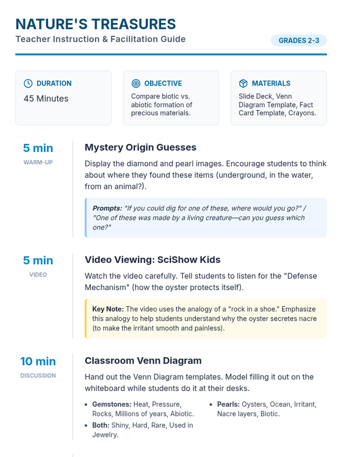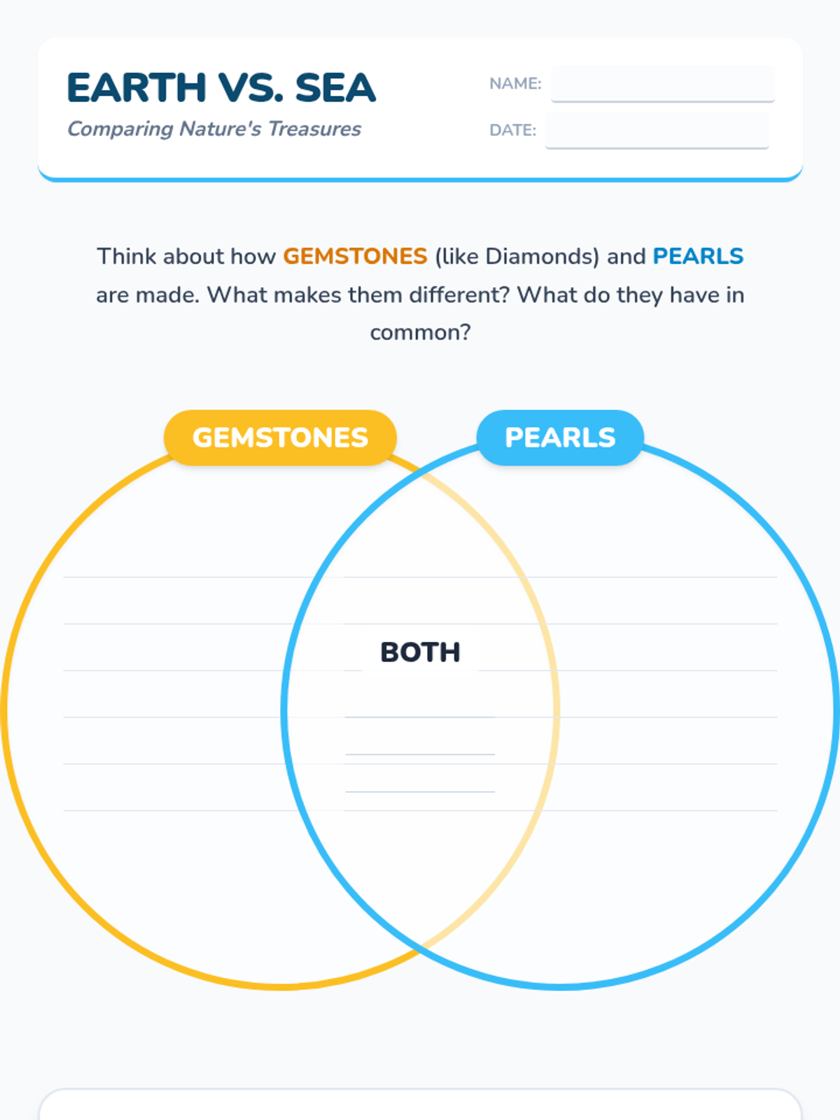 Students will explore how precious materials are formed, comparing the abiotic (non-living) process of diamonds and the biotic (living) process of pearls. This lesson uses a SciShow Kids video to help students understand the defense mechanism of oysters and the concept of nacre.