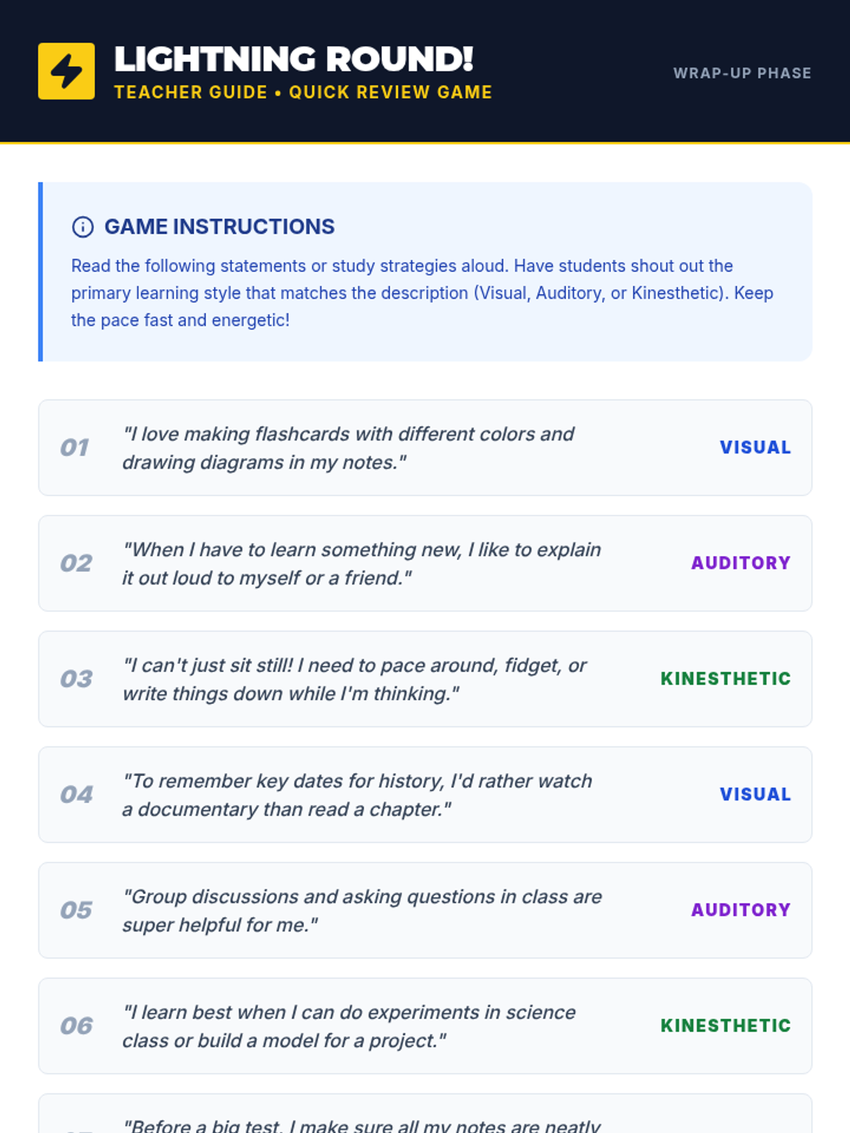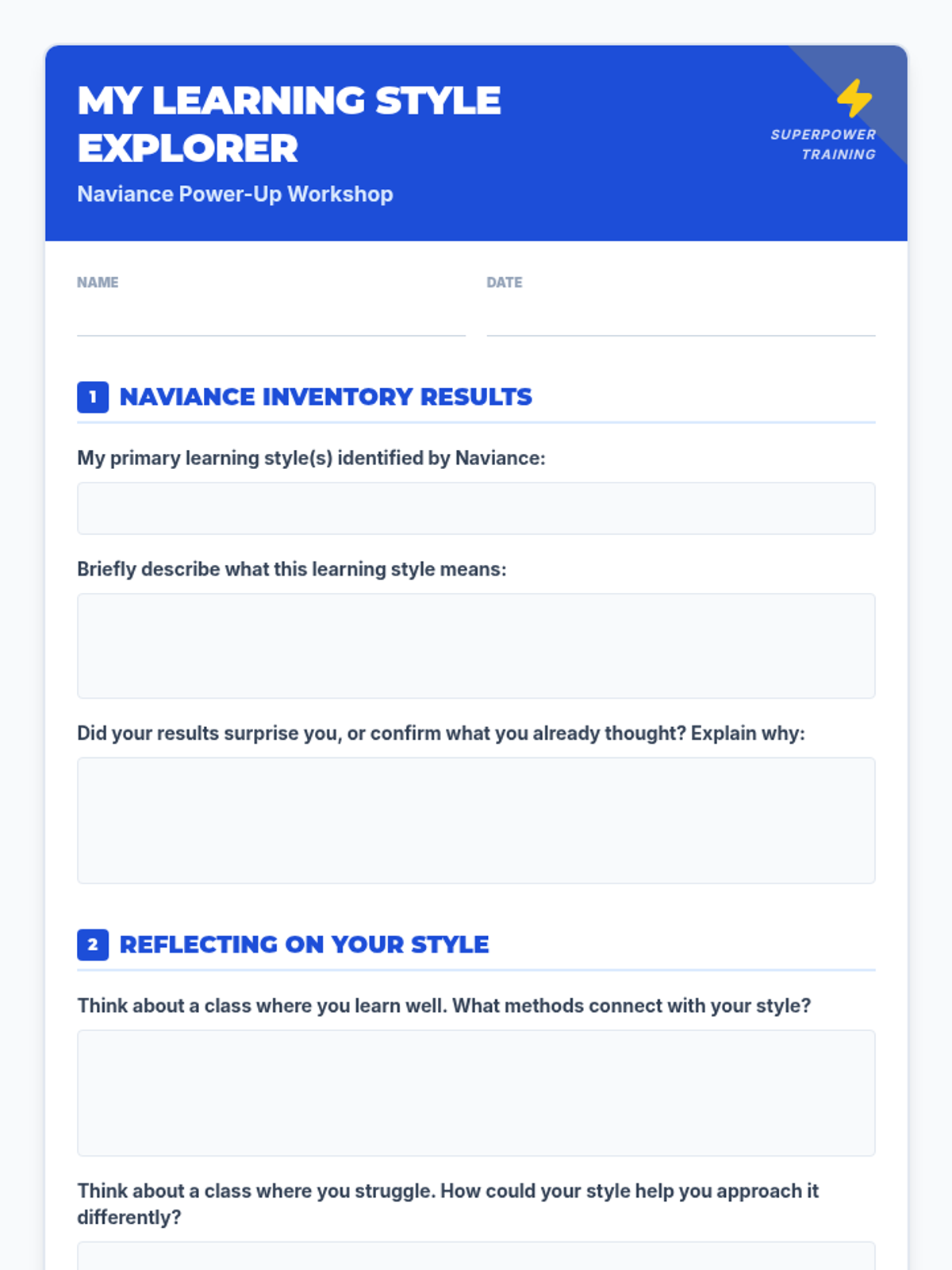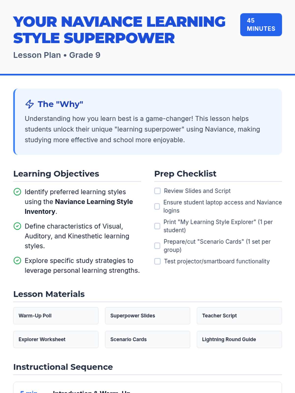 This 45-minute lesson empowers 9th-grade students to discover their unique learning styles using Naviance, providing them with practical strategies to "superpower" their academic success. Students will engage in self-assessment, collaborative scenario analysis, and a fast-paced review game.