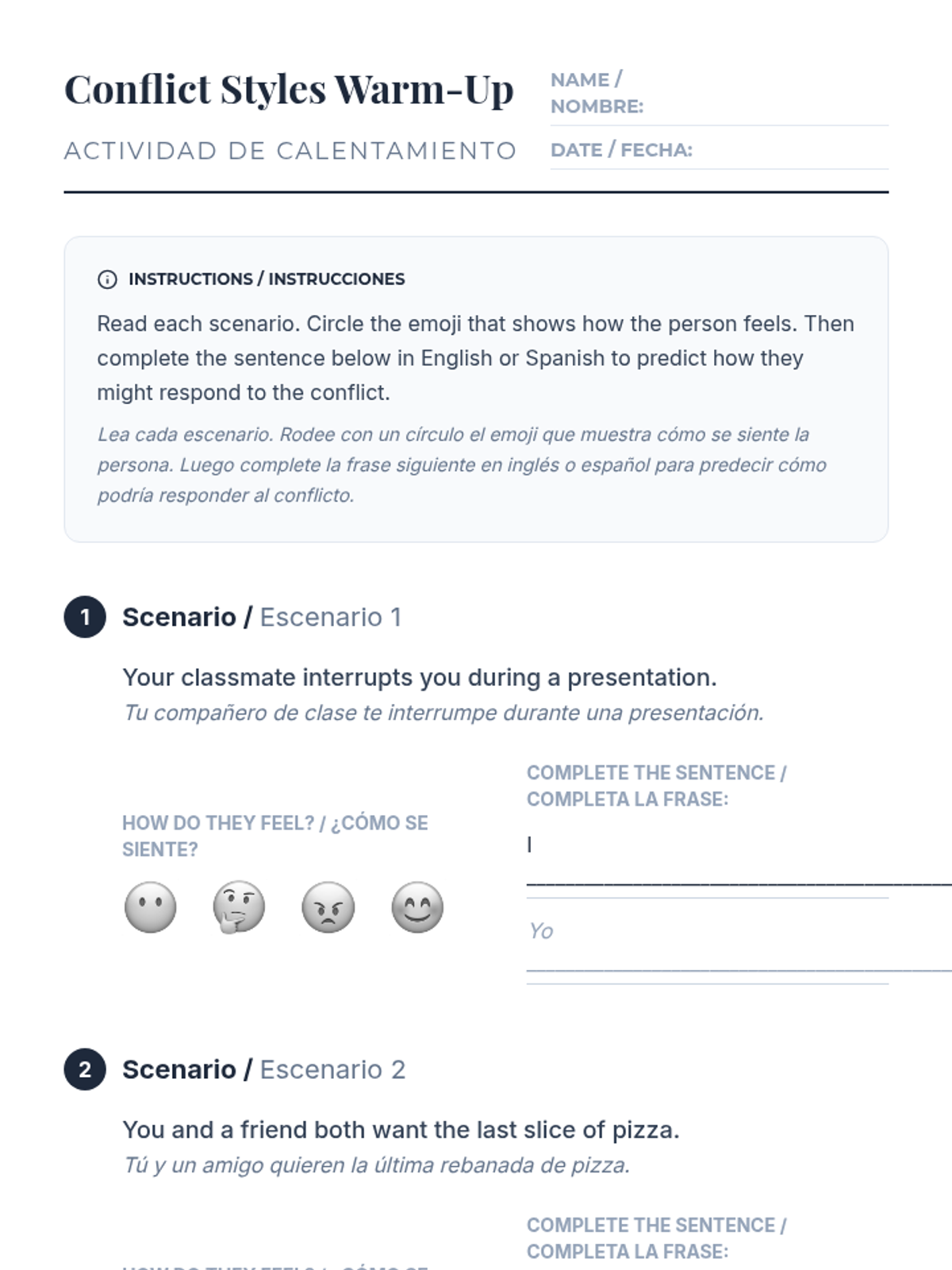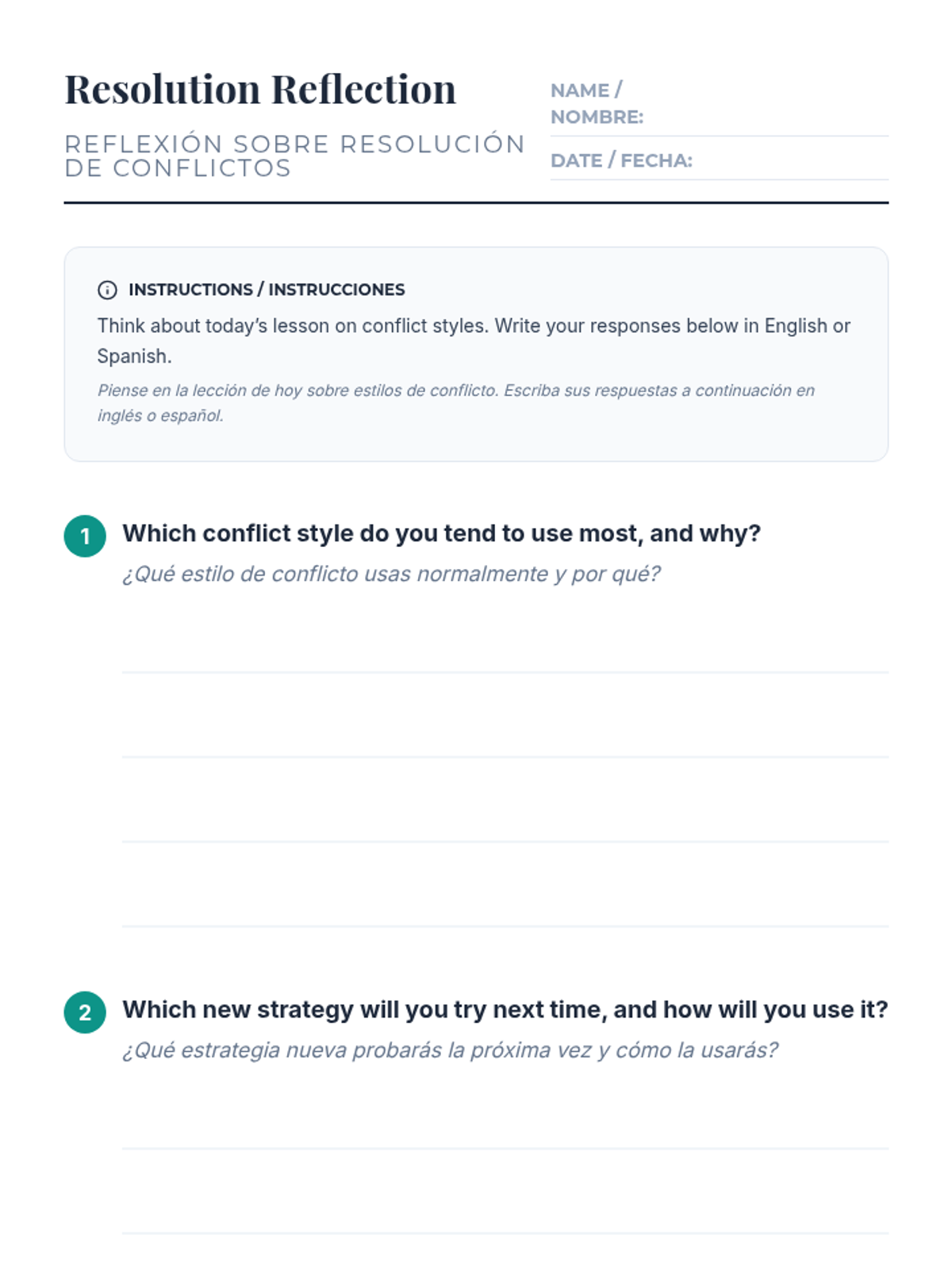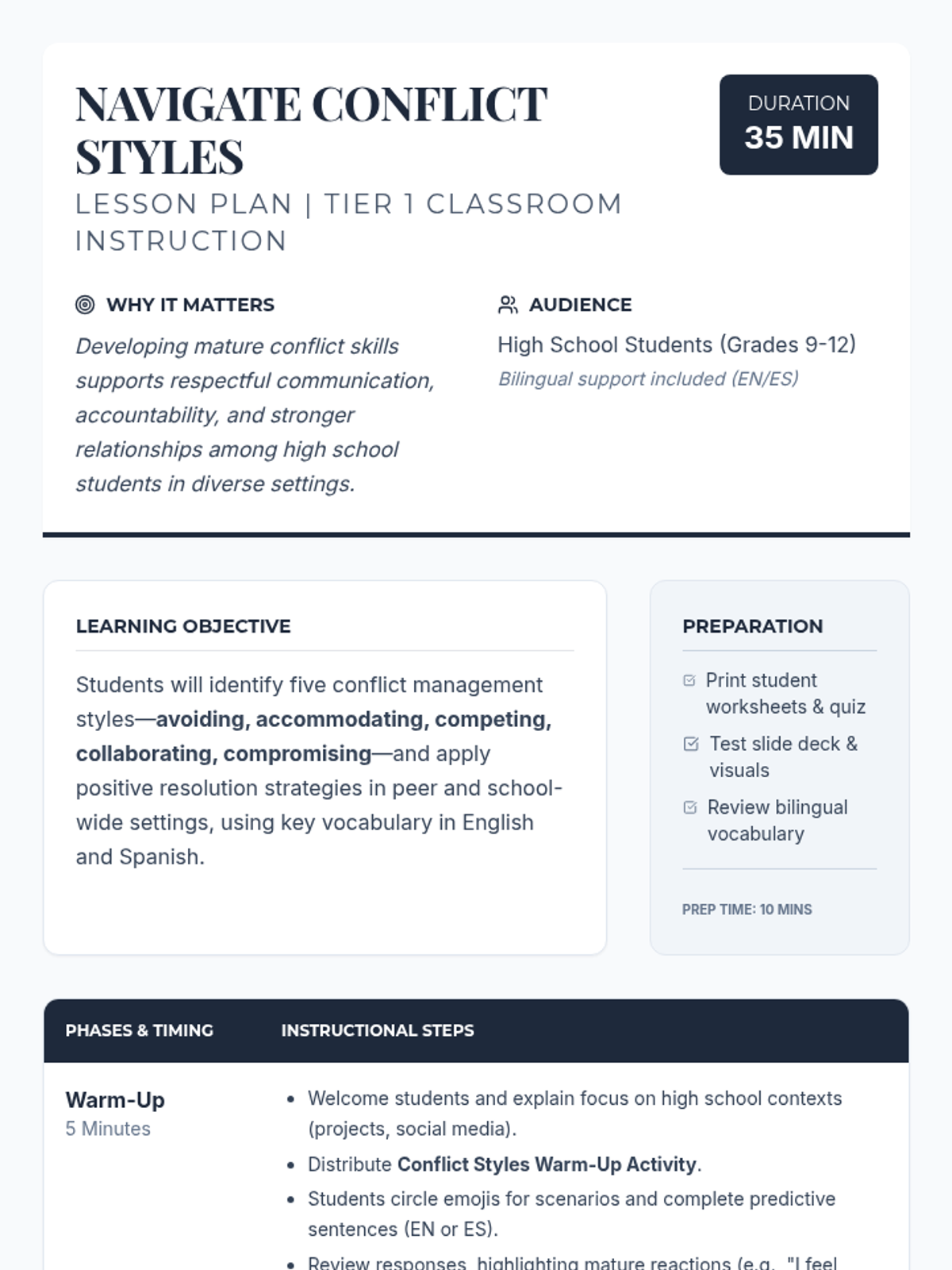 A 35-minute Tier 1 lesson for high school students to identify five conflict management styles and apply positive resolution strategies. This lesson features bilingual support in English and Spanish to engage all learners.