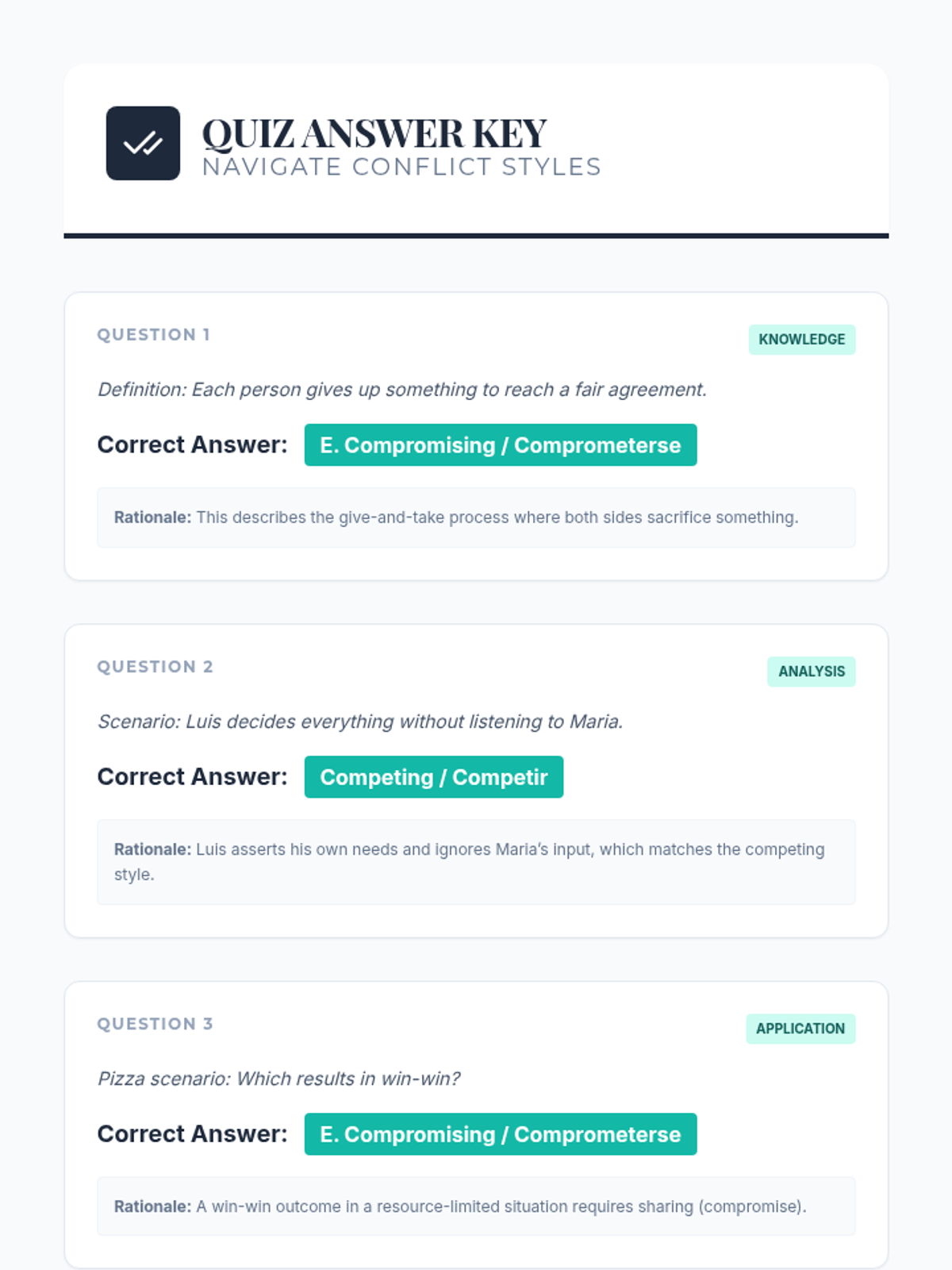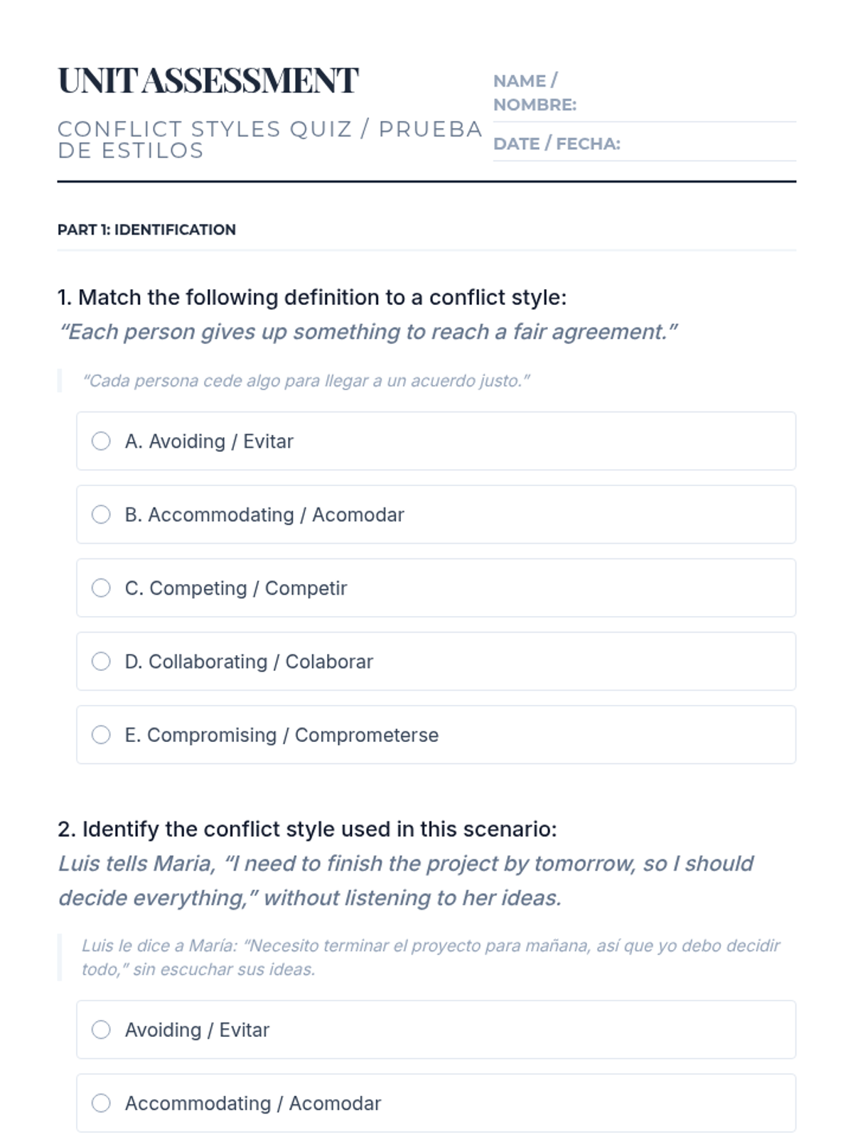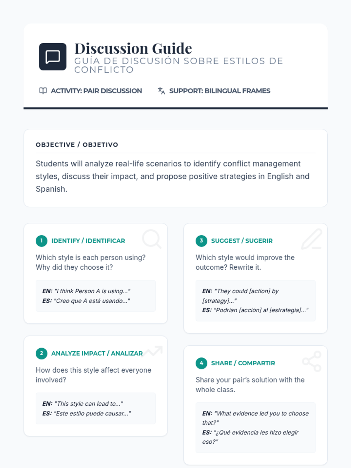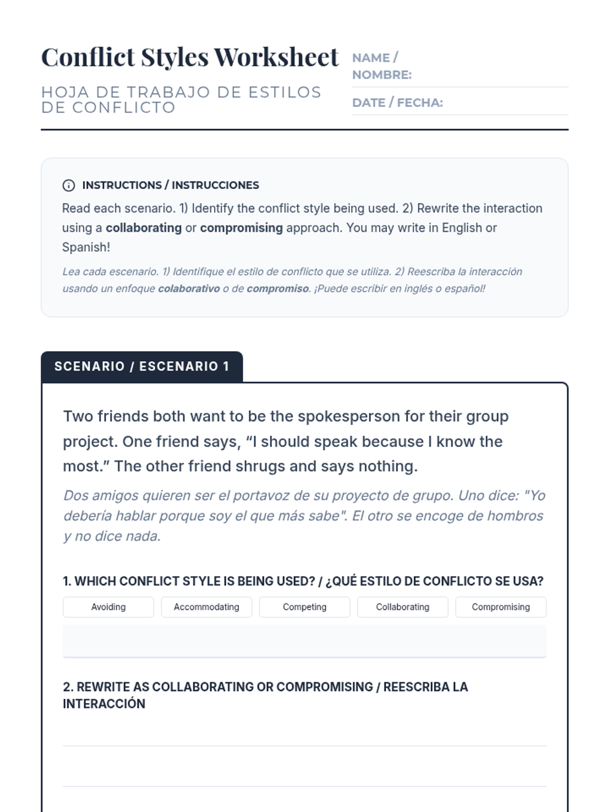 A 35-minute Tier 1 lesson for high school students to identify five conflict management styles and apply positive resolution strategies. This lesson features bilingual support in English and Spanish to engage all learners.