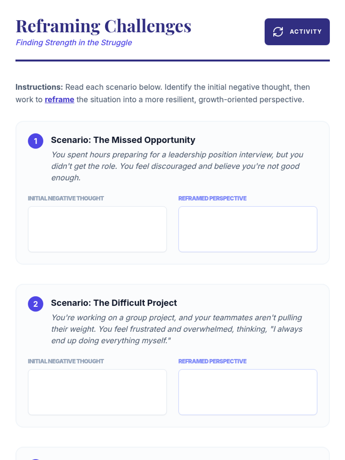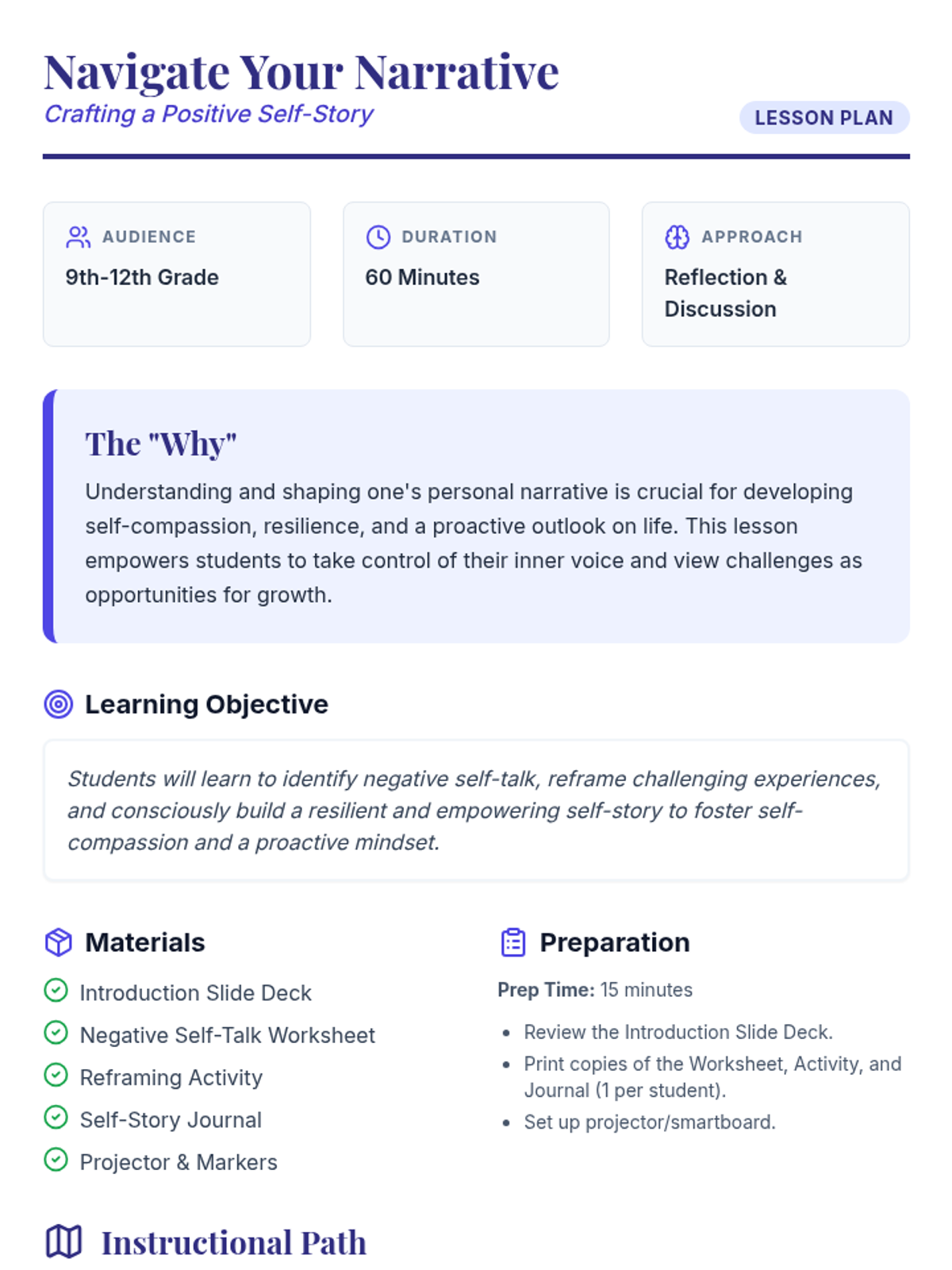 A 60-minute lesson for high schoolers on identifying negative self-talk, reframing challenges, and consciously crafting an empowering personal narrative to build resilience.