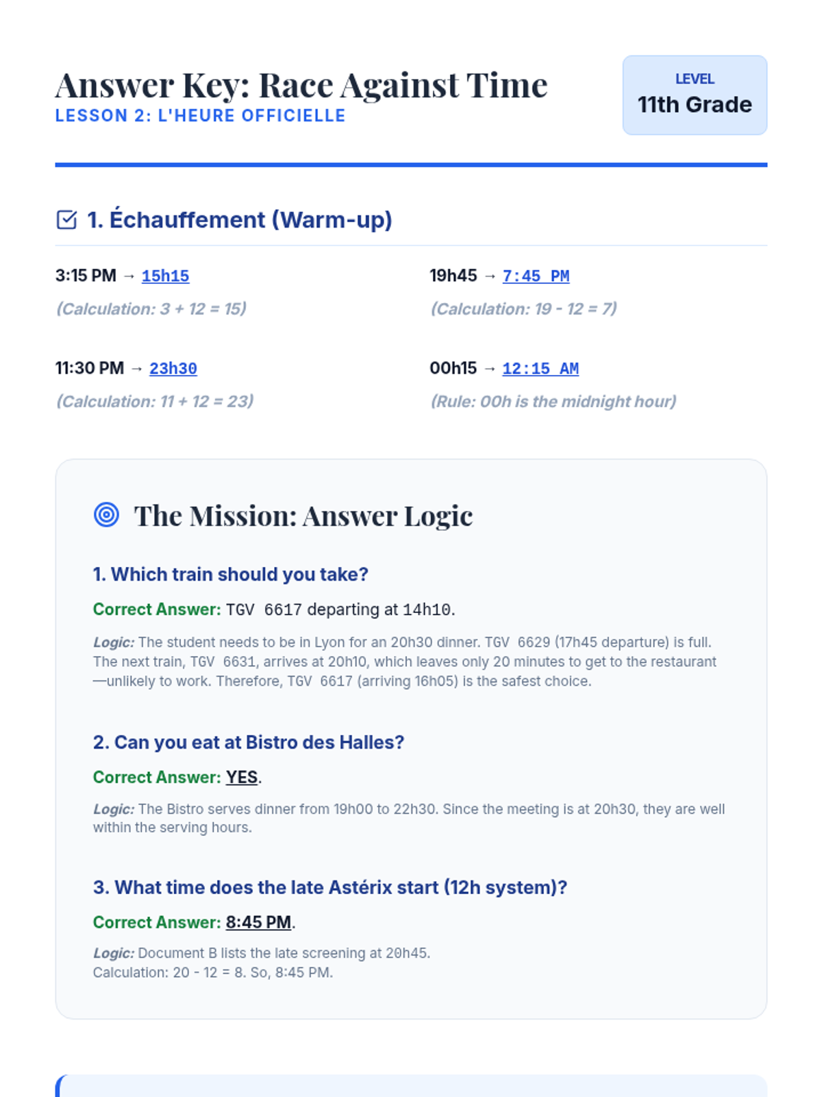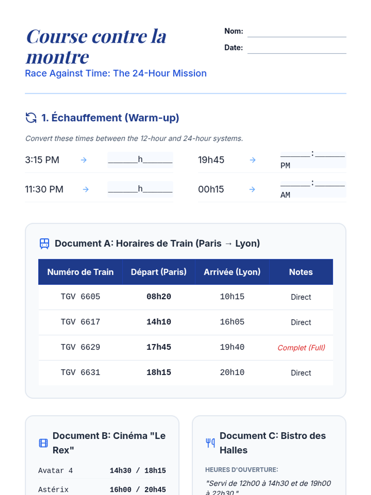 Mastery of the 24-hour clock (l'heure officielle) through authentic schedules and travel planning.