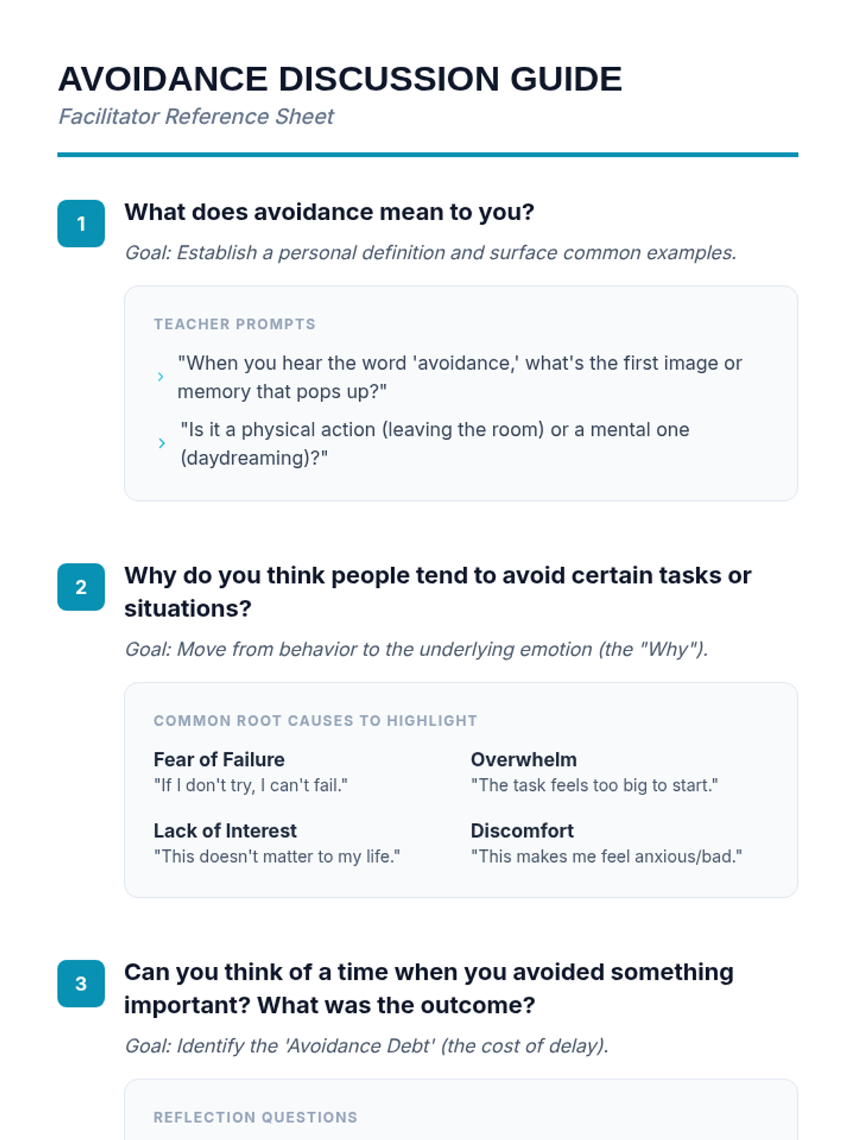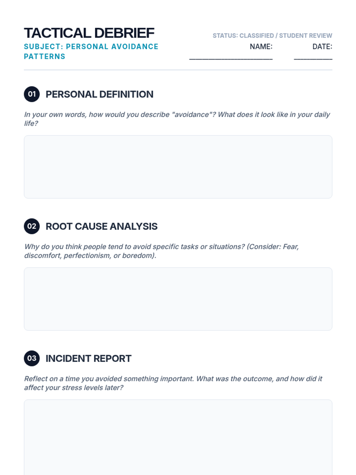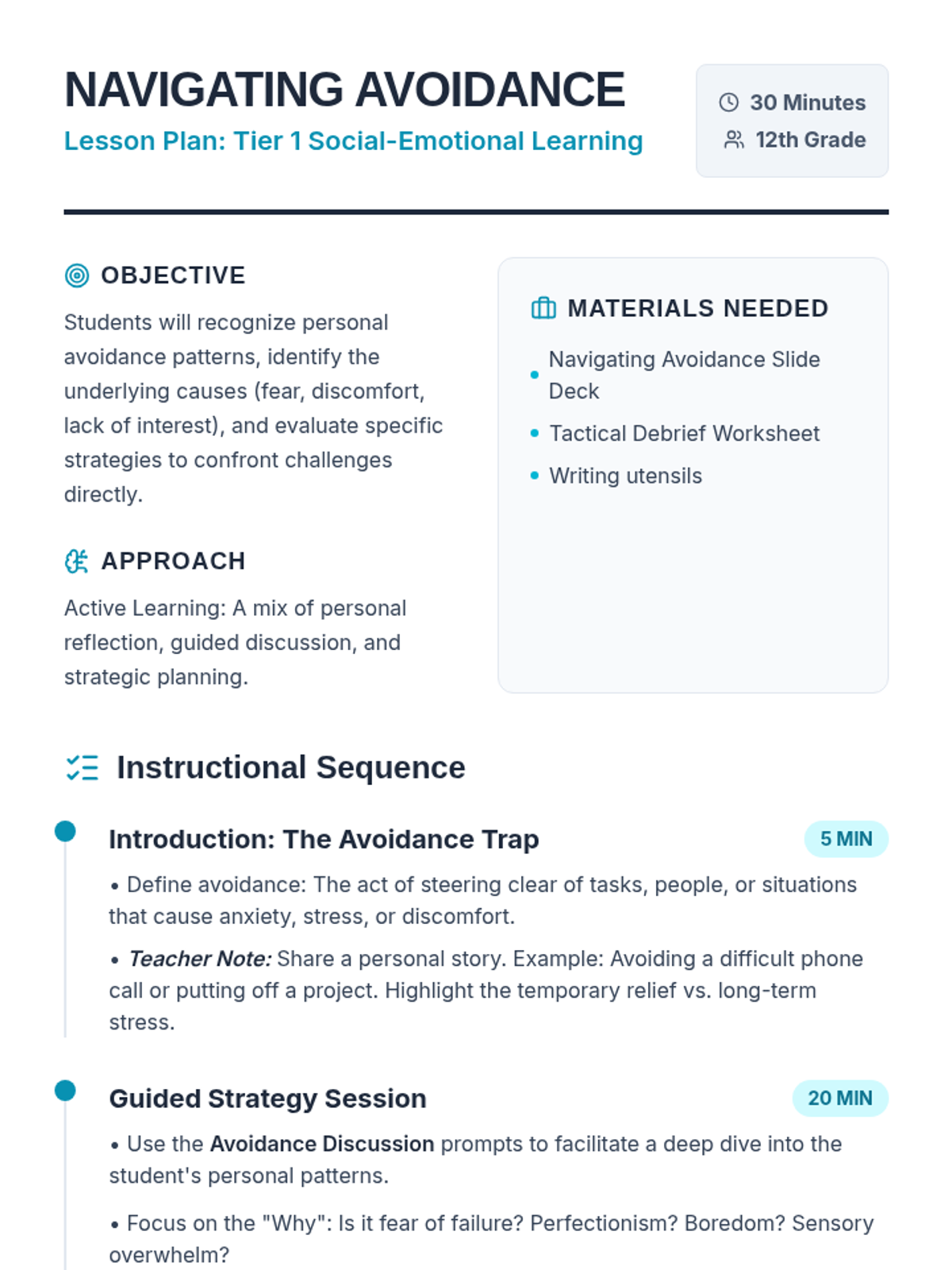 A 30-minute lesson designed for 12th-grade students to identify avoidance patterns and develop practical strategies for confronting challenges directly.