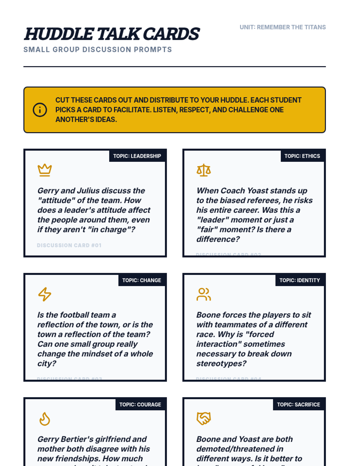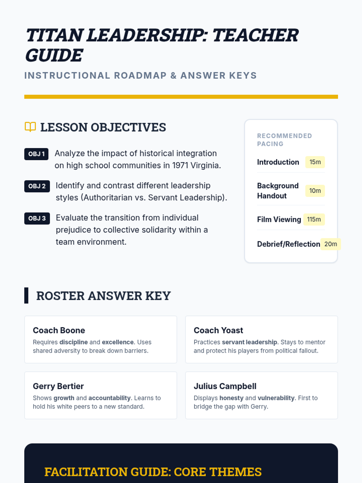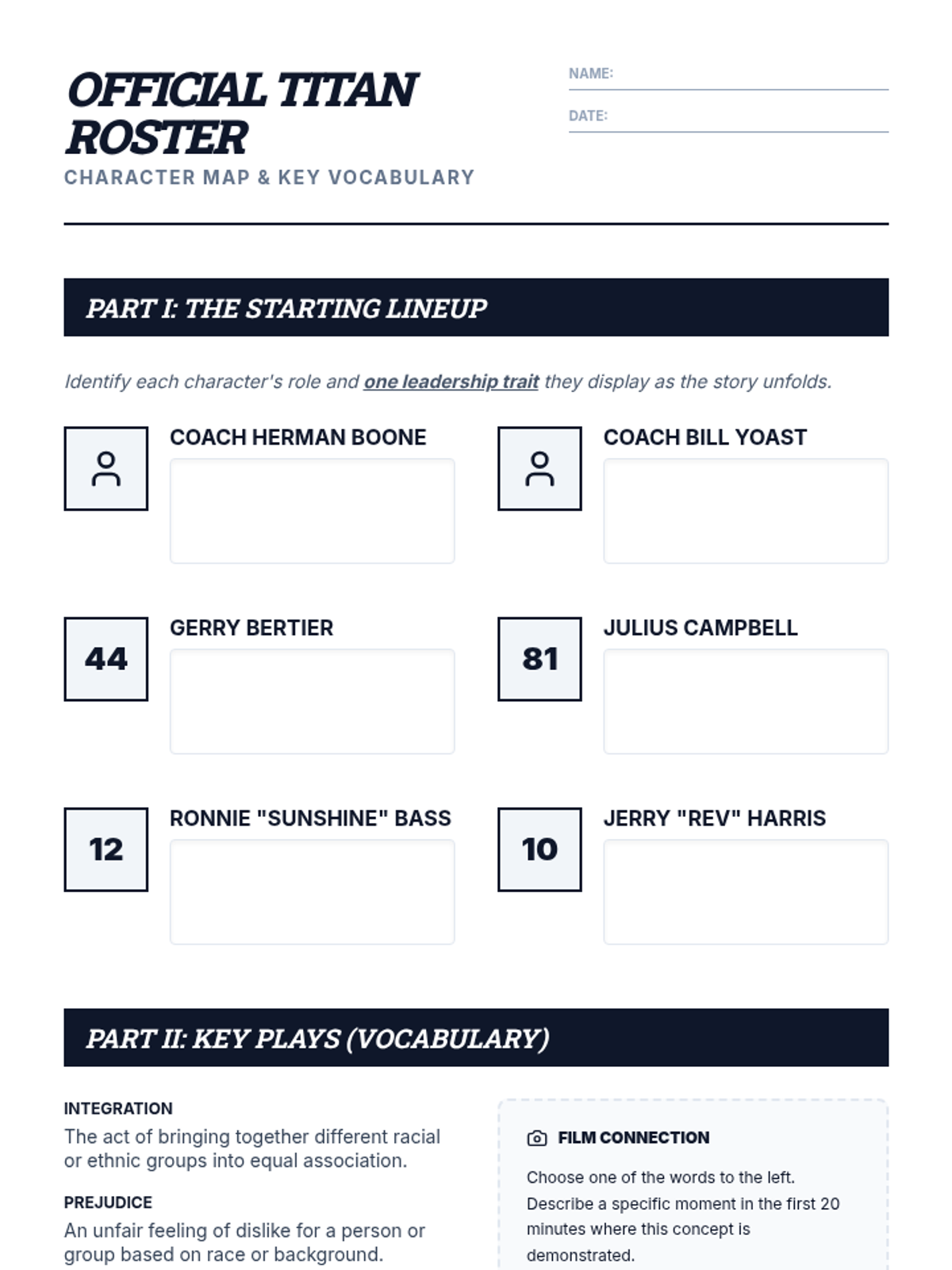 A lesson exploring the themes of leadership, racial integration, and conflict resolution through the film Remember the Titans. Students analyze character development and the historical context of 1971 Alexandria, Virginia.