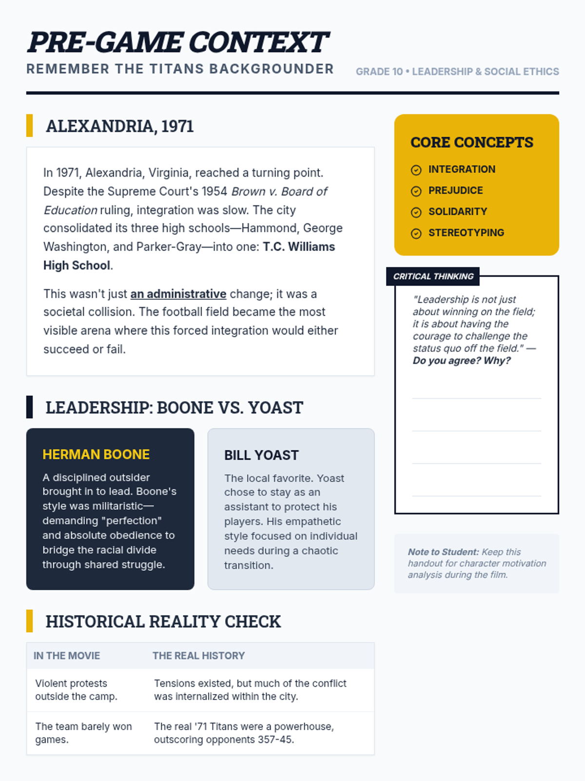 An introductory exploration of the historical and social themes in the film Remember the Titans, focusing on the 1971 integration of T.C. Williams High School and the leadership required to build a unified team.