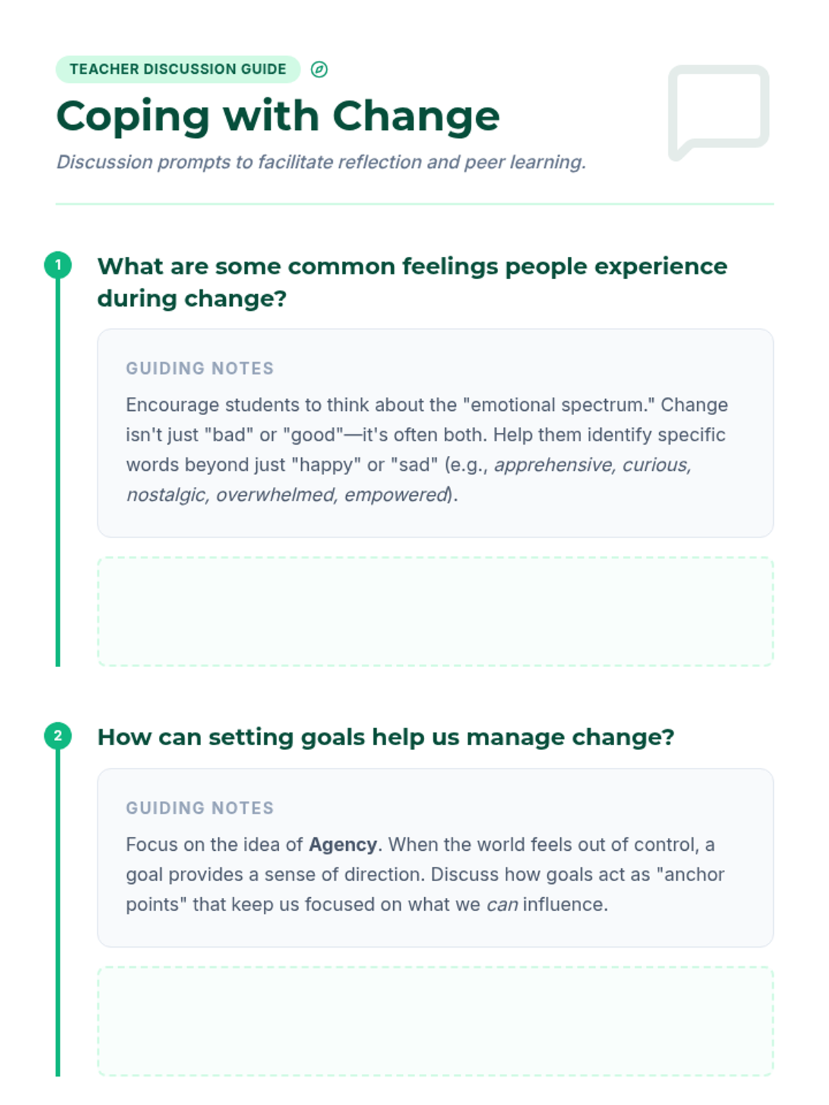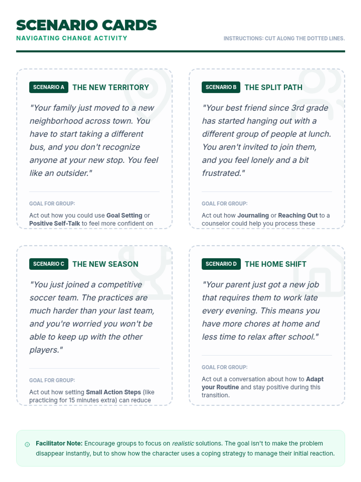 This lesson helps 7th-grade students navigate change and transition by introducing strategies like goal setting and journaling. Through role-playing activities, students will prepare to handle real-life changes effectively, fostering resilience and adaptability.