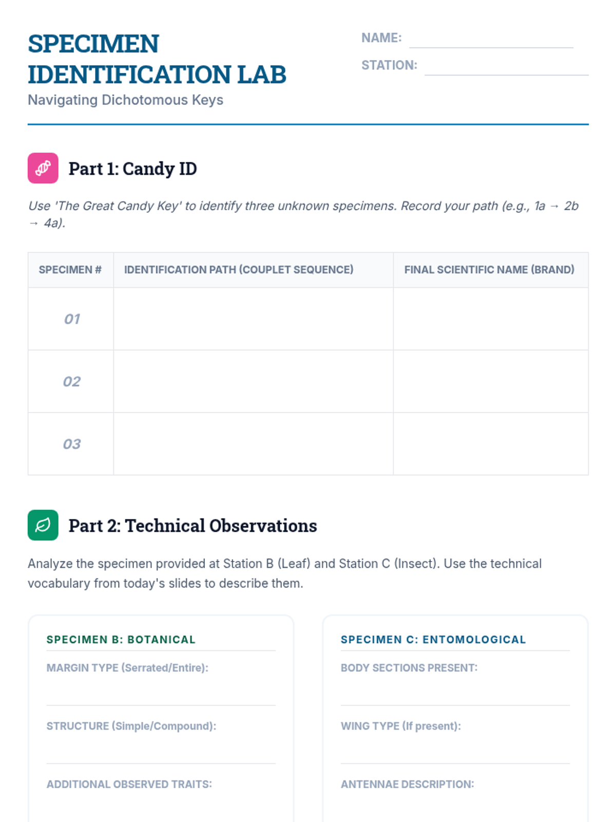 Students practice using professional keys to identify specimens, focusing on technical vocabulary and precise observation.