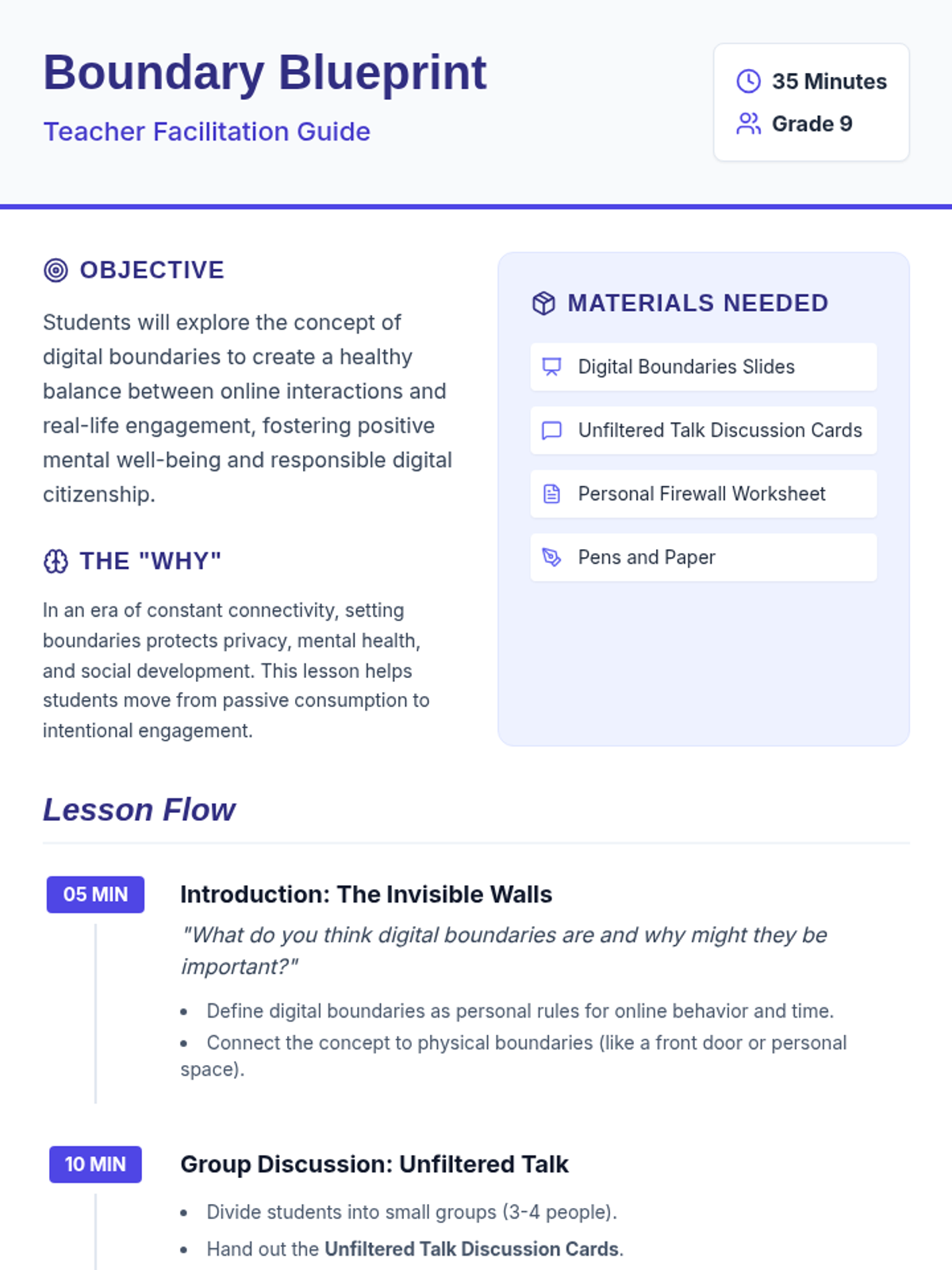 A lesson for 9th-grade students to explore digital boundaries, screen time balance, and online etiquette to promote mental well-being and responsible citizenship.