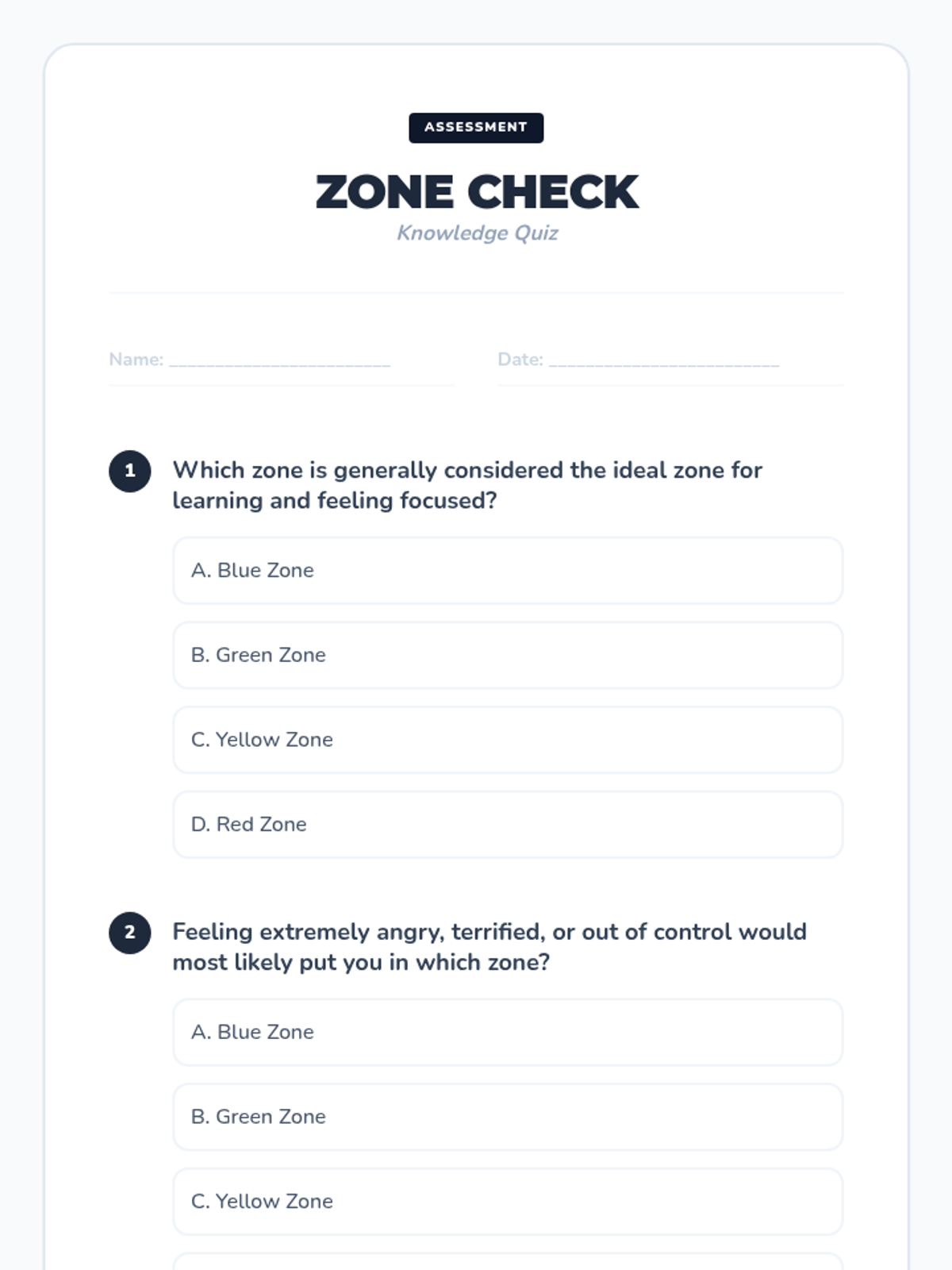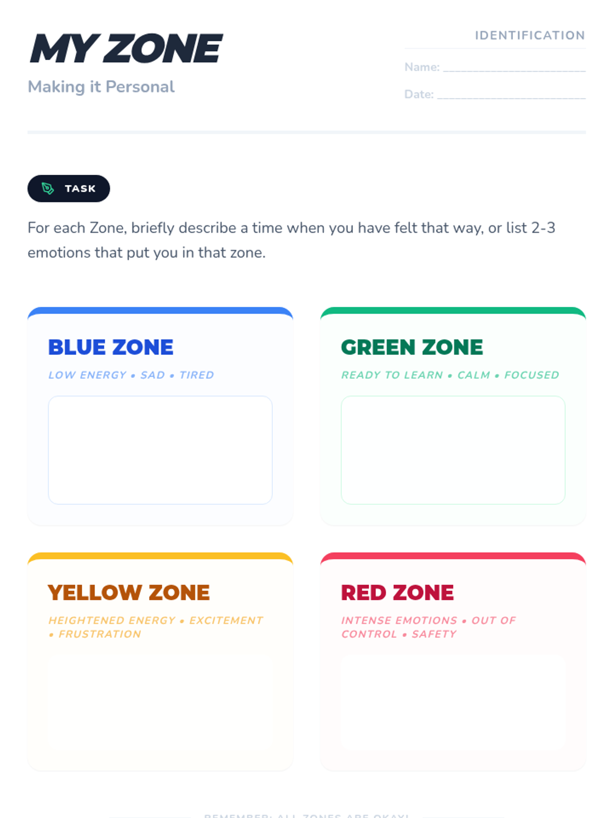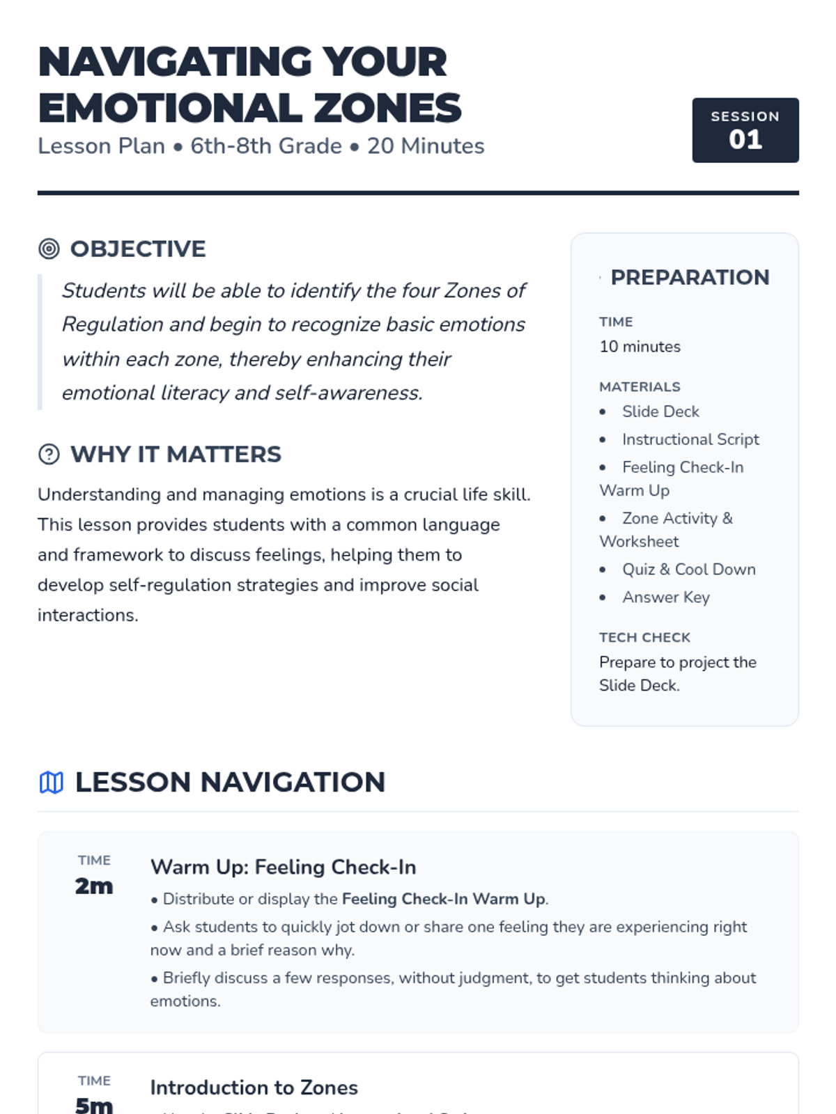 A 20-minute lesson introducing 6th-8th graders to the Zones of Regulation framework to improve emotional self-awareness and self-management.