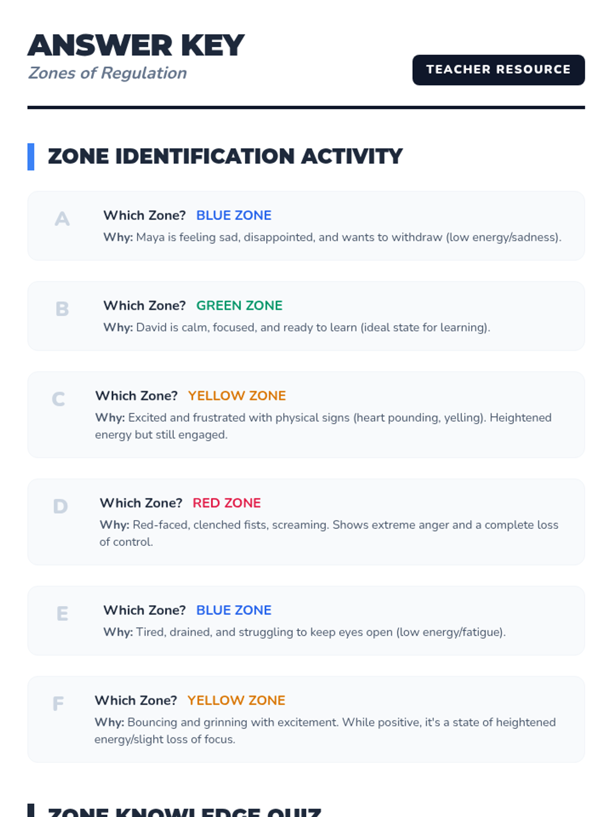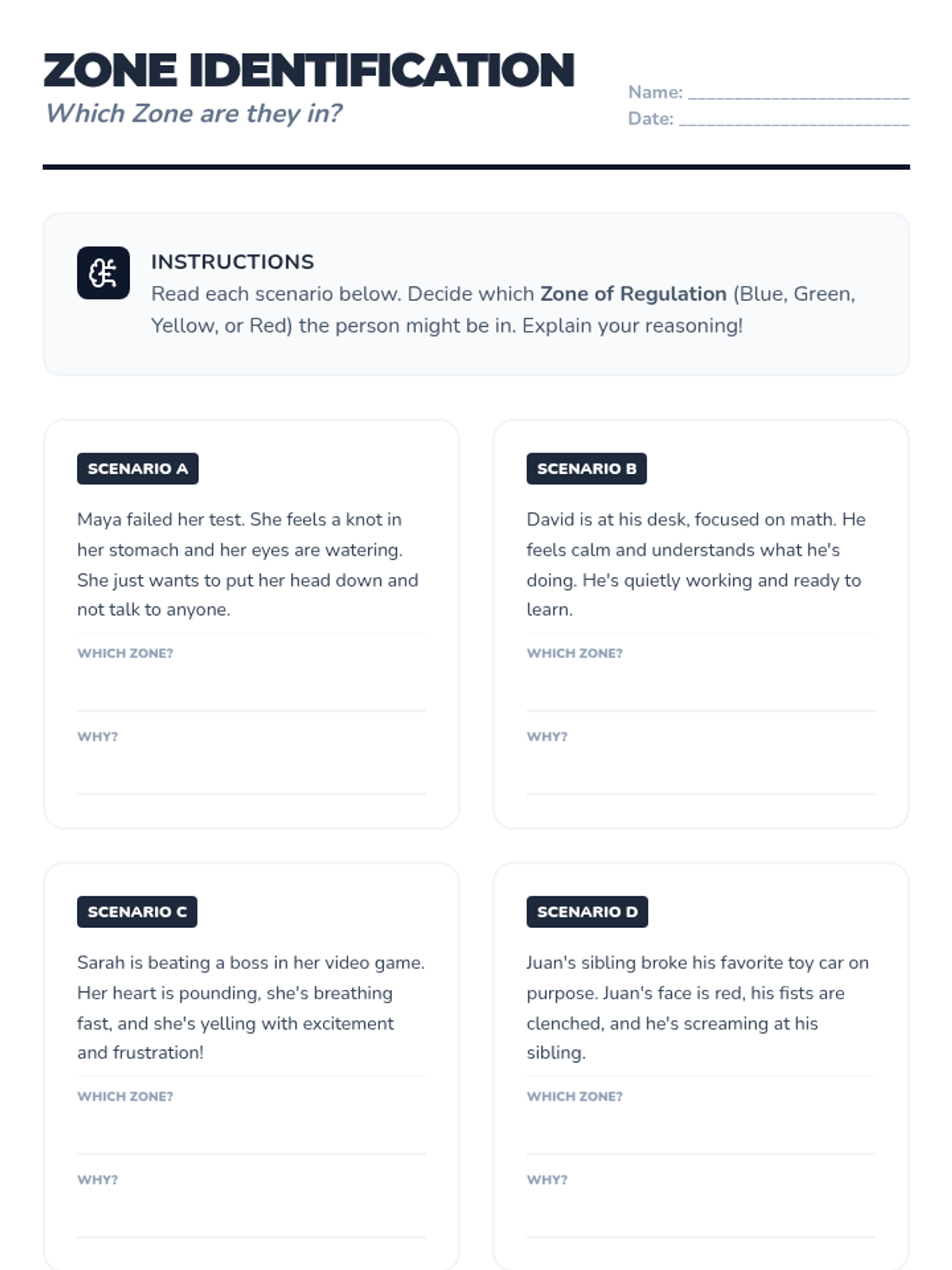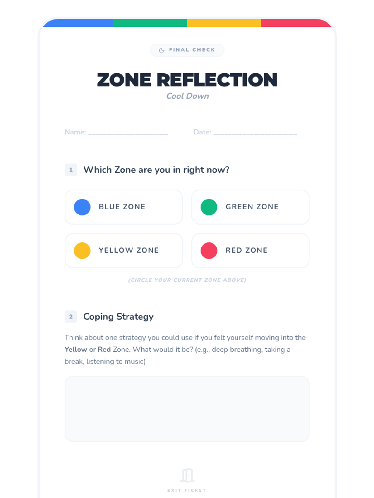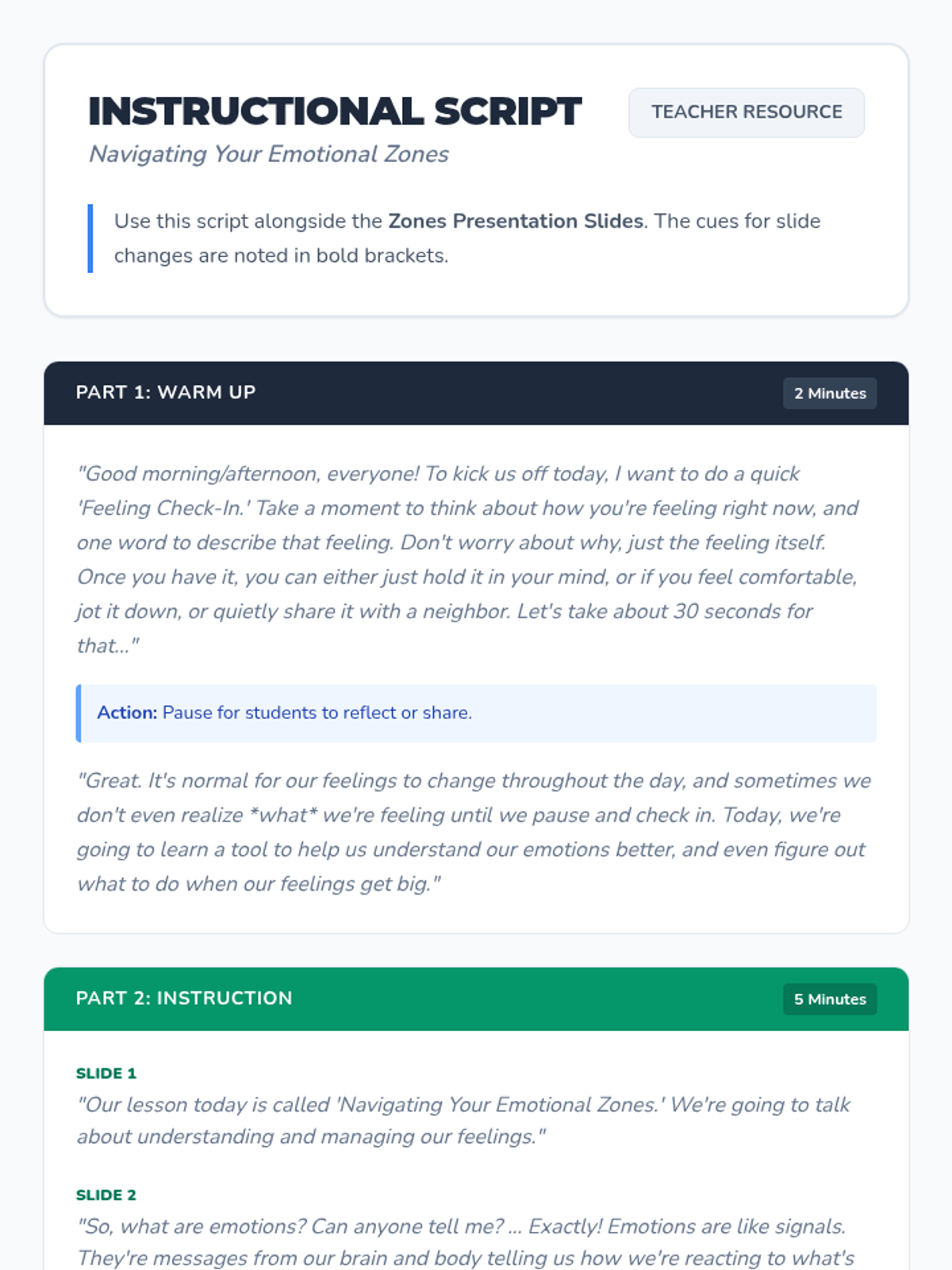 A 20-minute lesson introducing 6th-8th graders to the Zones of Regulation framework to improve emotional self-awareness and self-management.