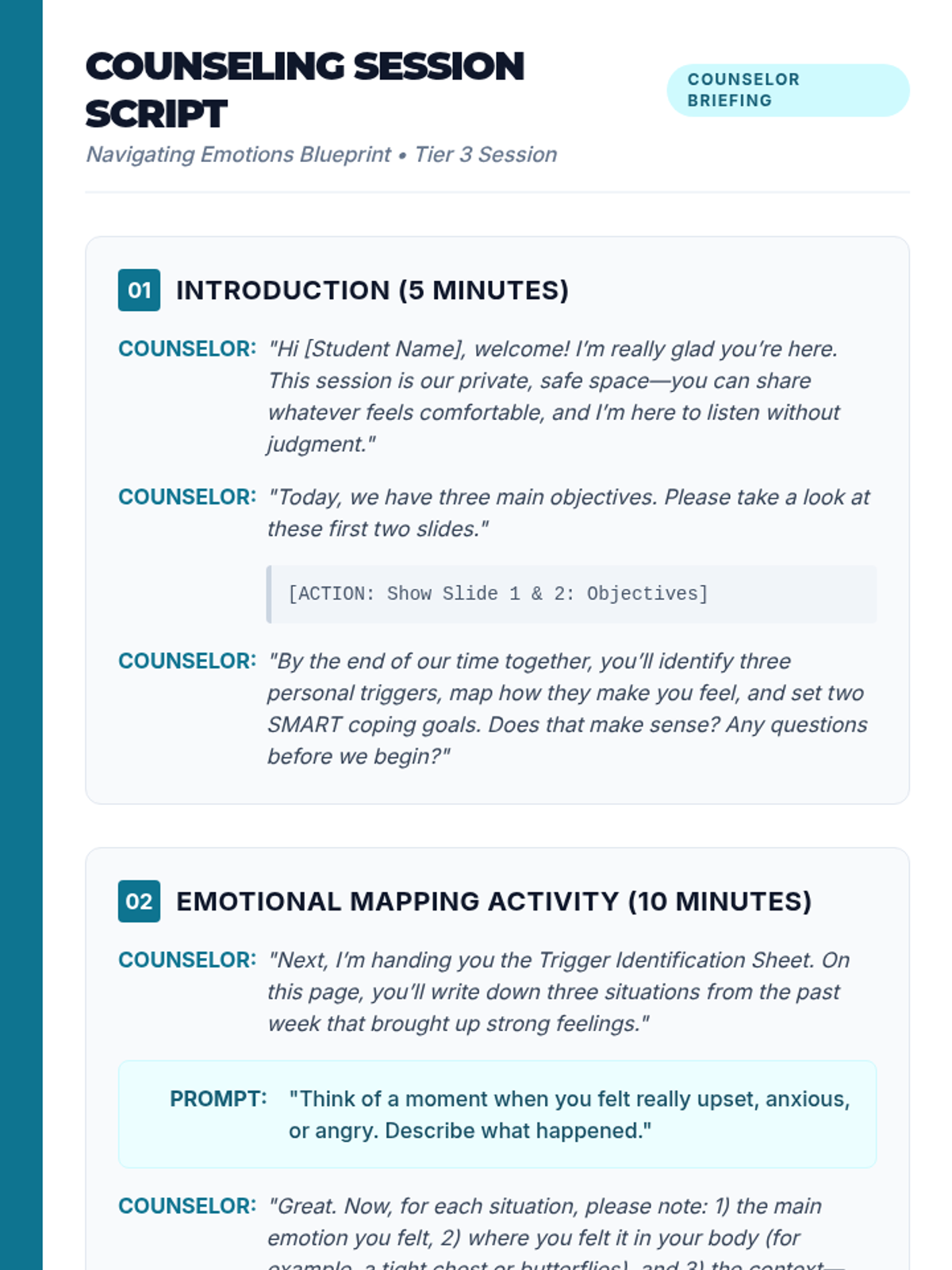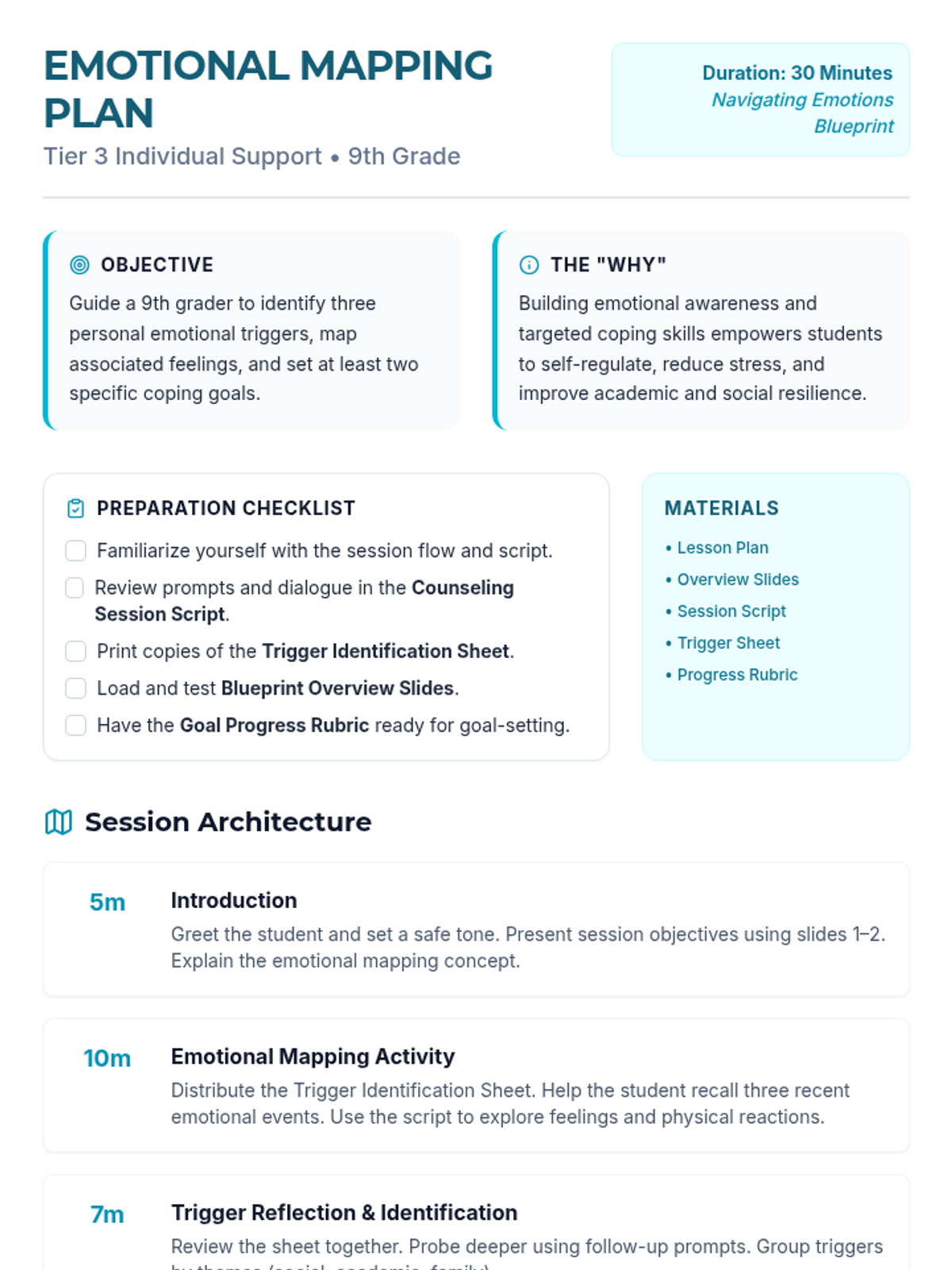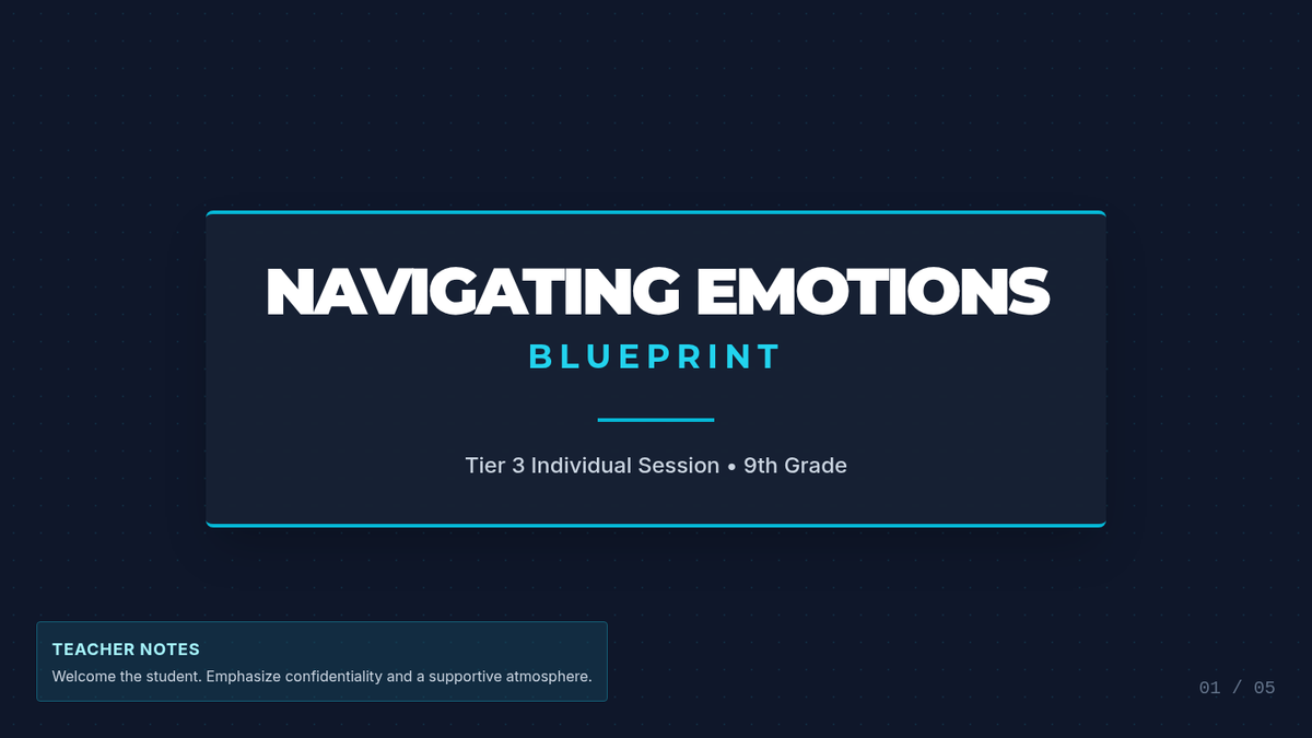 An individualized Tier 3 session plan for 9th-grade students focused on identifying emotional triggers, mapping physical and emotional responses, and setting SMART coping goals. This session uses a 'blueprint' theme to help students build a structural understanding of their own emotional regulation.