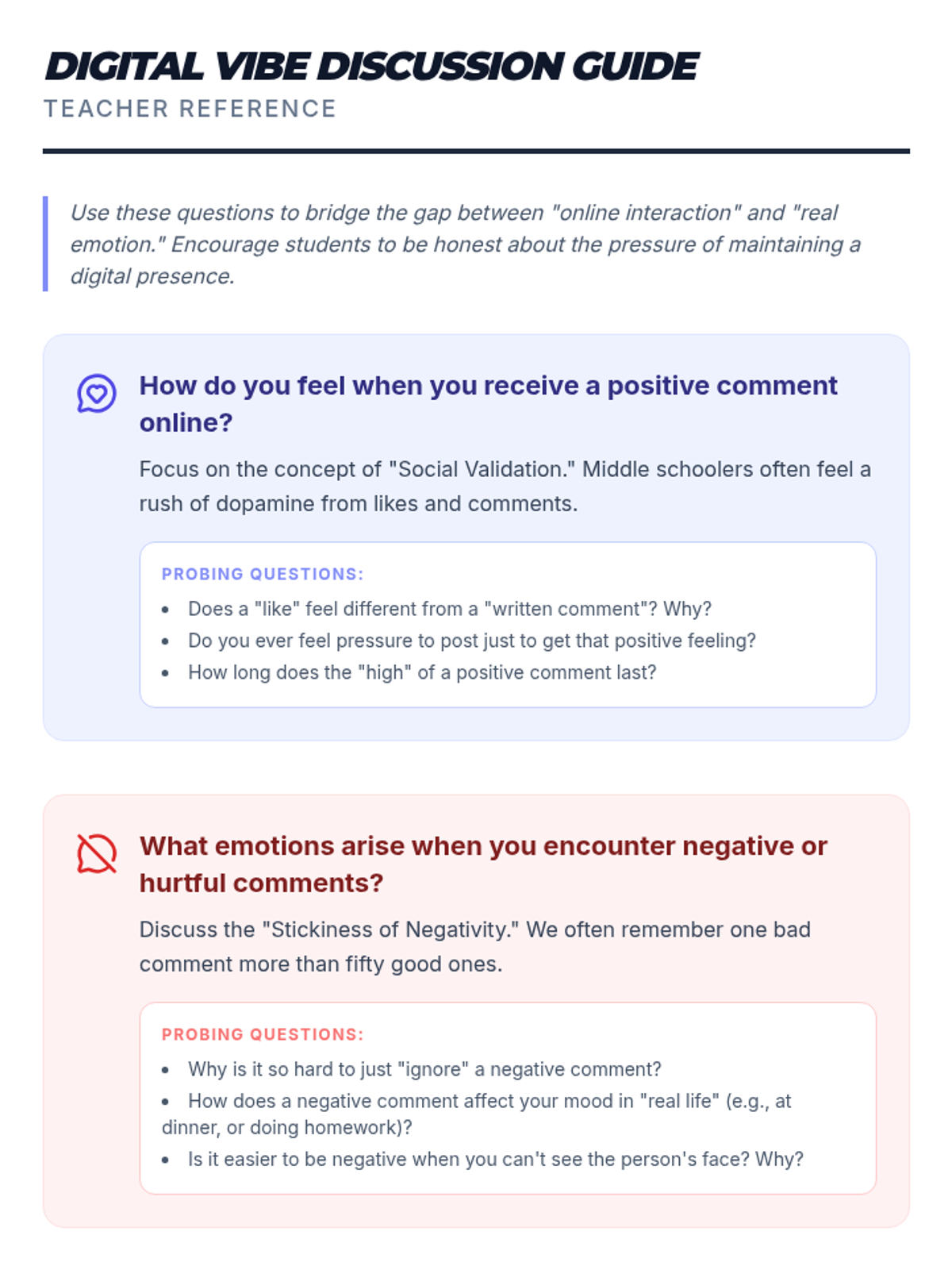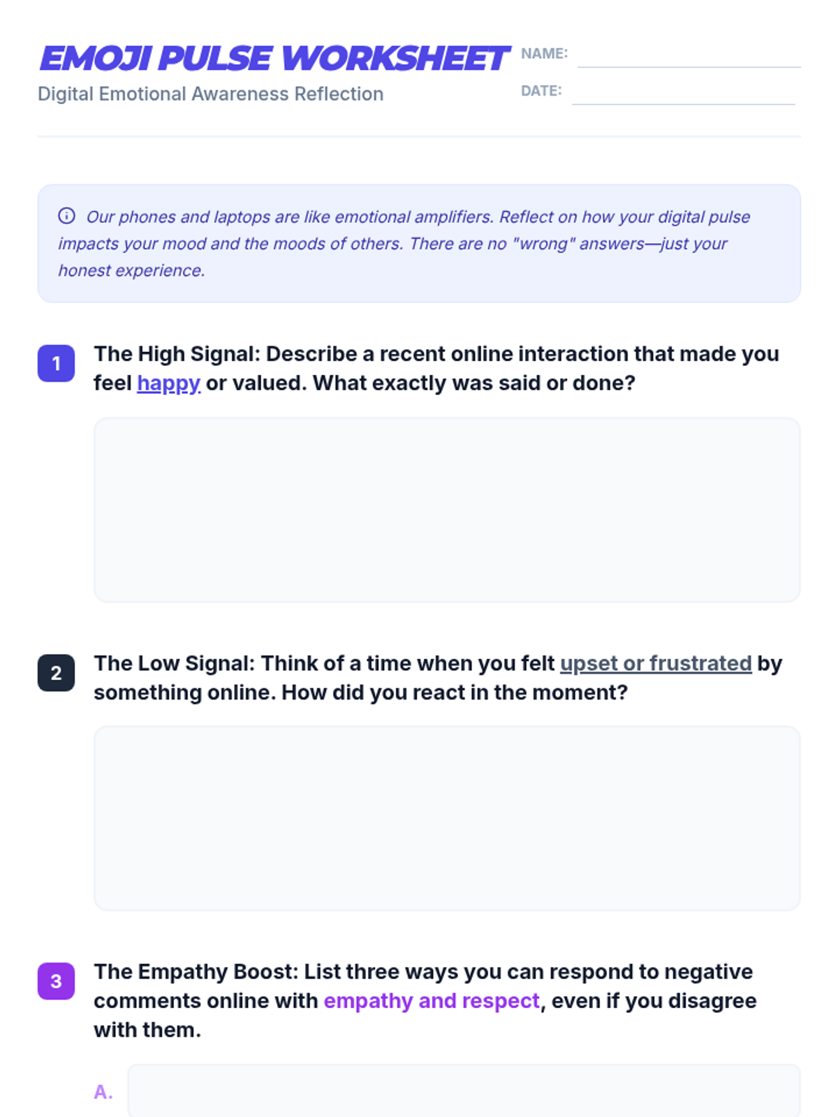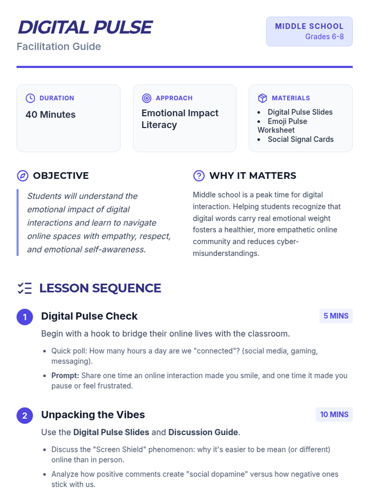 This lesson engages middle school students in understanding how digital interactions can affect emotions and the importance of navigating online spaces with empathy and respect. By focusing on emotional literacy, students will learn to recognize and manage their emotions in digital environments, fostering a healthier online community.