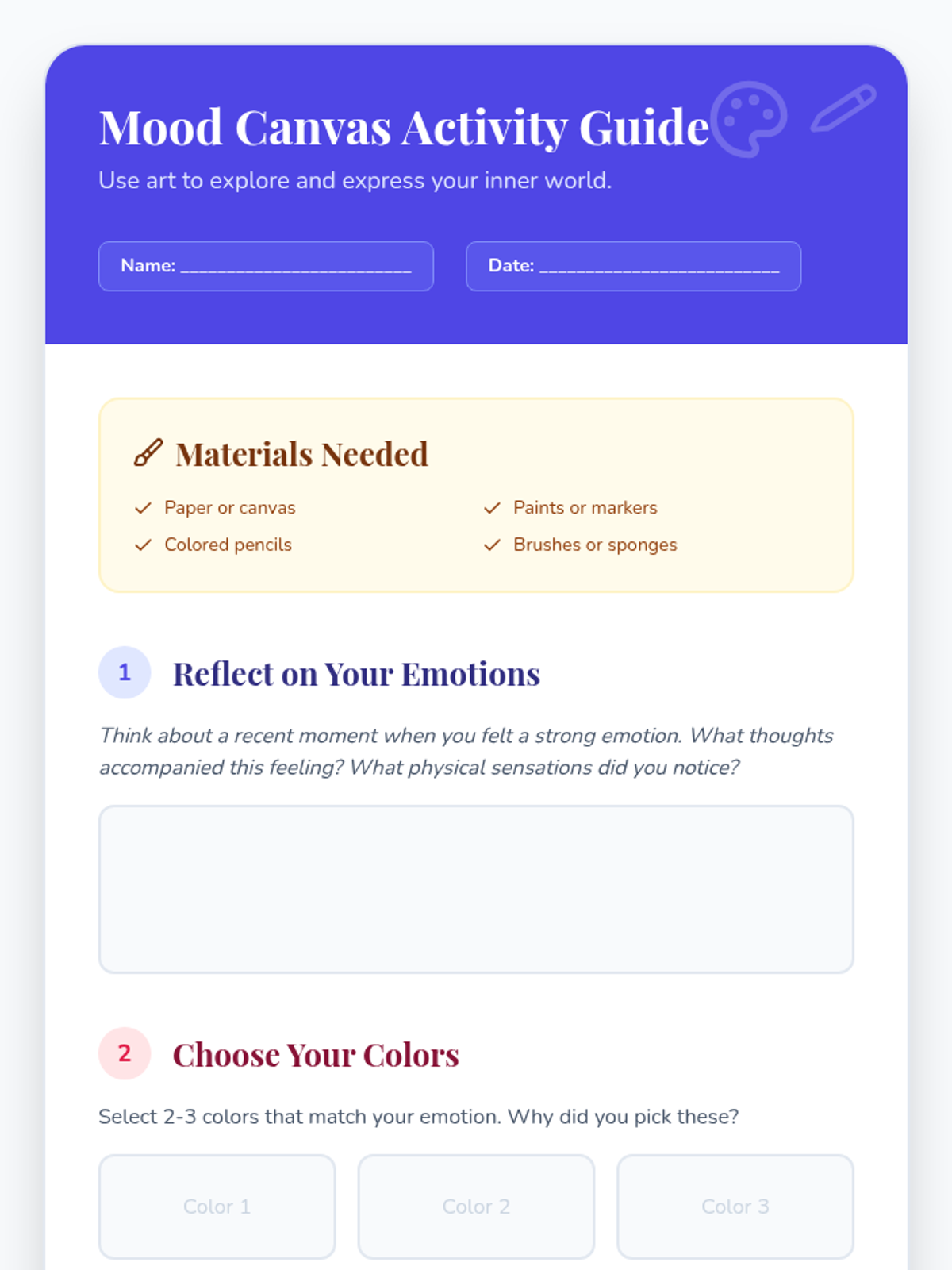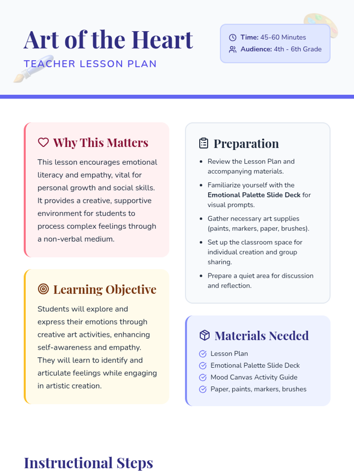 A creative lesson for 4th to 6th graders exploring emotional literacy through artistic expression, helping students process feelings and develop empathy.