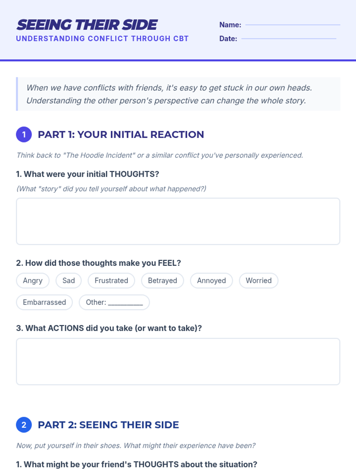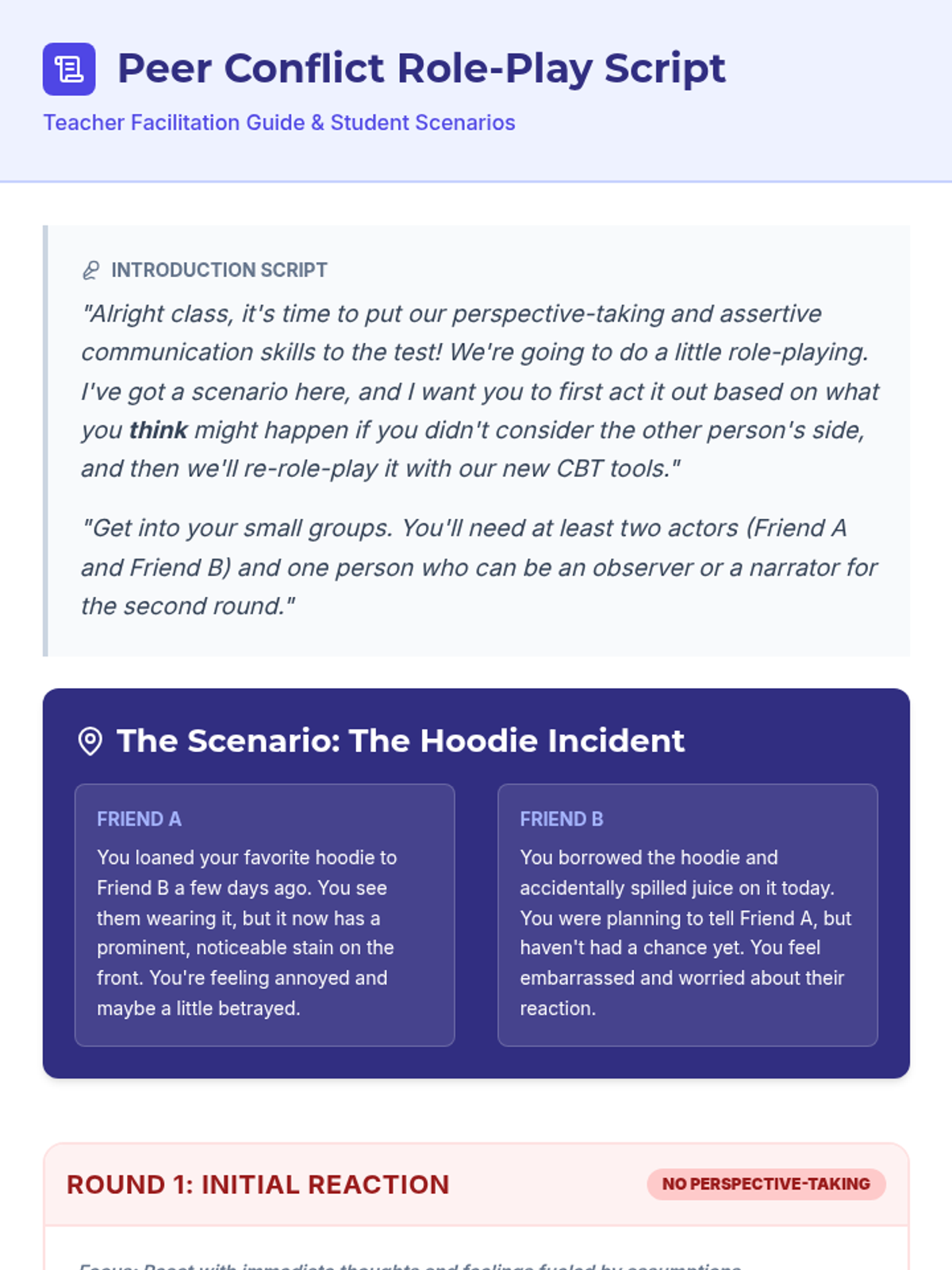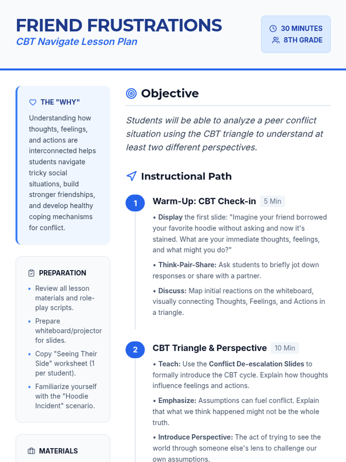 This 30-minute lesson for 8th-grade students helps them analyze peer conflicts using the CBT triangle, fostering perspective-taking and assertive communication skills.