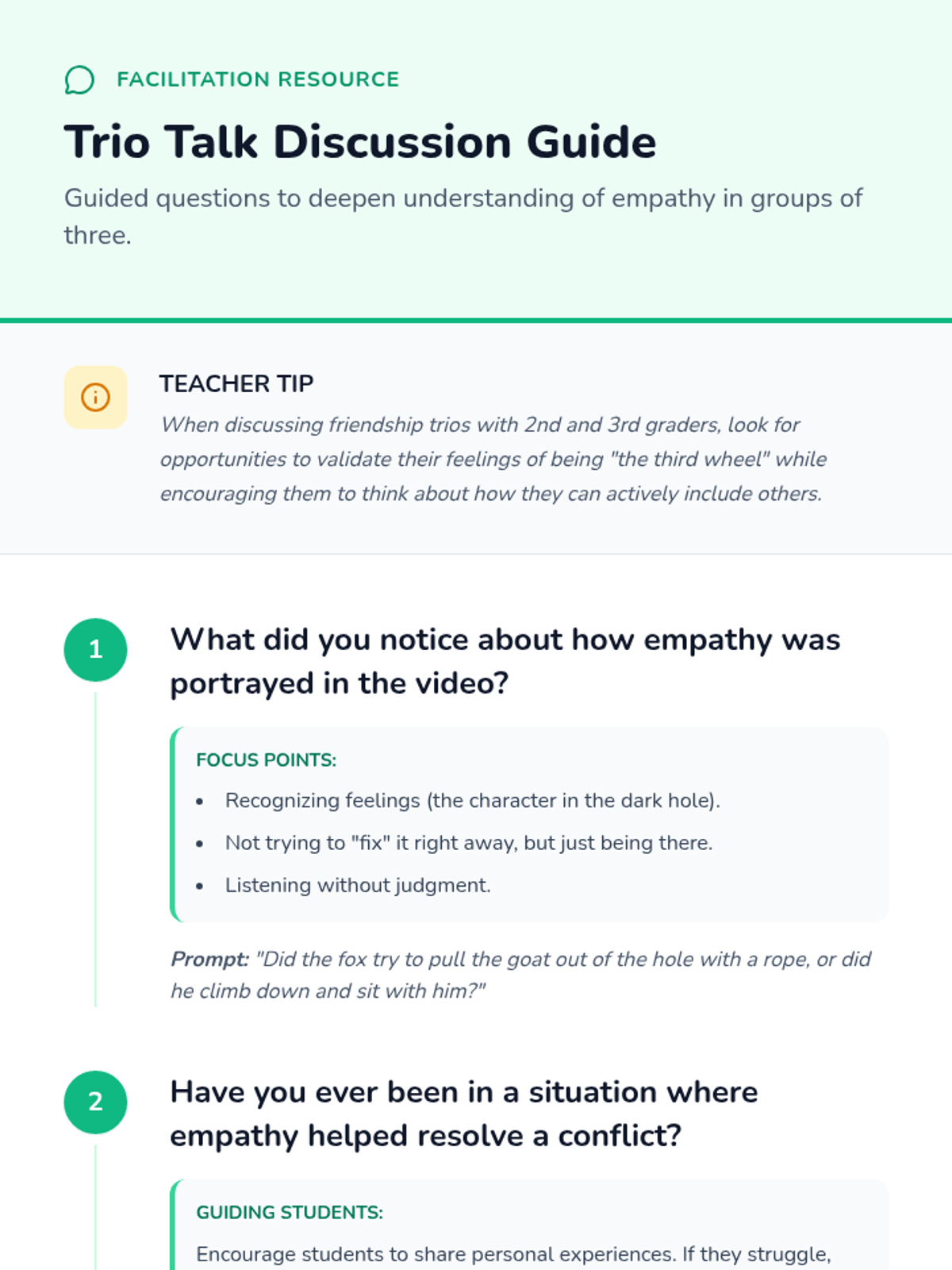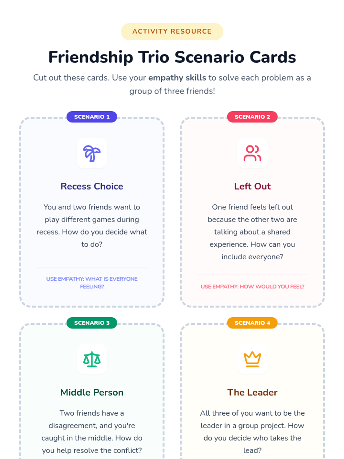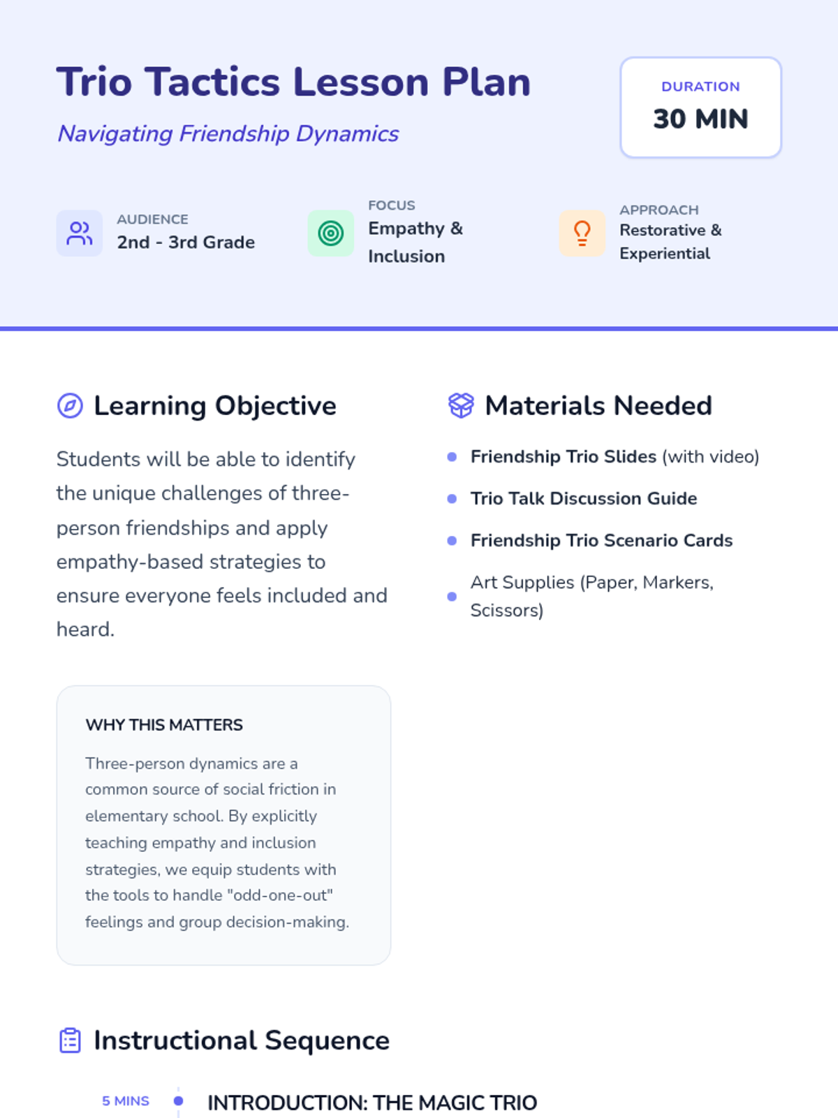 A social-emotional learning lesson for 2nd and 3rd graders focused on navigating the unique dynamics of three-person friendships using empathy and communication.
