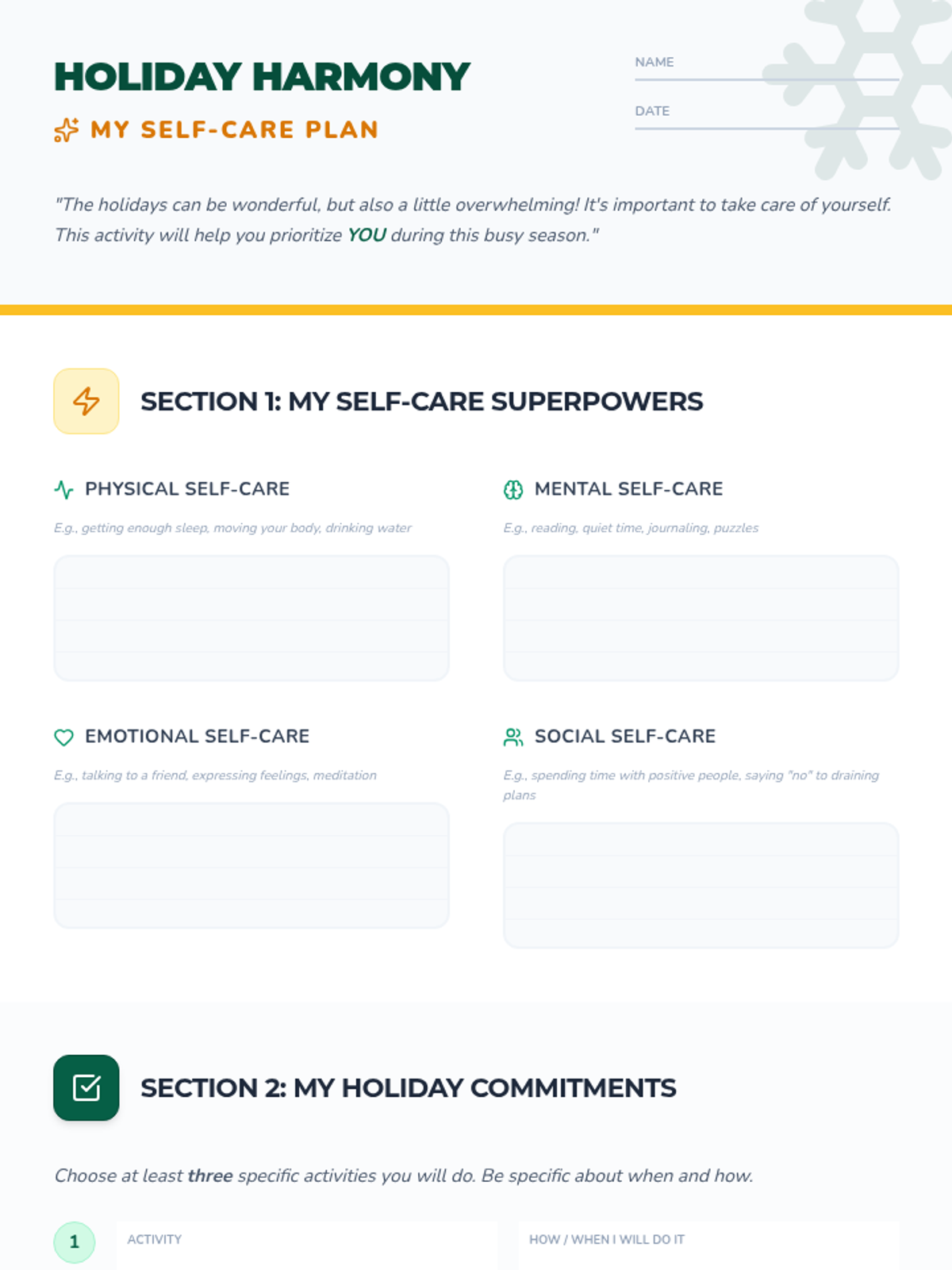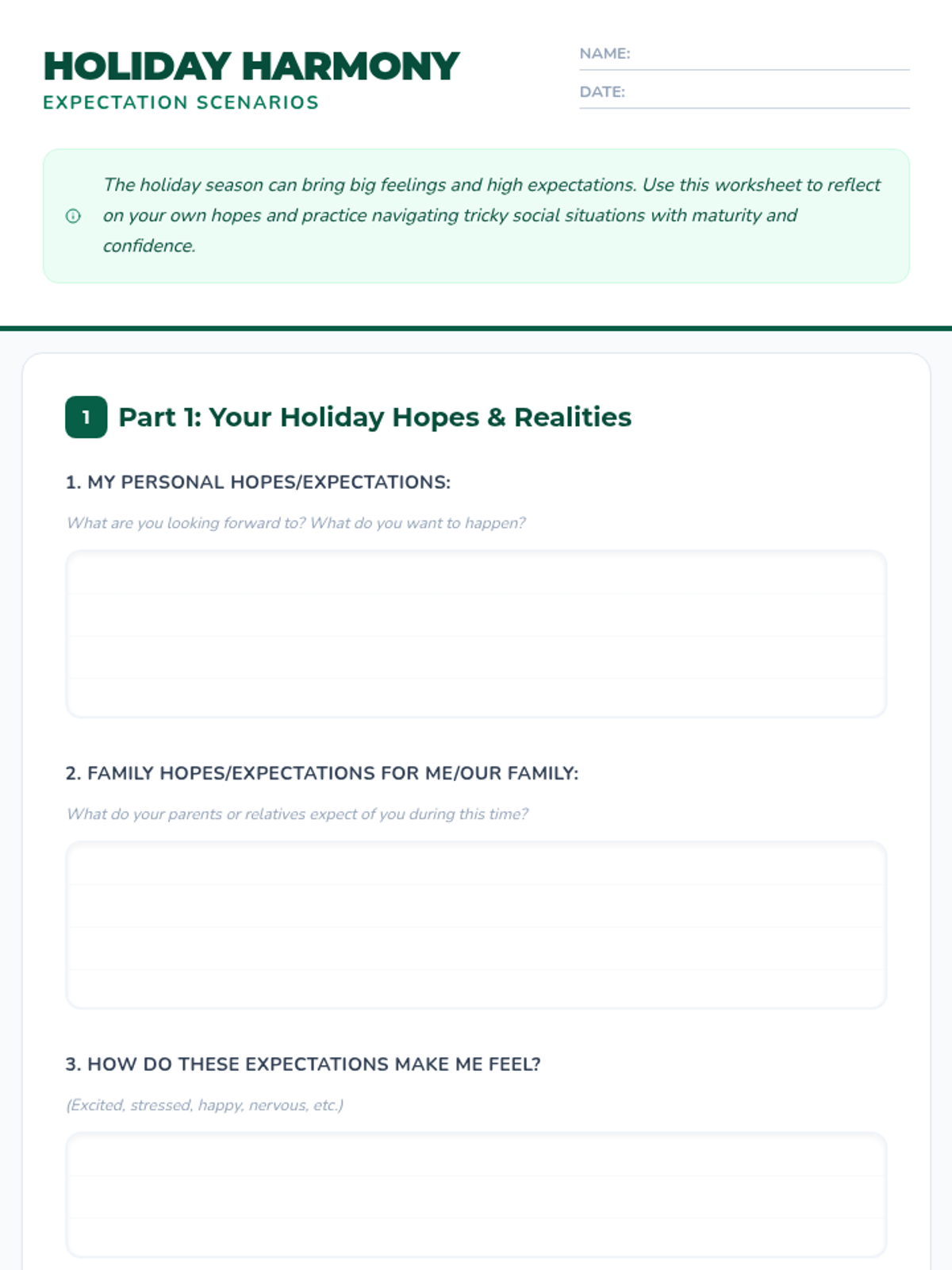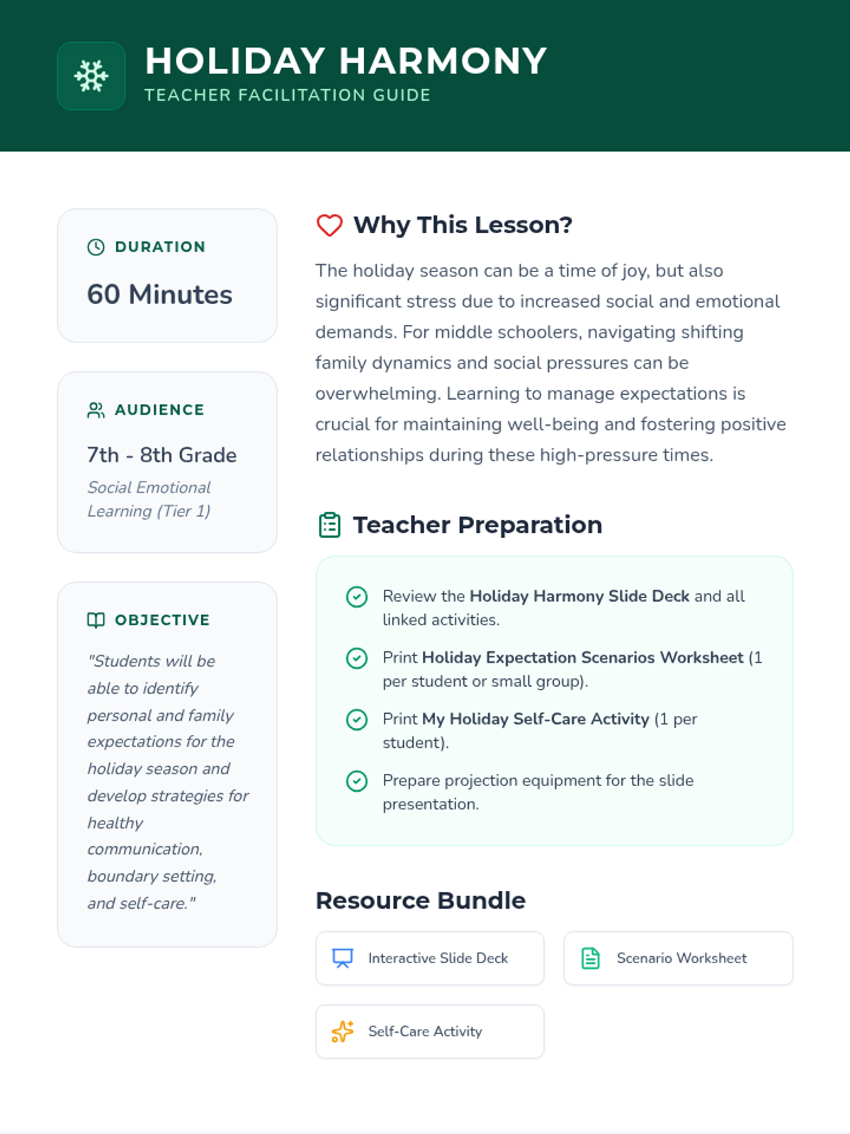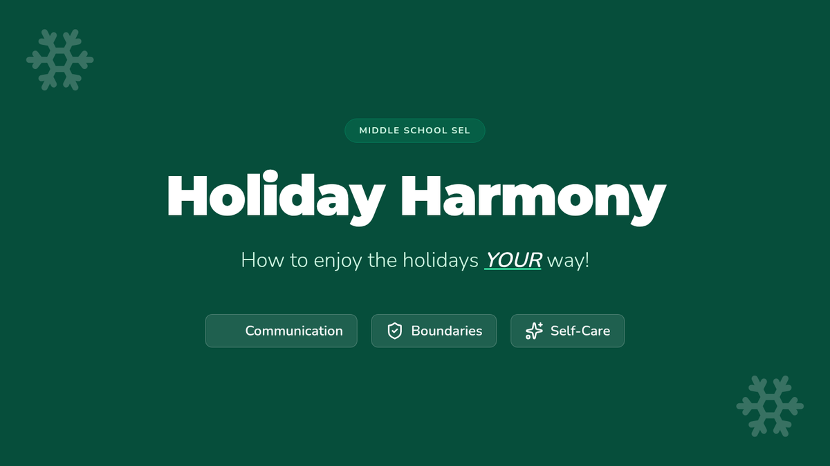 This lesson helps 7th and 8th-grade students navigate the social and emotional complexities of the holiday season. Students will learn to identify personal and family expectations, practice boundary setting through scenarios, and create a personal self-care plan to manage stress.