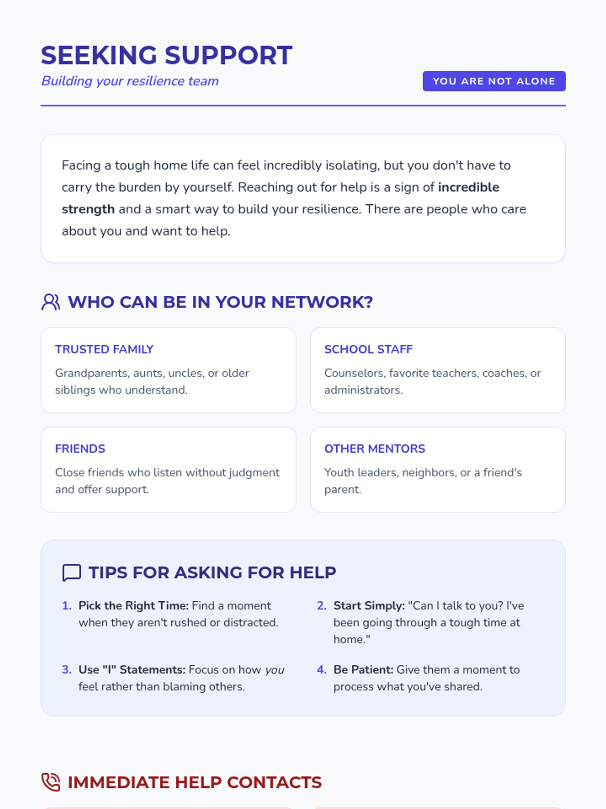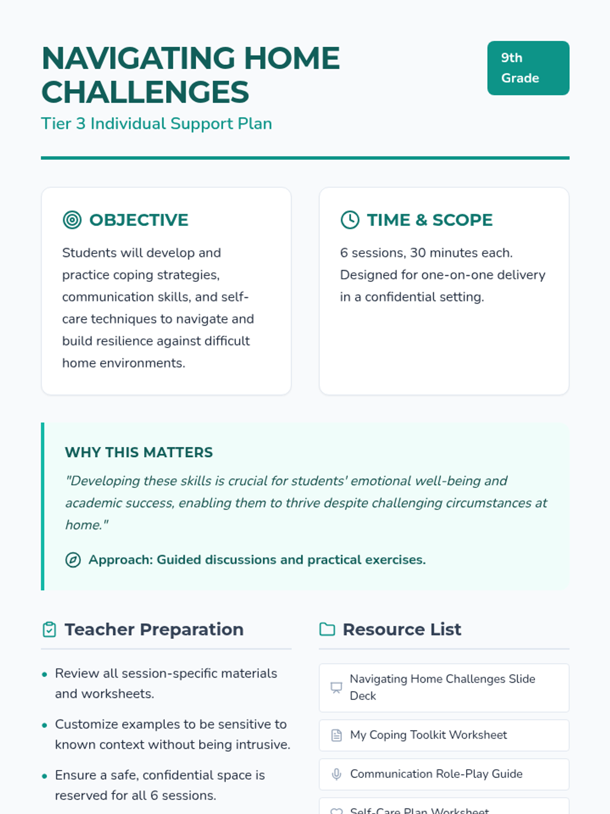 A comprehensive 6-session individual support plan for 9th-grade students to build resilience and coping mechanisms for difficult home environments.