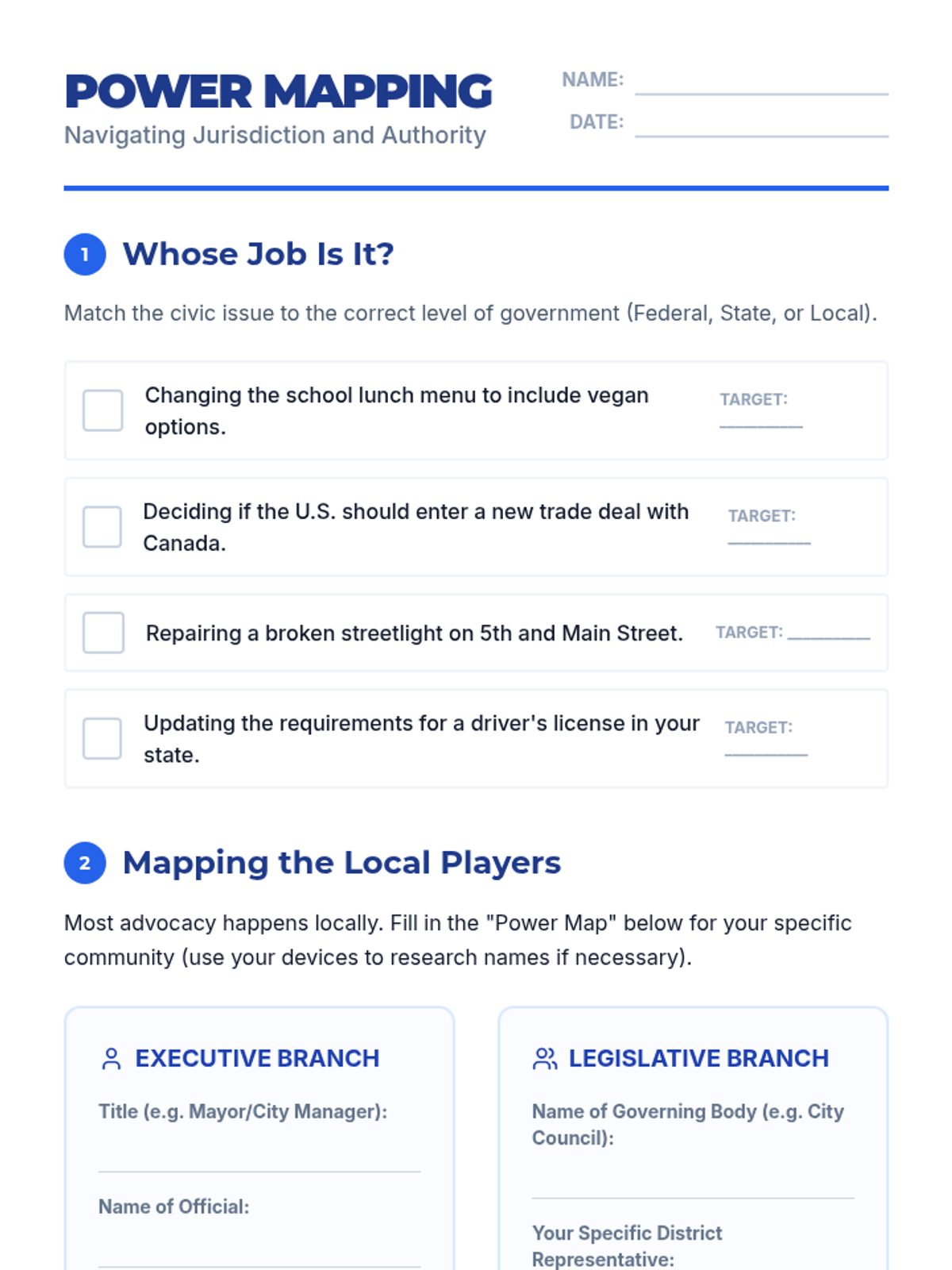 Students map the structure of their local government to understand jurisdiction and identify exactly which official has the power to address specific community issues.