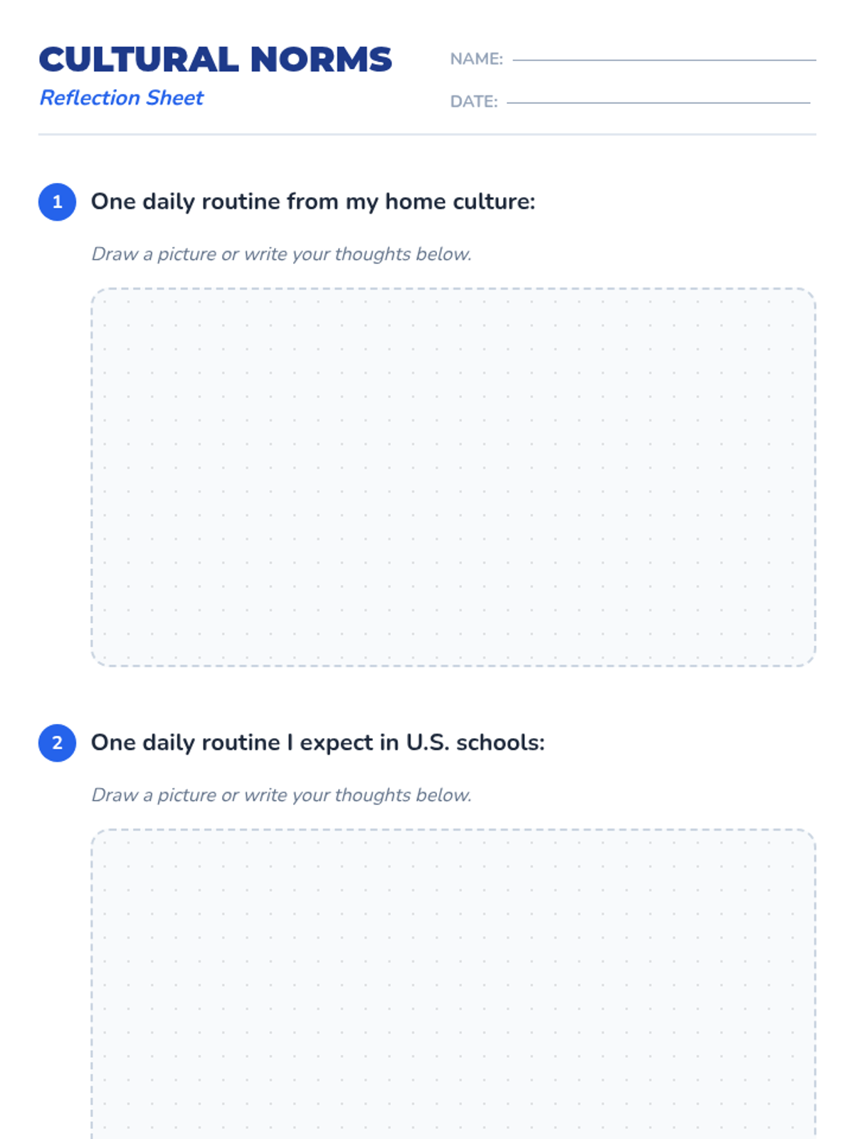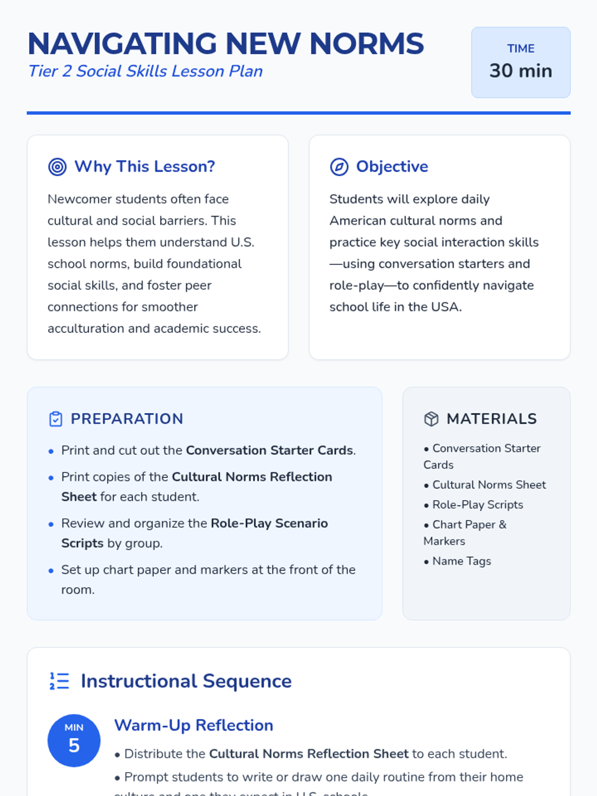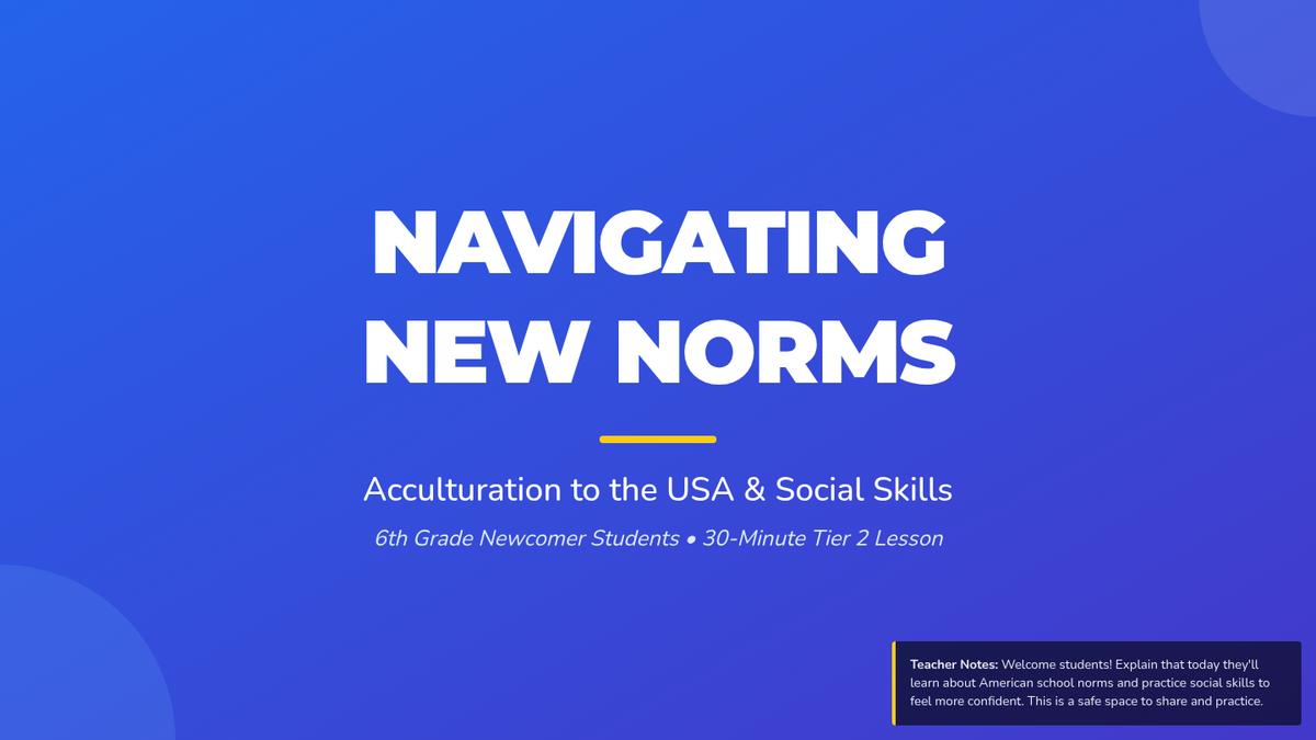 A 30-minute Tier 2 lesson for 6th-grade newcomer students to explore American cultural norms and practice social skills through reflection, conversation starters, and role-playing.