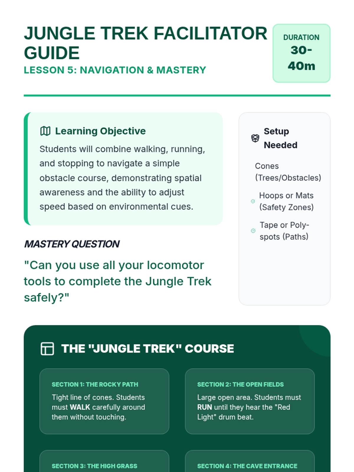 In this culminating lesson, students apply their walking, running, and stopping skills to navigate a simple course. They must adjust their speed to move around stationary objects (cones or hoops) safely. This assesses their ability to combine spatial awareness with locomotor control.