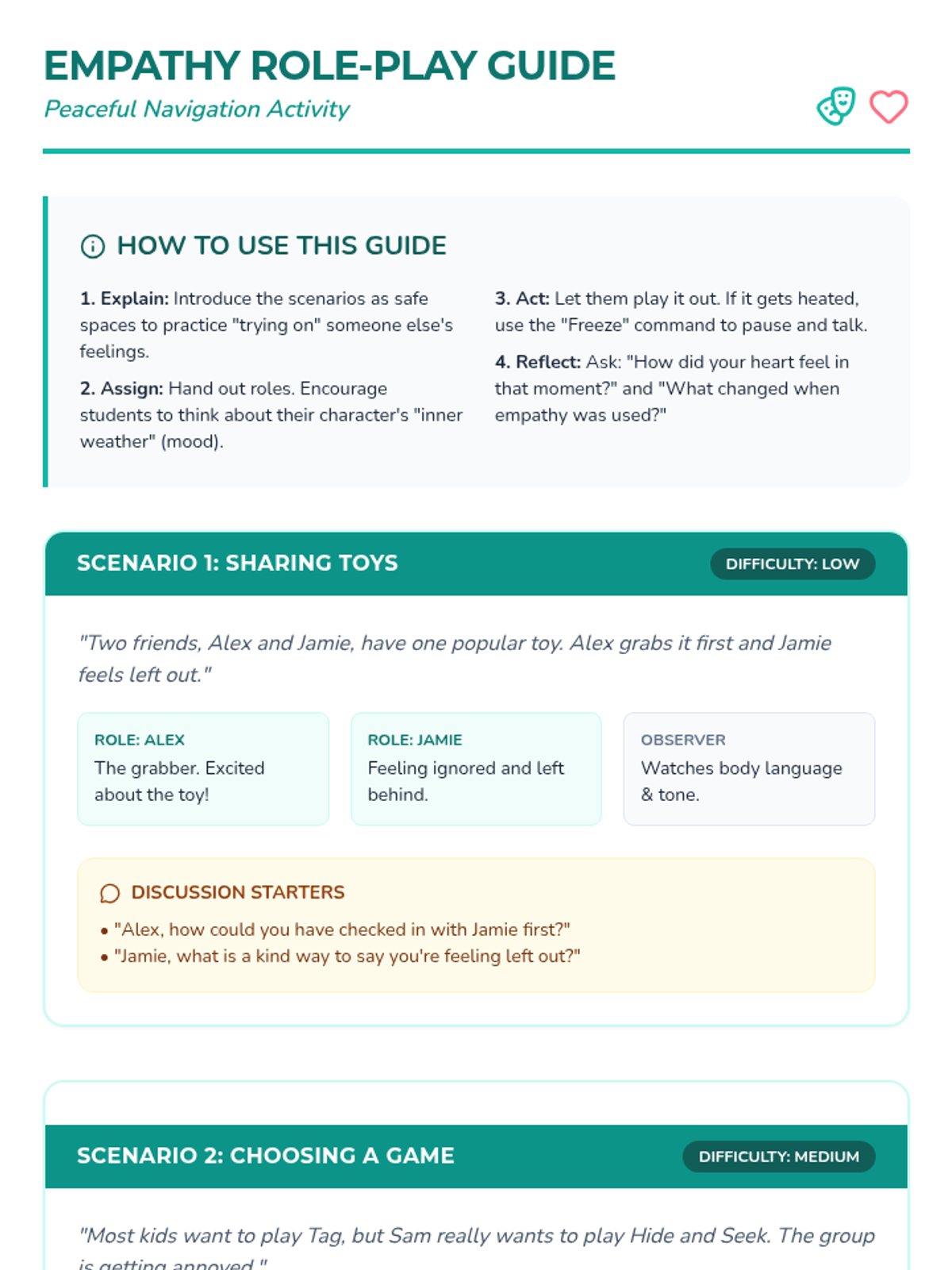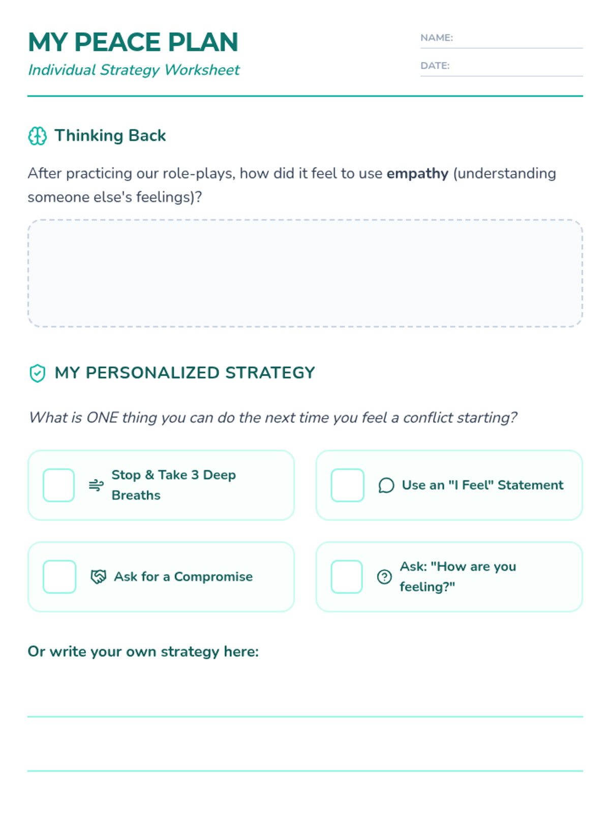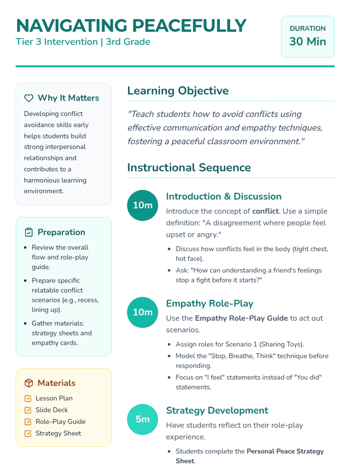 A 30-minute Tier 3 intervention lesson for 3rd graders focused on conflict avoidance through empathy and effective communication. Students practice real-world scenarios and develop a personalized strategy for peaceful interactions.