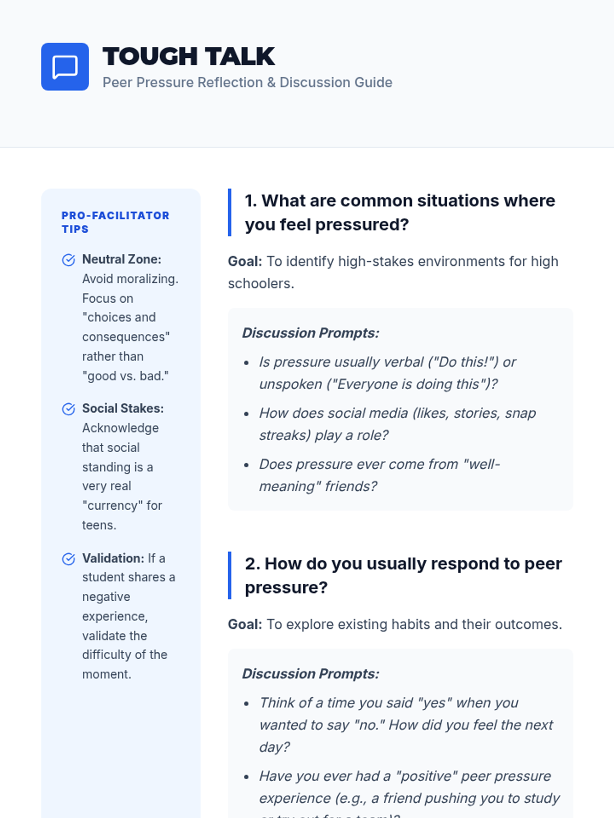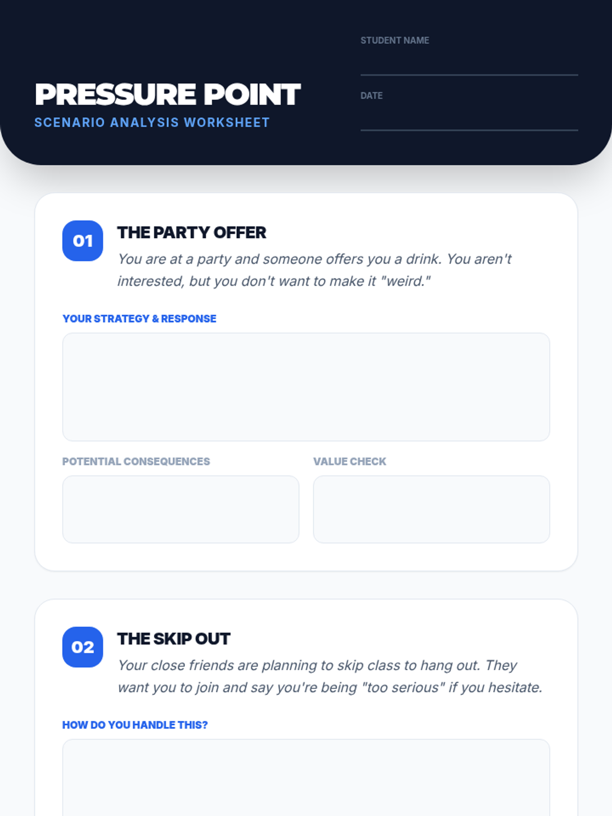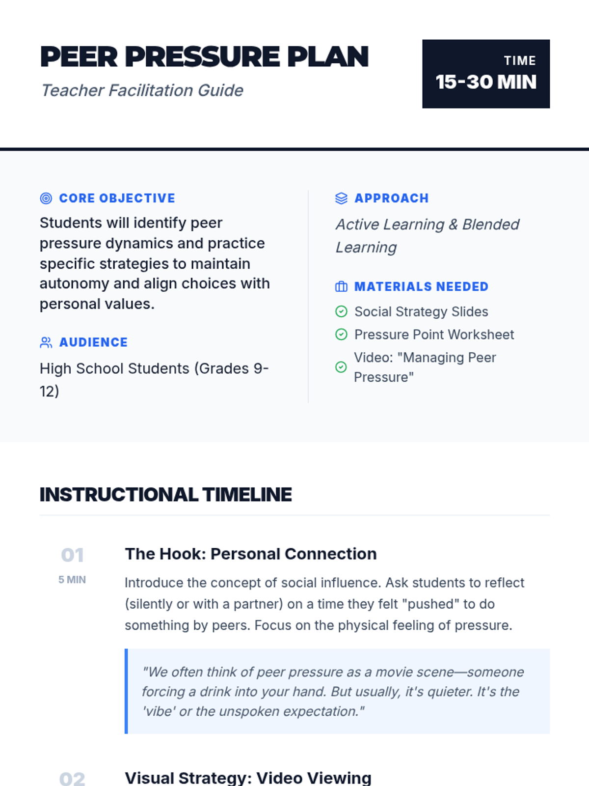 A comprehensive lesson for high school students to identify, analyze, and navigate various forms of peer pressure using real-world scenarios and strategic refusal skills.