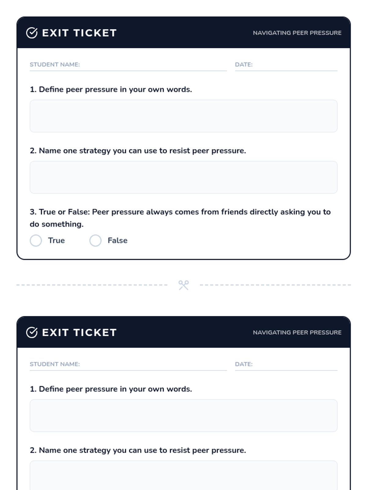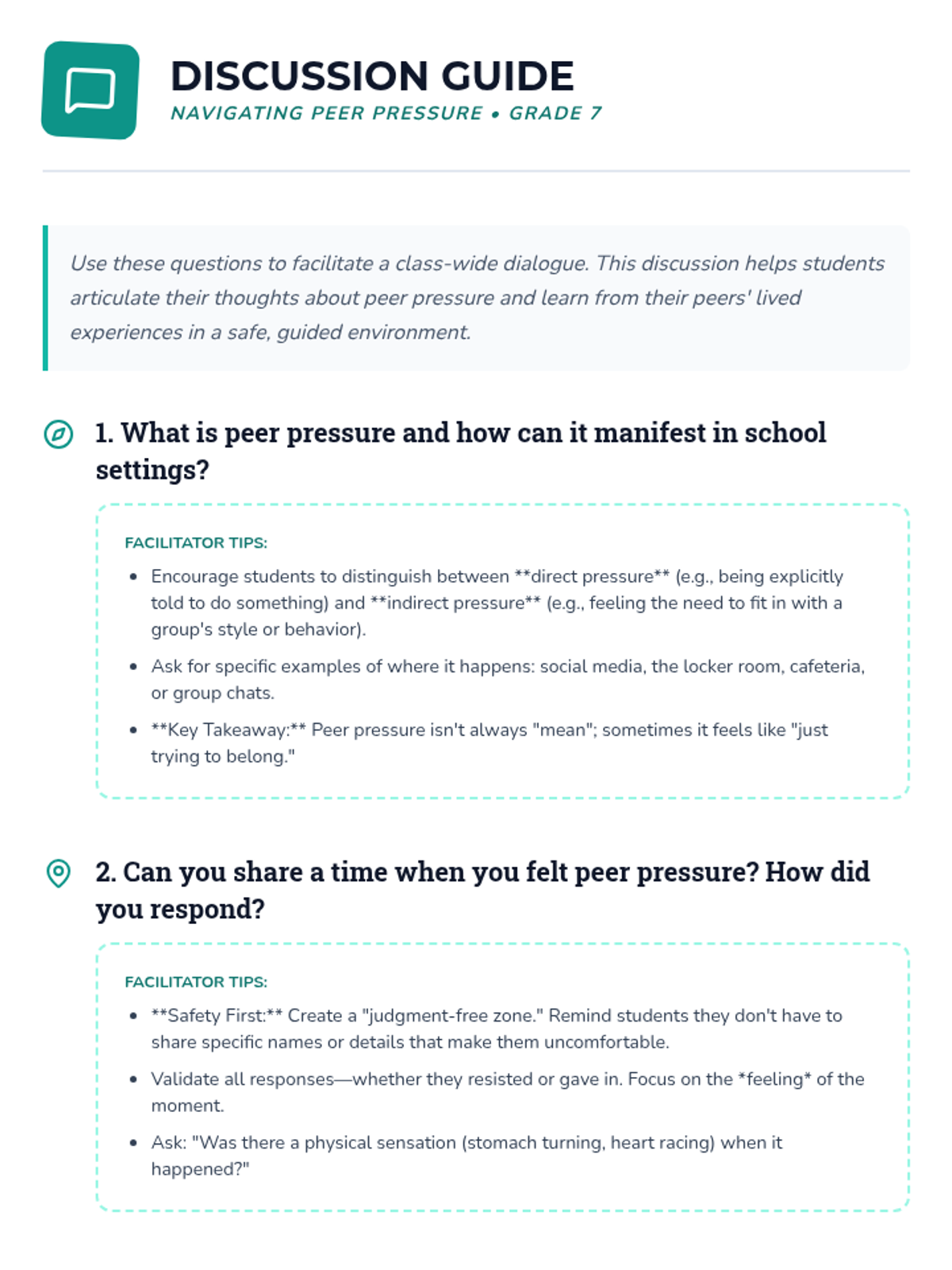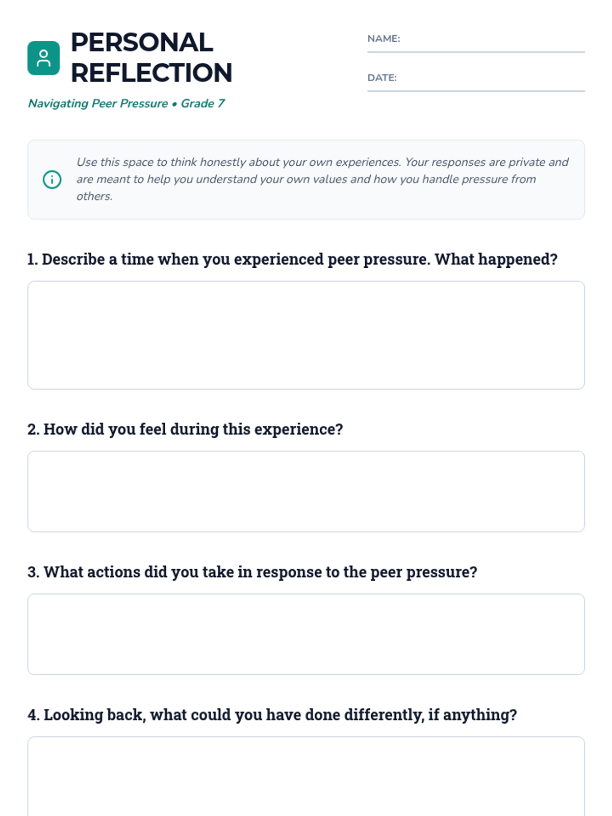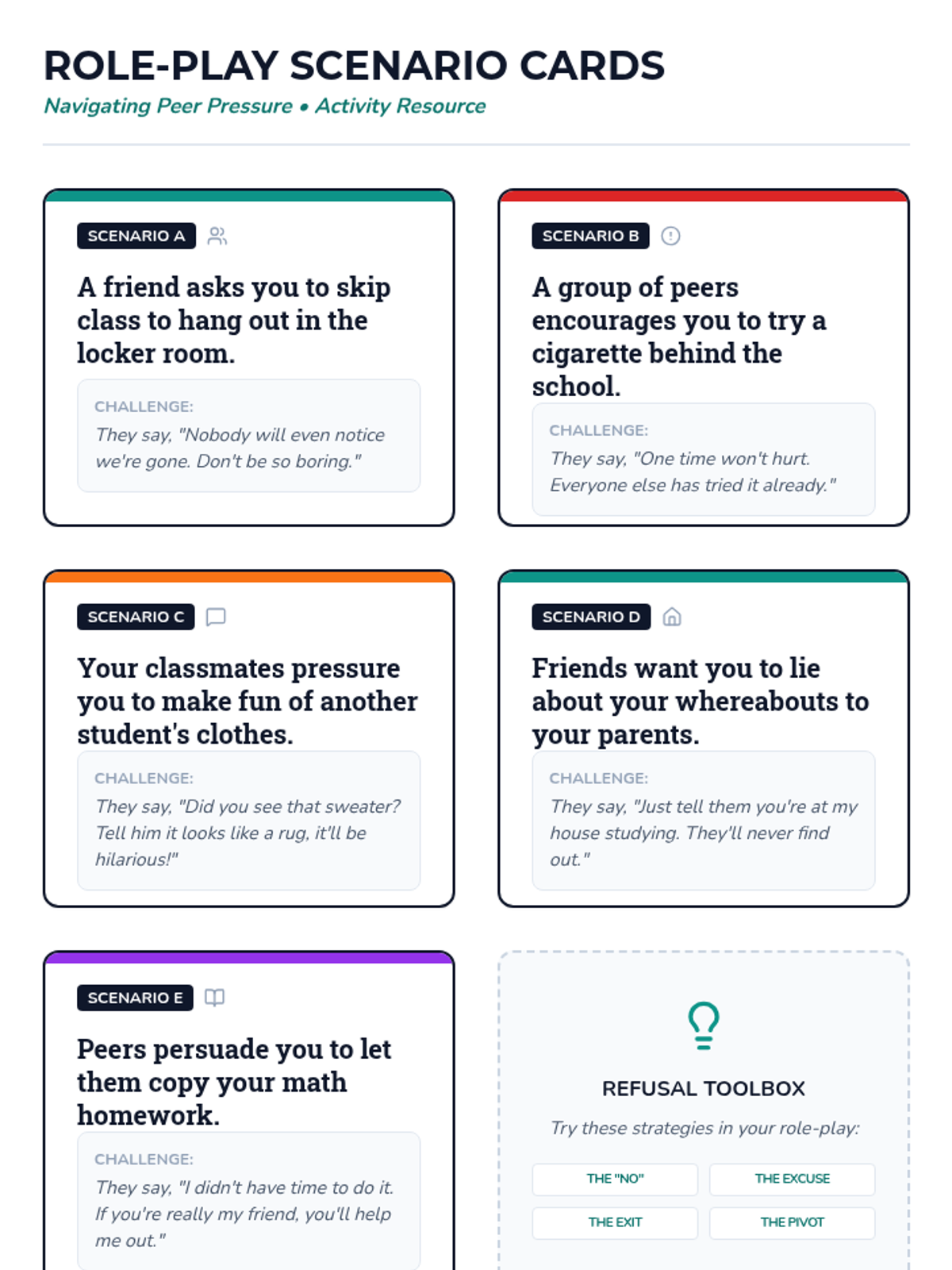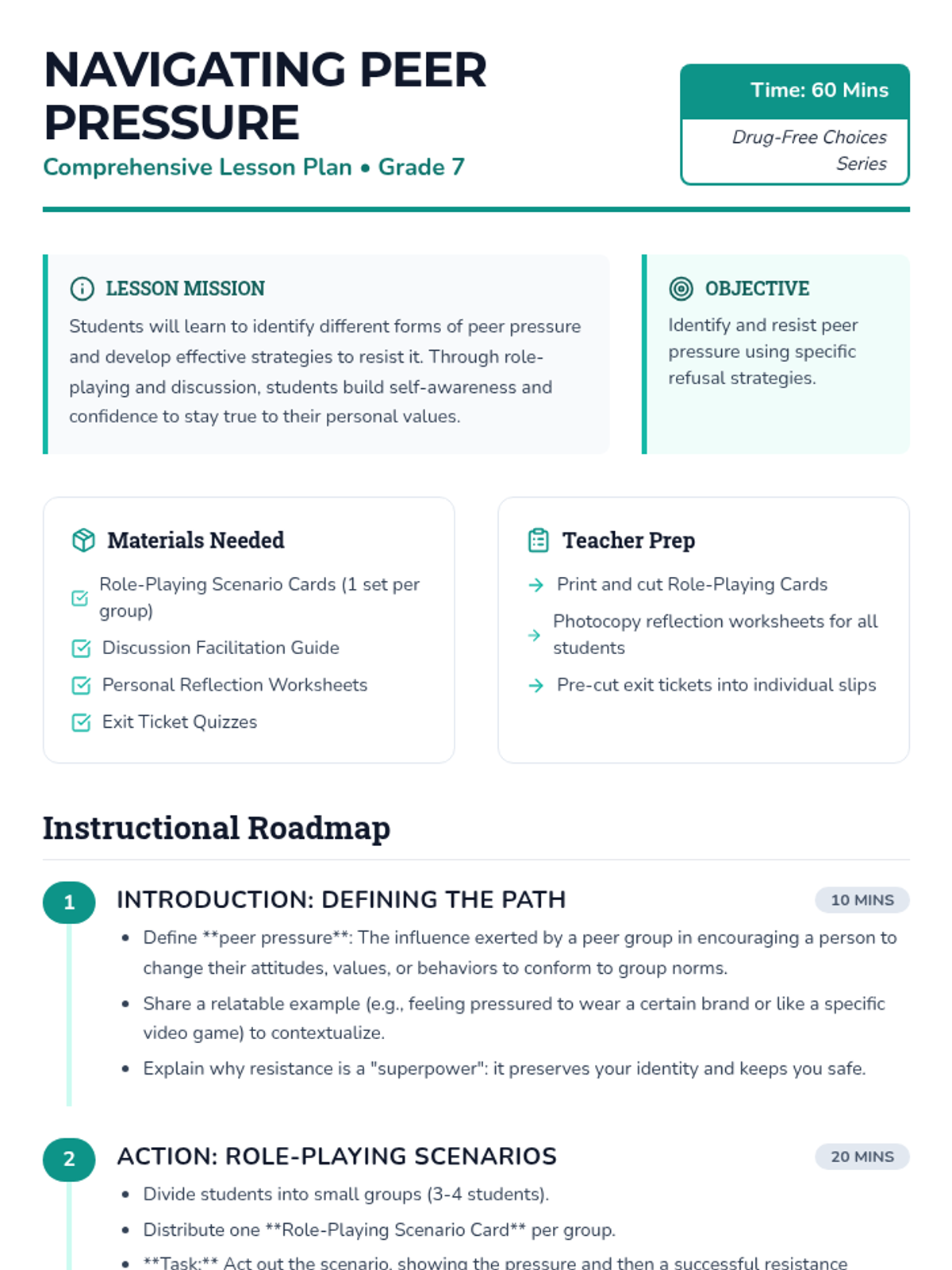 A comprehensive lesson for 7th graders to identify different types of peer pressure and develop practical strategies for resistance through role-play and reflection.