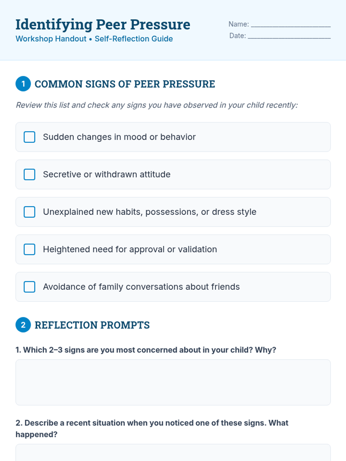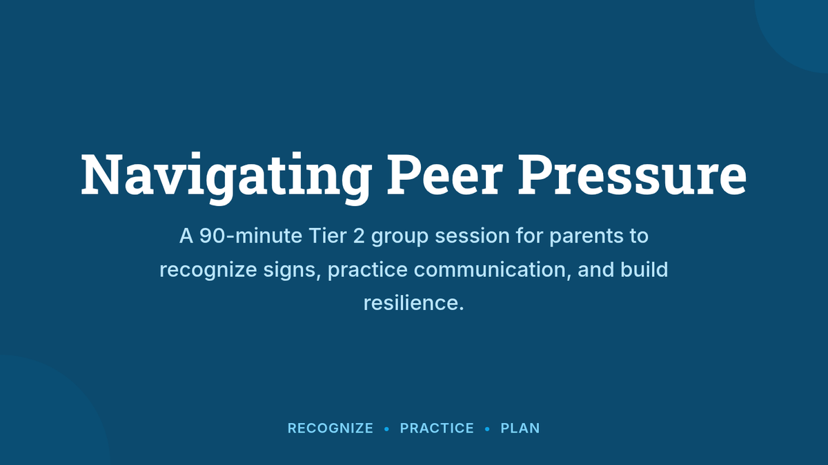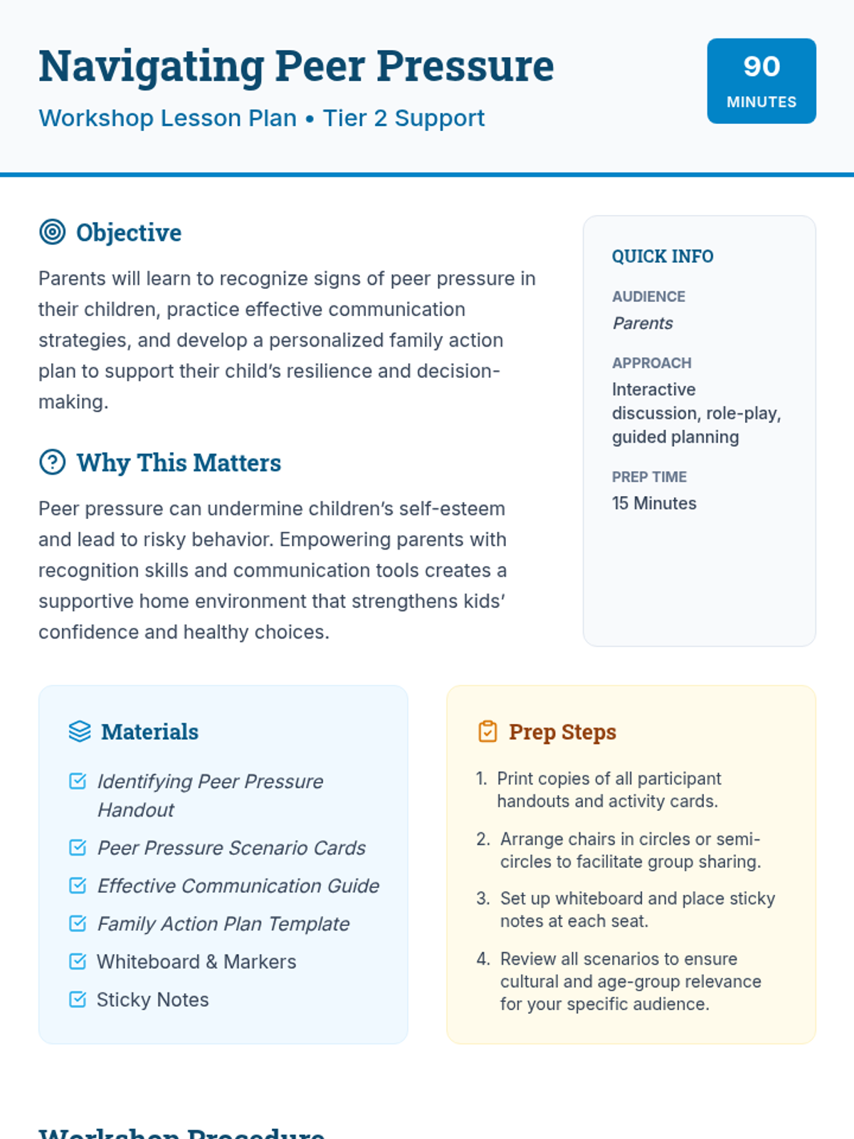 A 90-minute Tier 2 workshop for parents to recognize peer pressure, practice communication strategies, and build resilience in their children through family action planning.