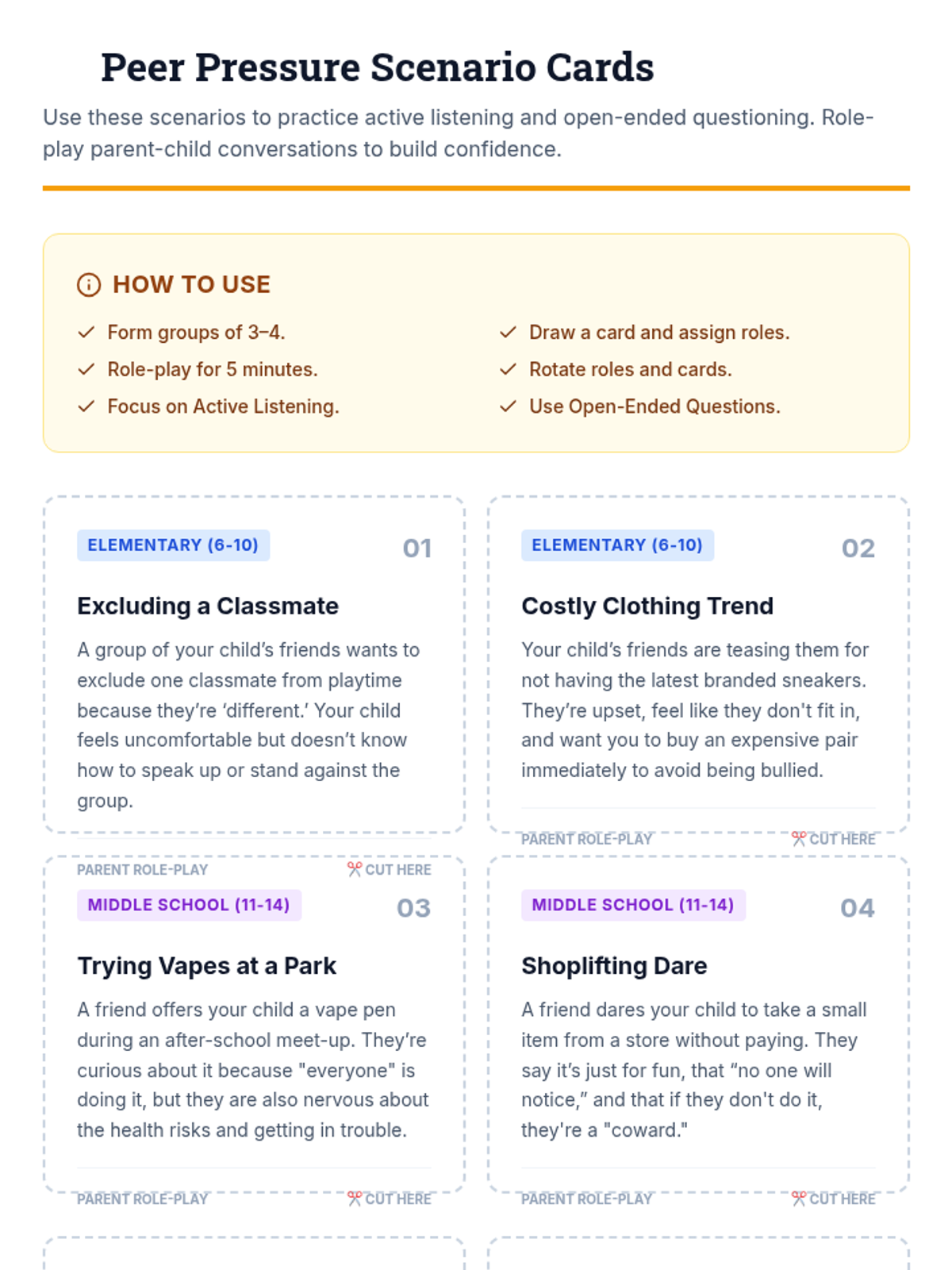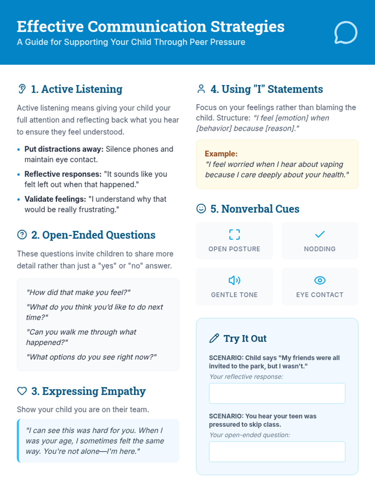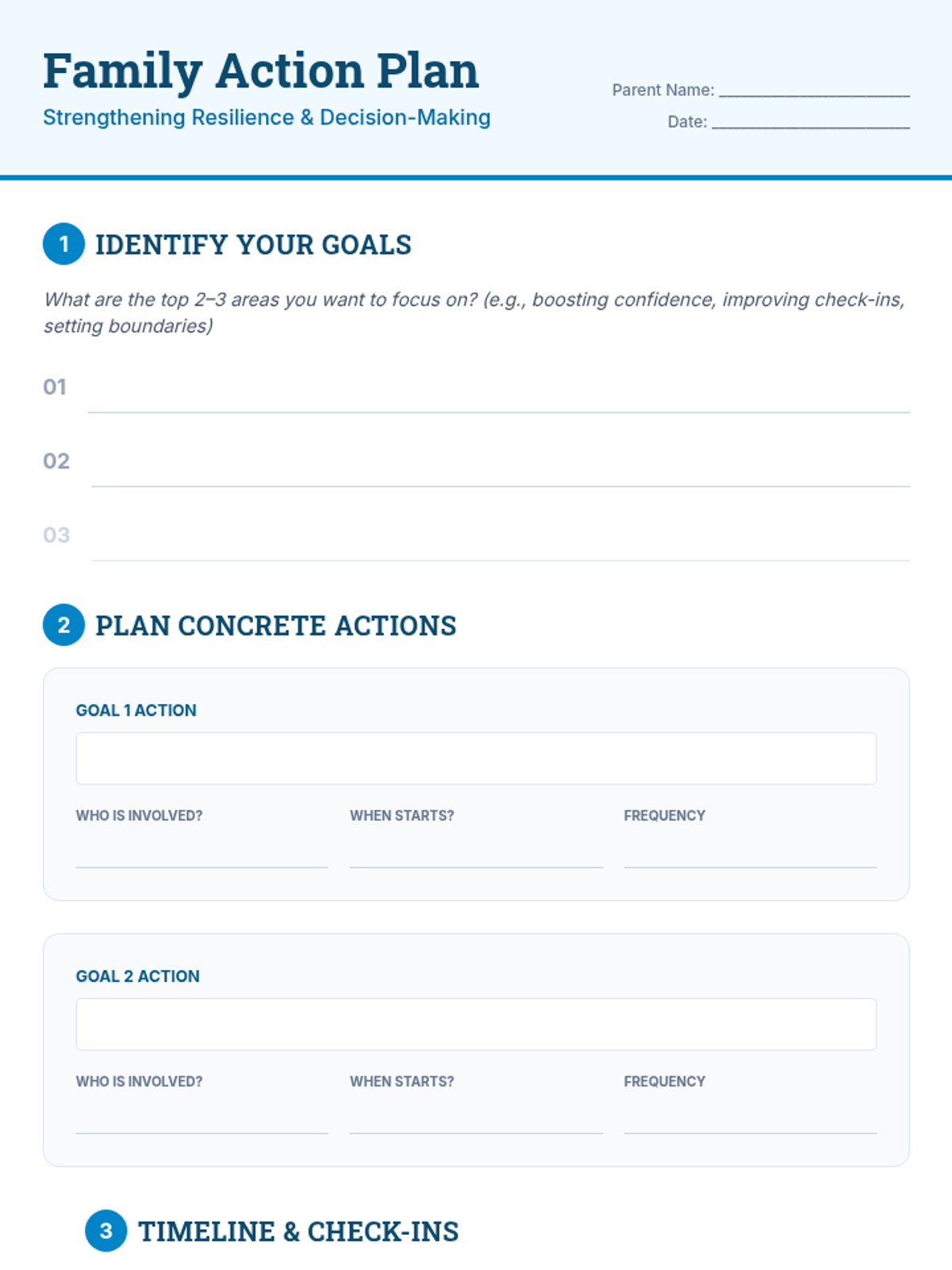 A 90-minute Tier 2 workshop for parents to recognize peer pressure, practice communication strategies, and build resilience in their children through family action planning.