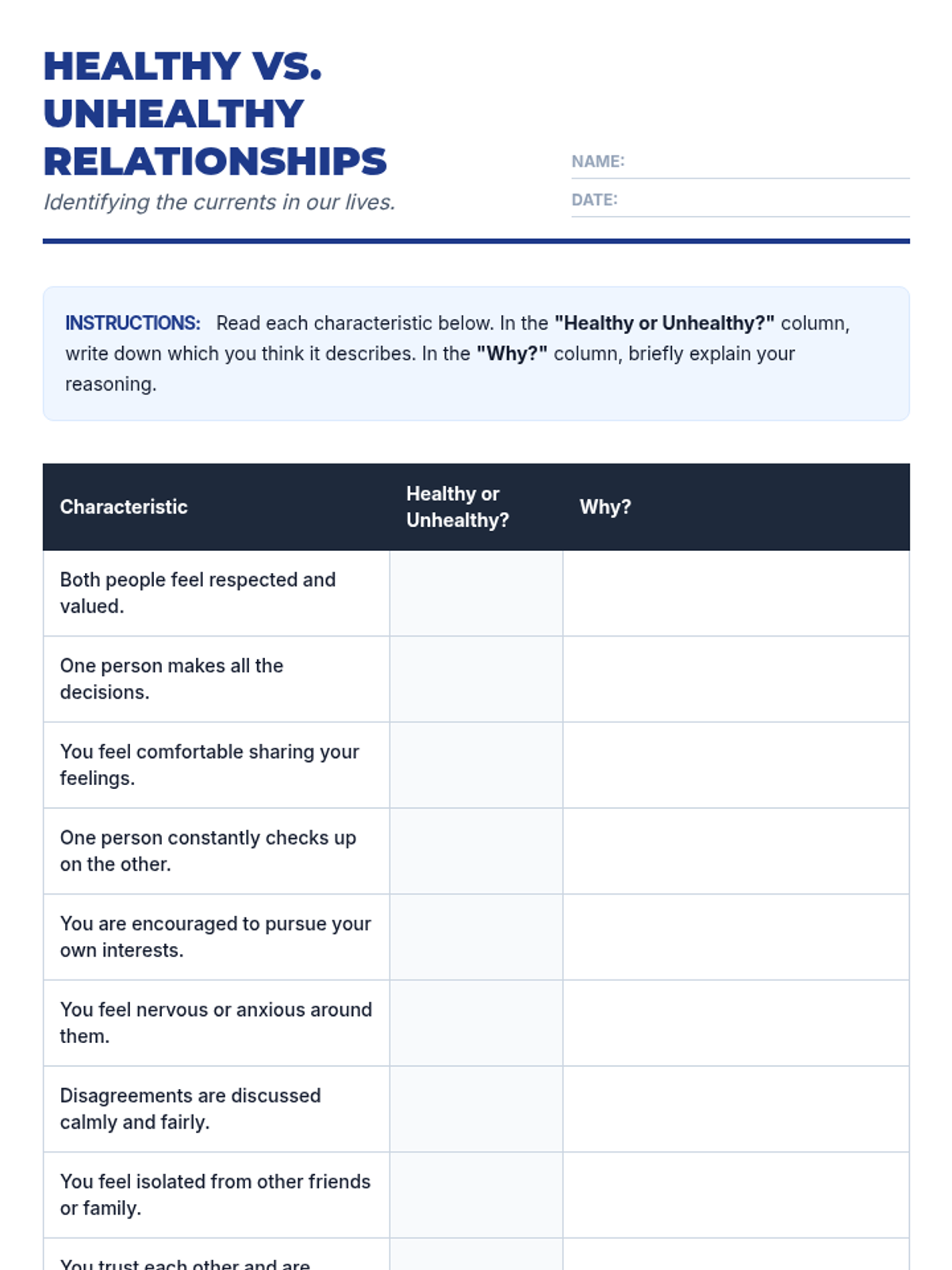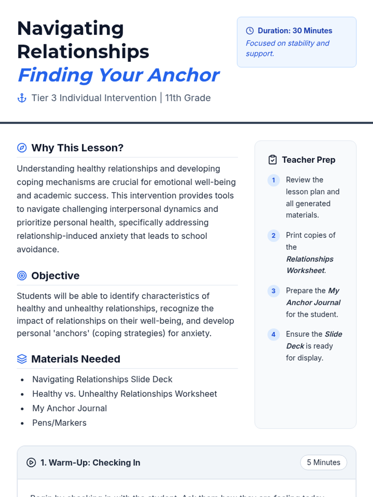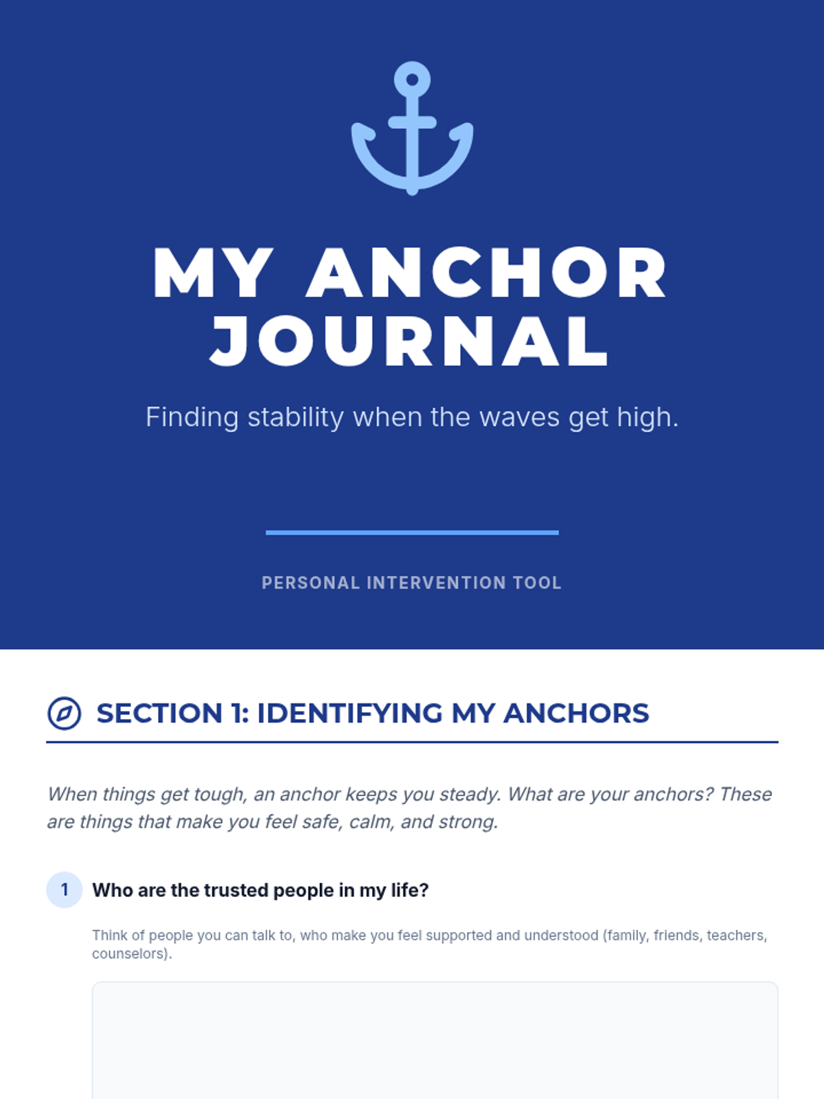 A 30-minute individual Tier 3 intervention for 11th-graders focusing on identifying healthy vs. unhealthy relationship characteristics and developing nautical-themed coping strategies ('anchors') for anxiety and school avoidance.