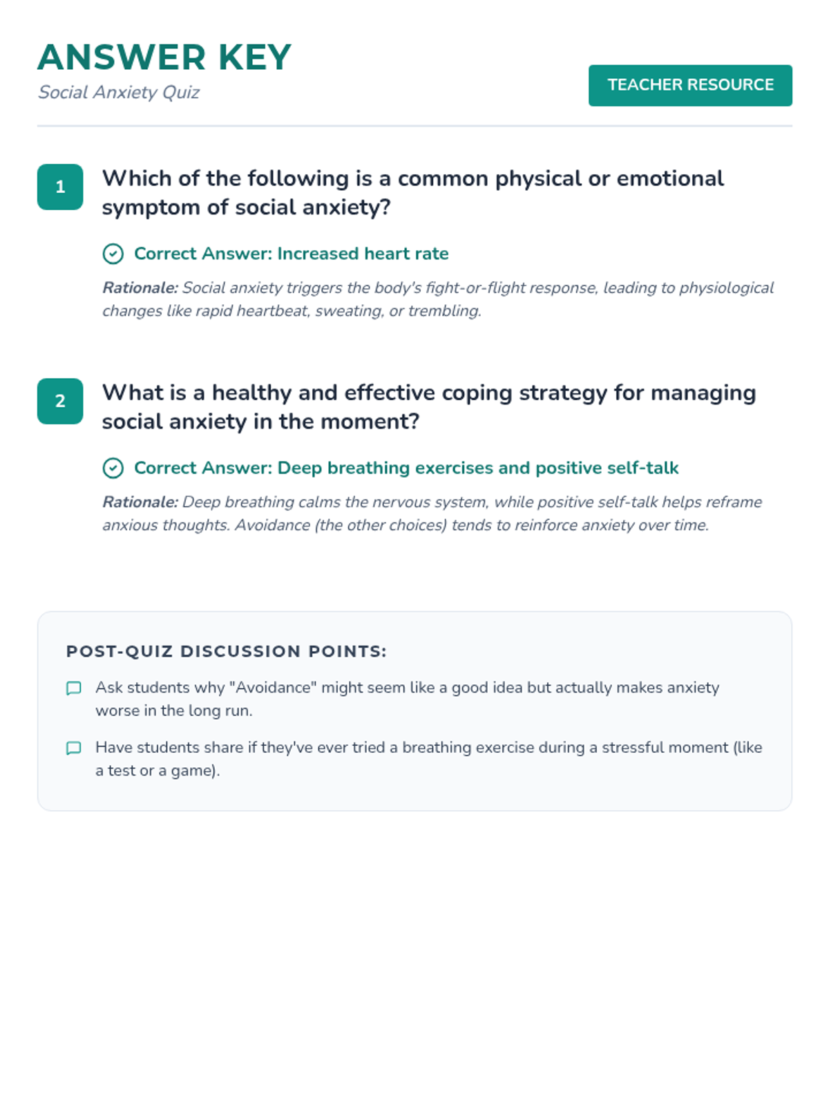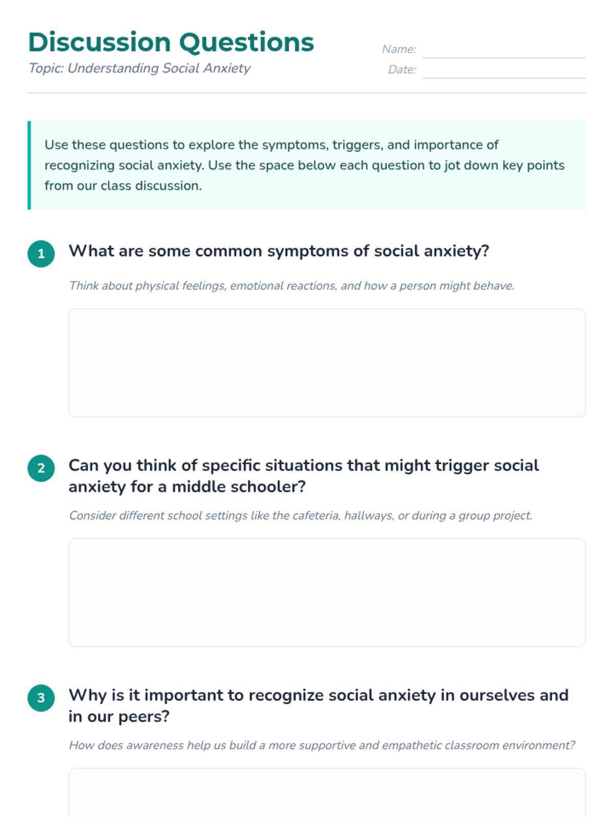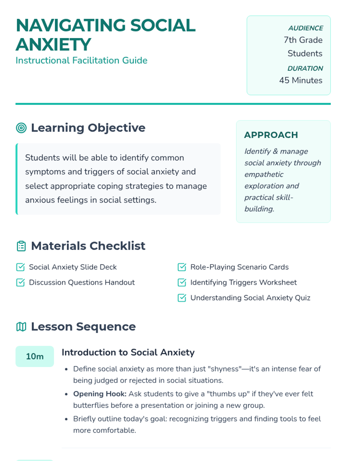 This lesson introduces 7th-grade students to social anxiety, helping them recognize symptoms, identify personal triggers, and develop practical coping strategies through role-play and discussion.