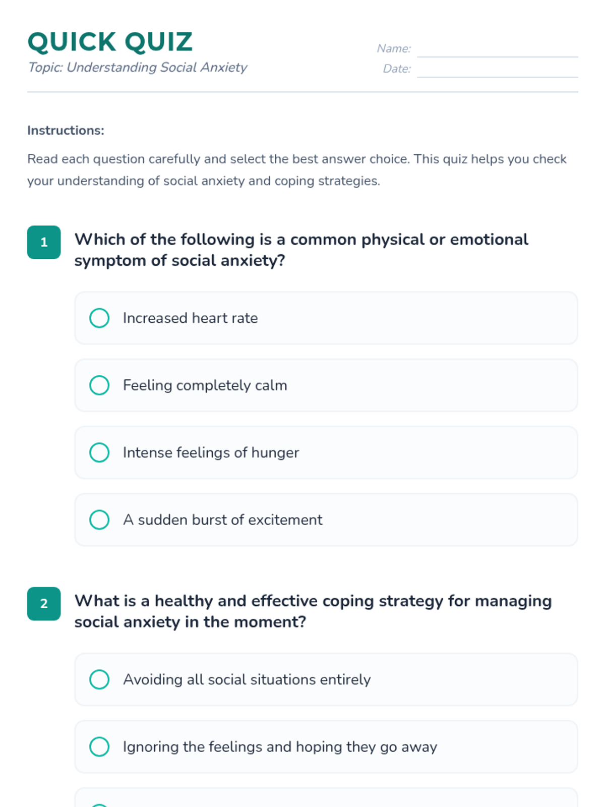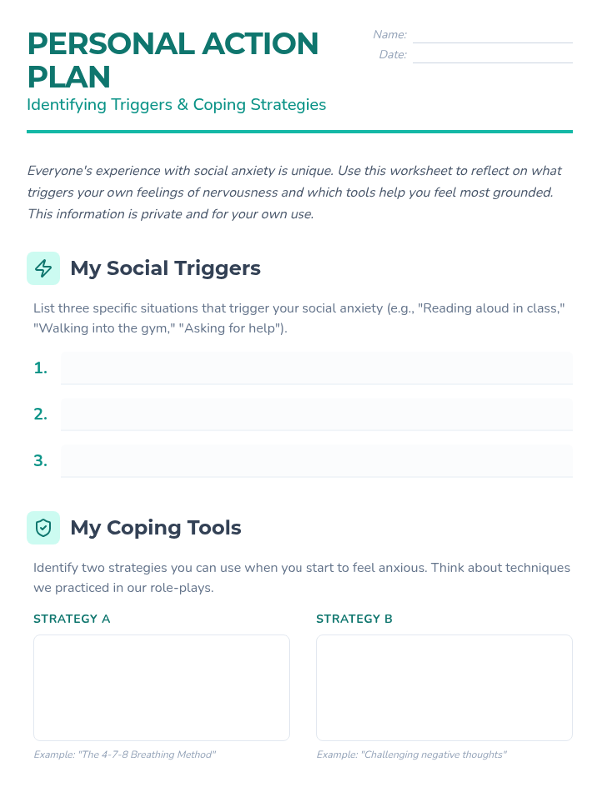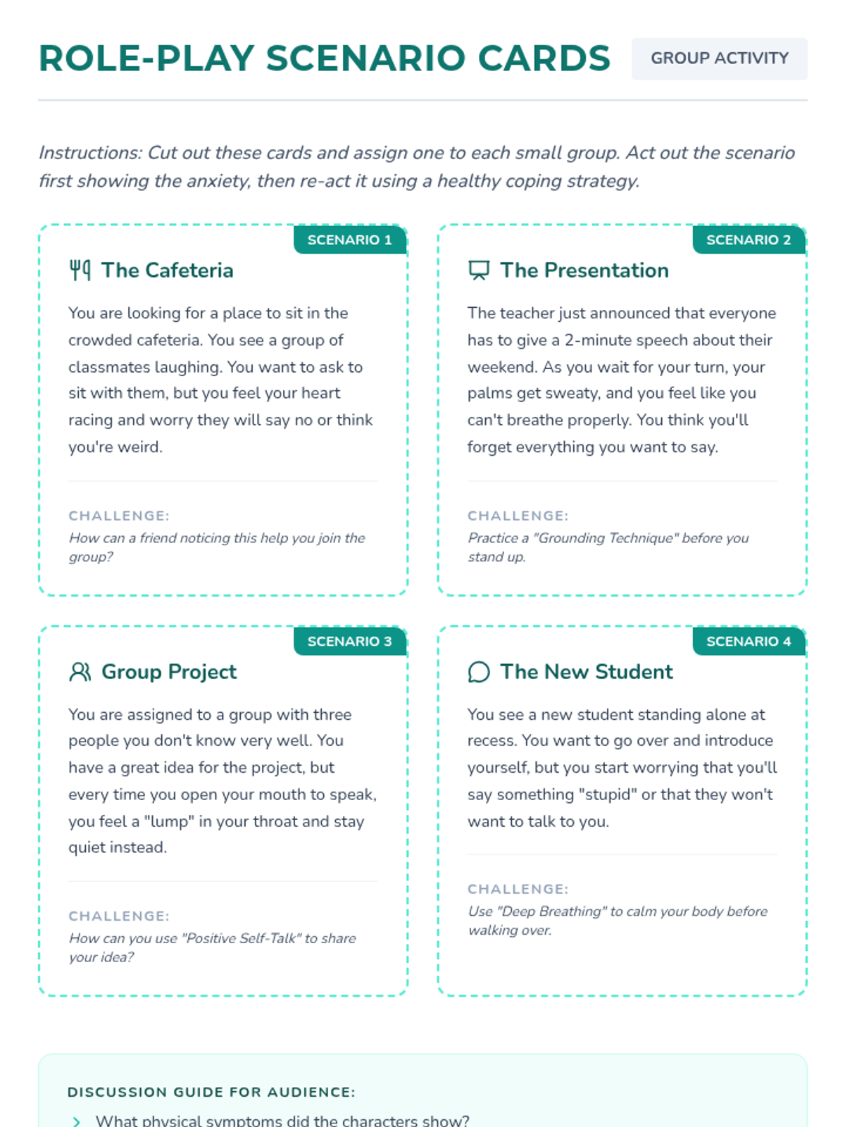 This lesson introduces 7th-grade students to social anxiety, helping them recognize symptoms, identify personal triggers, and develop practical coping strategies through role-play and discussion.