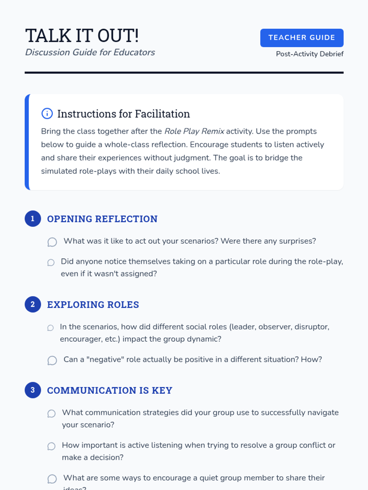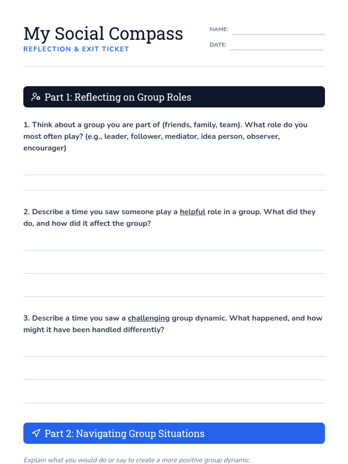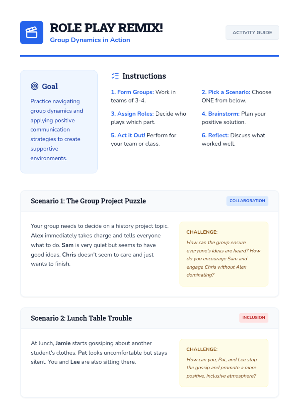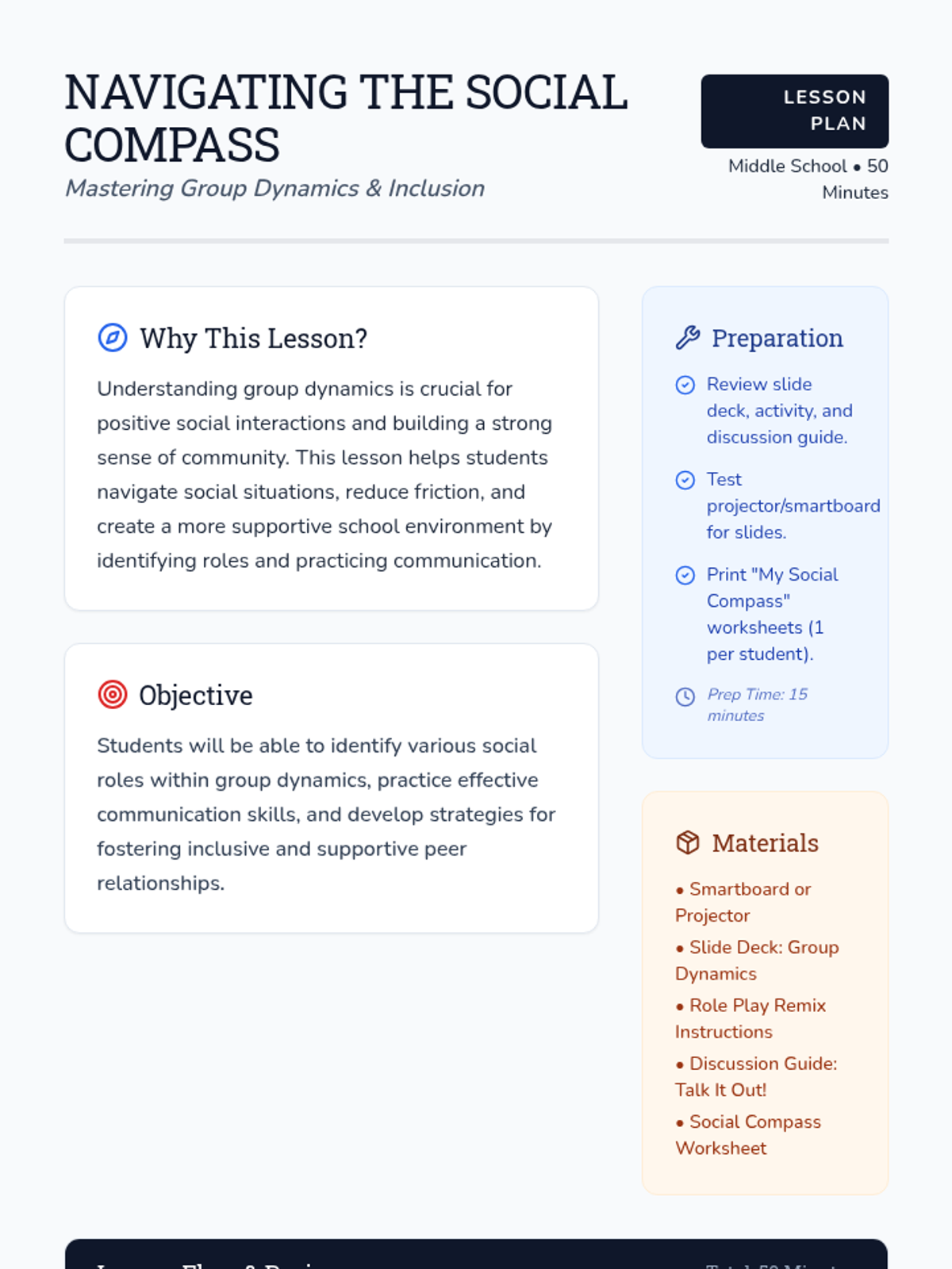 A 50-minute lesson for middle schoolers to understand group dynamics, identify social roles, and practice inclusive communication strategies.