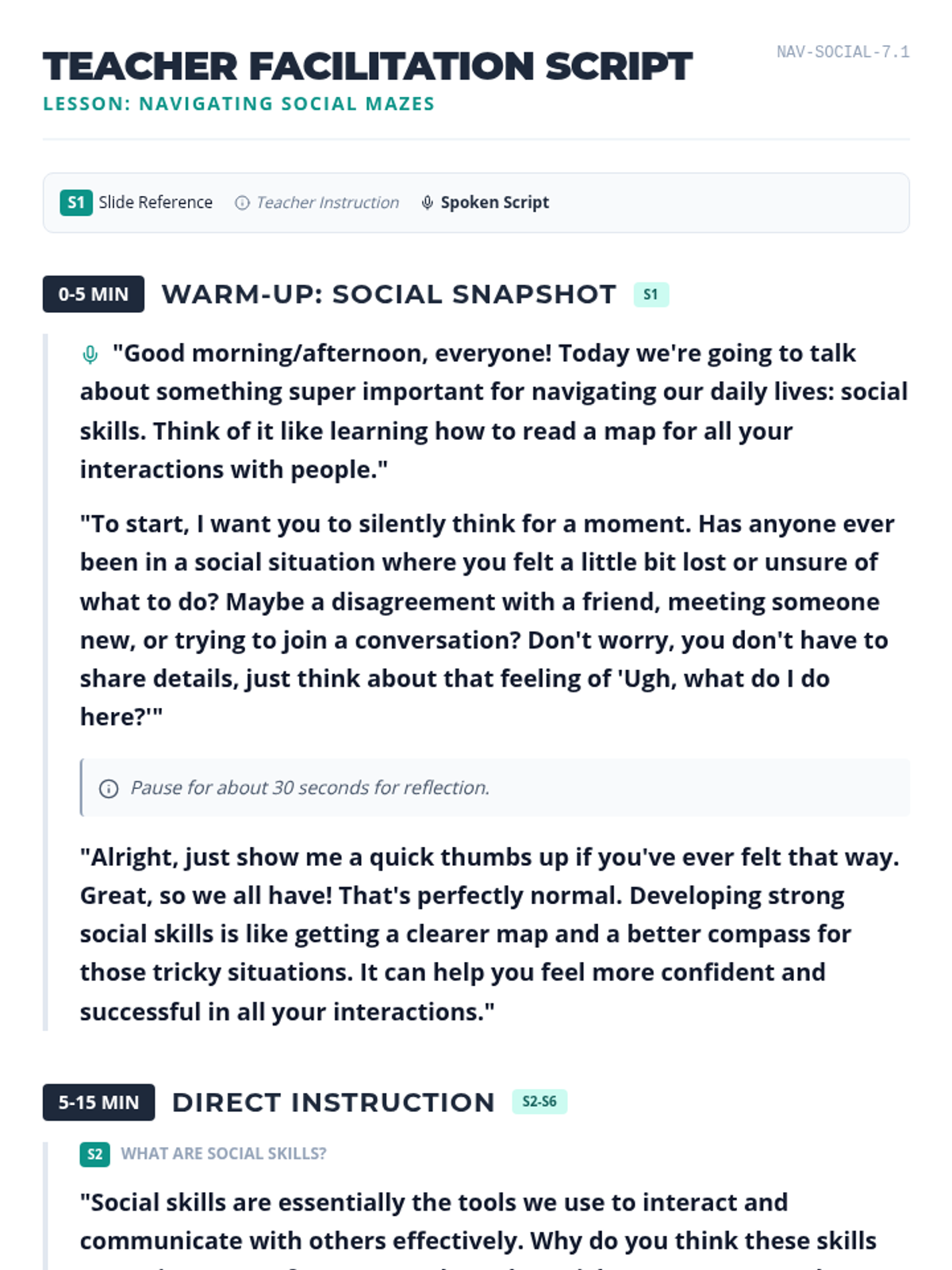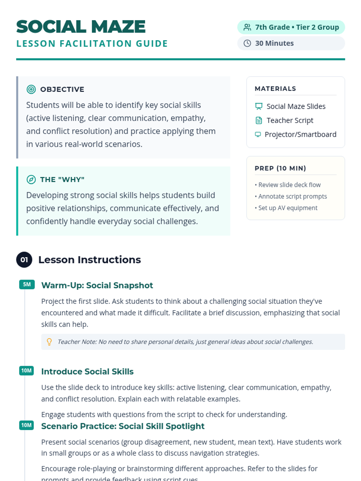 A 30-minute lesson for 7th graders focusing on essential social skills like active listening, clear communication, empathy, and conflict resolution using a navigation-themed approach.