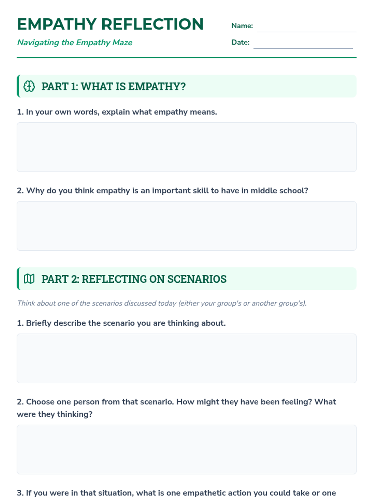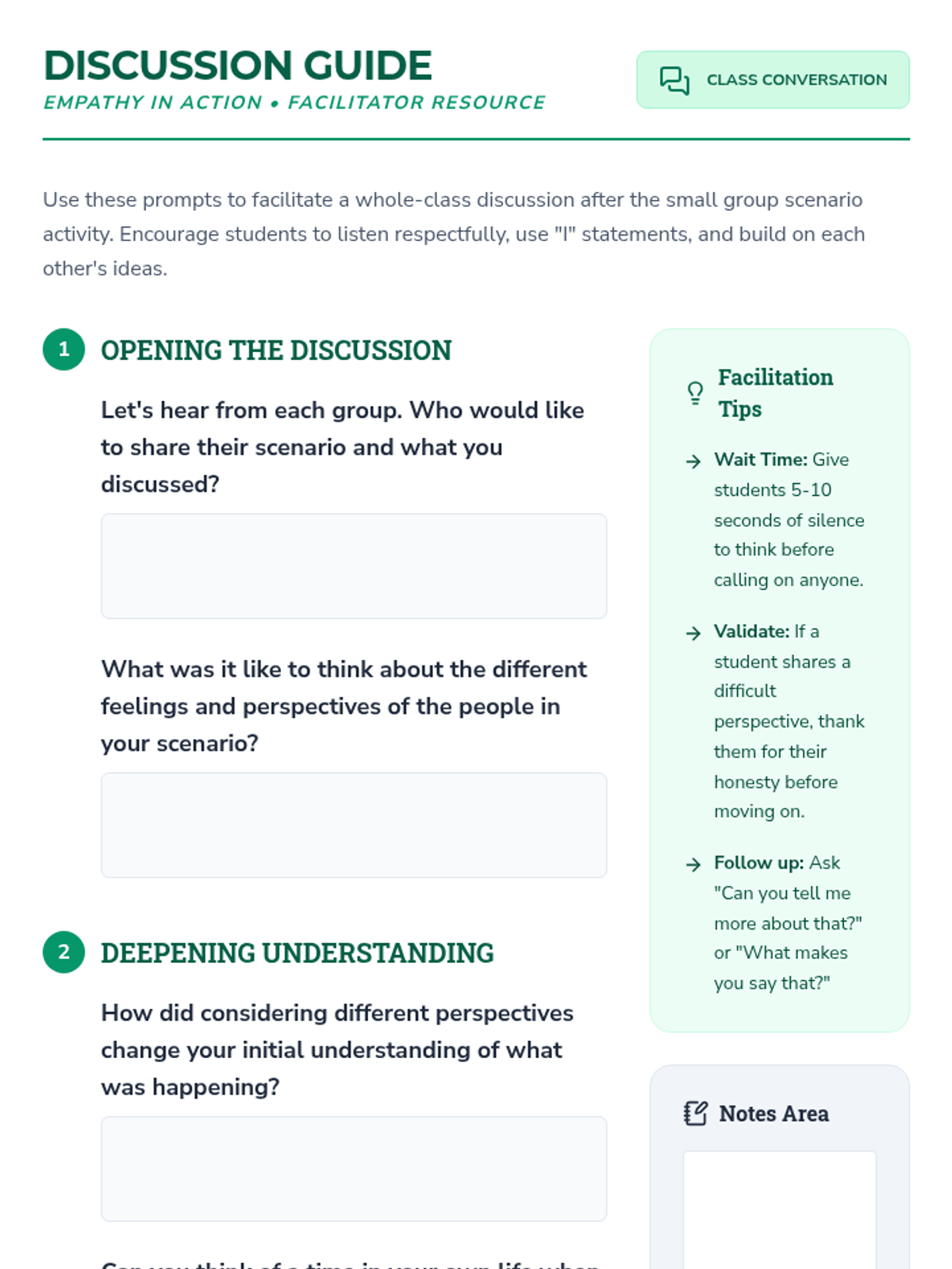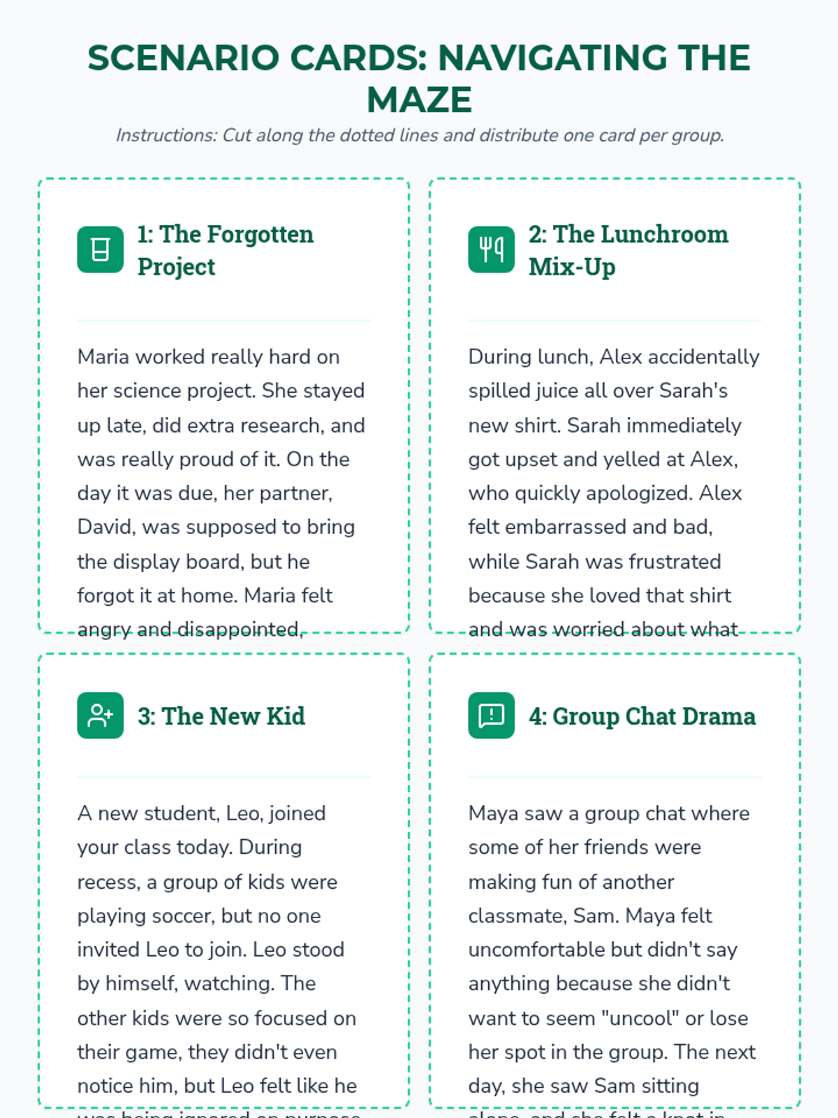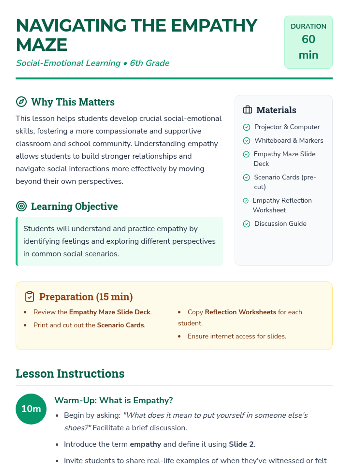 A 60-minute interactive lesson for 6th graders to build social-emotional skills through scenario exploration, group discussion, and personal reflection. Students learn to navigate complex social situations by practicing perspective-taking and identifying feelings in others.