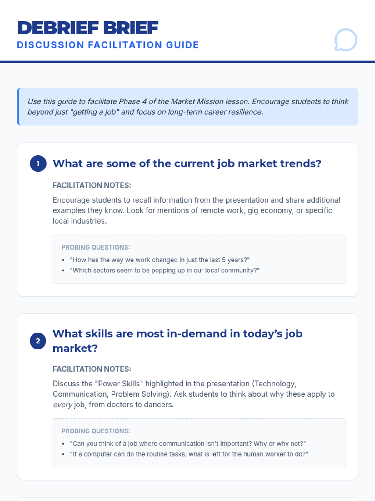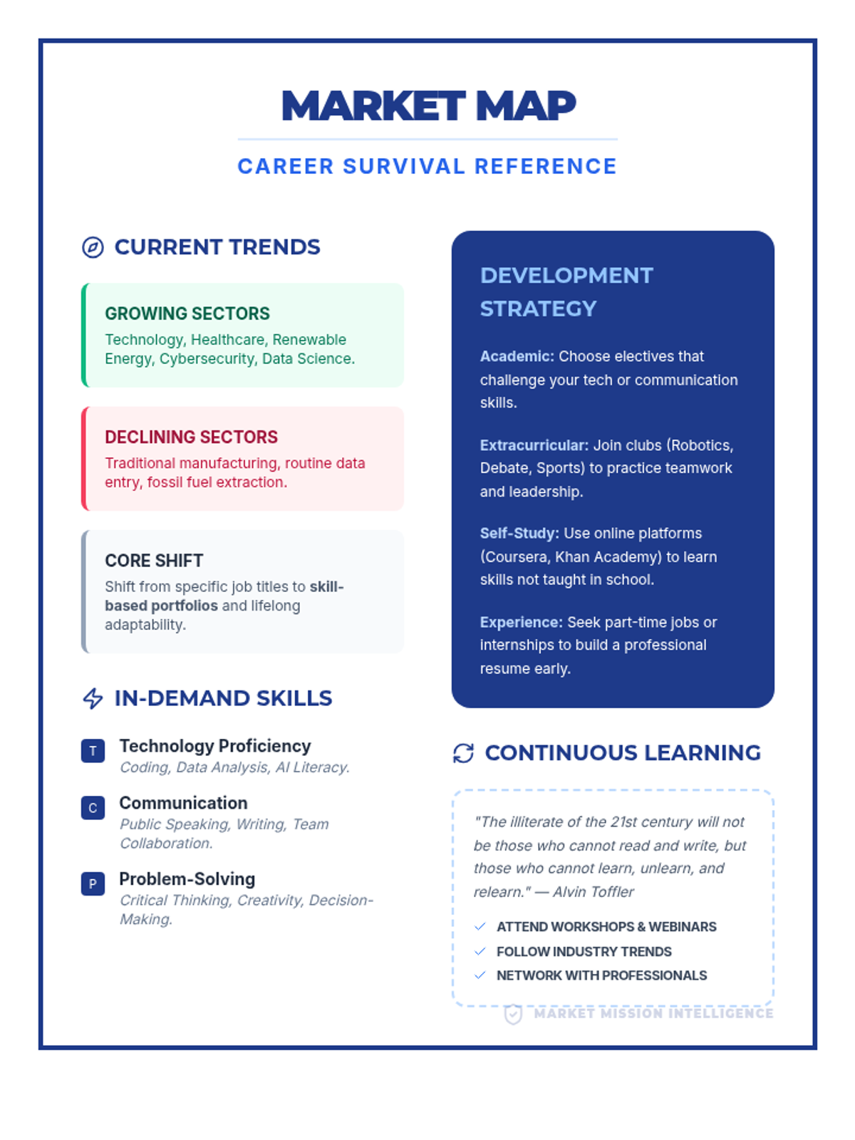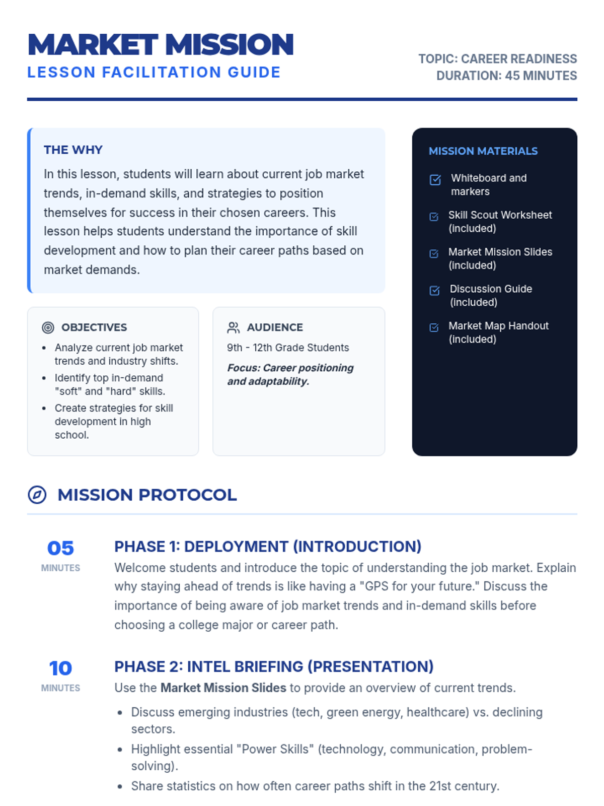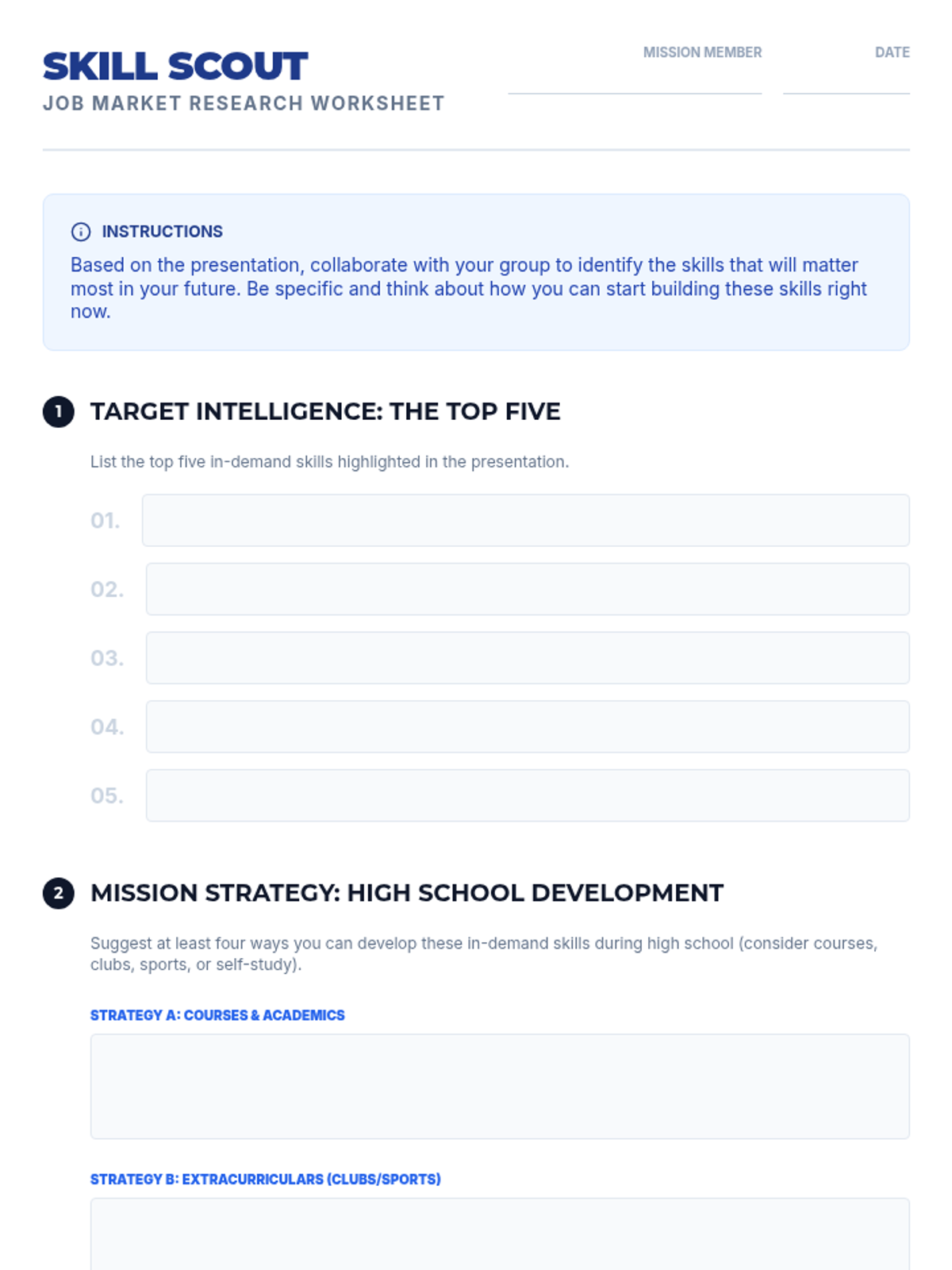 Students explore current job market trends, identify in-demand skills, and develop actionable strategies to position themselves for career success in an evolving economy.