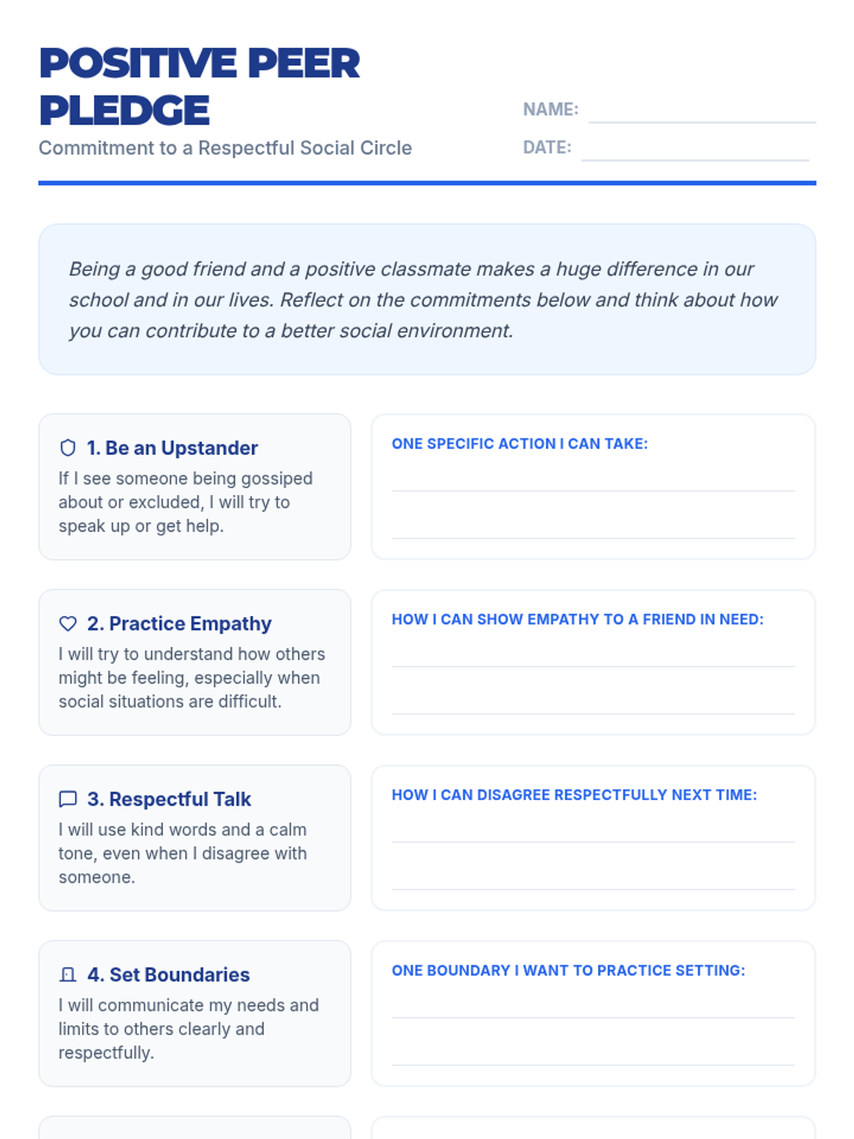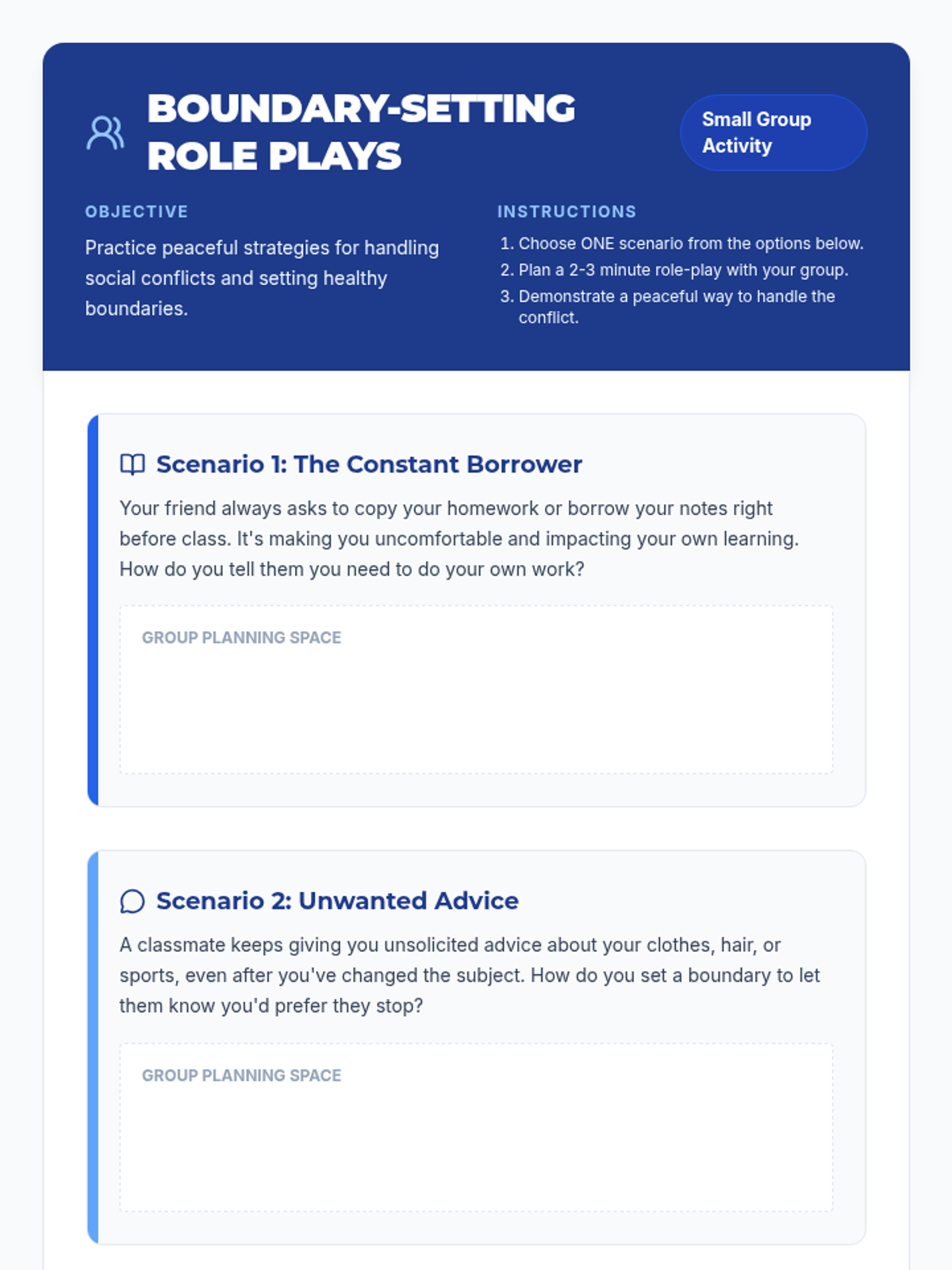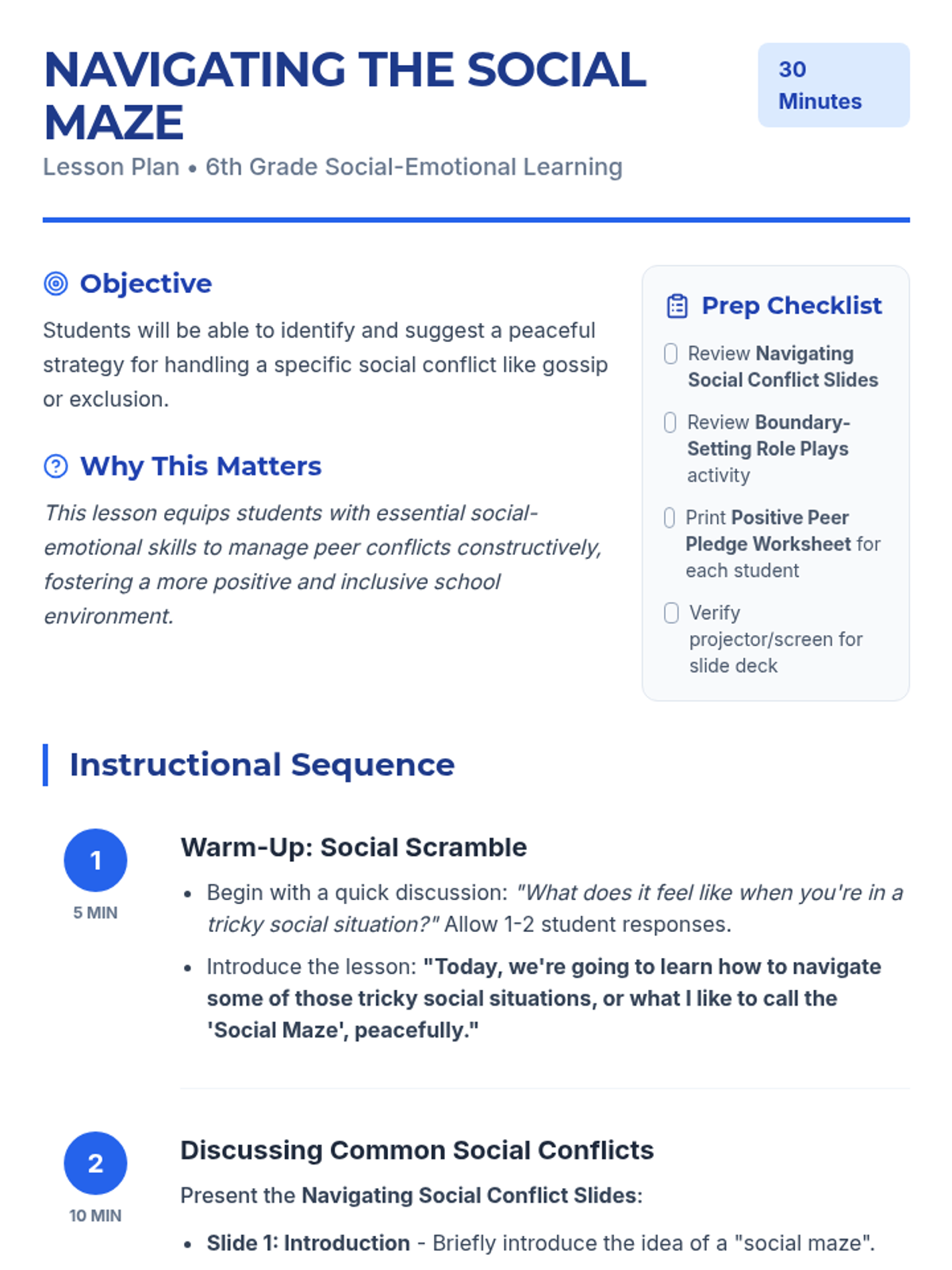 This lesson helps 6th-grade students identify common social conflicts like gossip and exclusion and develop peaceful strategies to handle them. Students will learn to navigate peer relationships, set healthy boundaries, and contribute to a positive social environment.