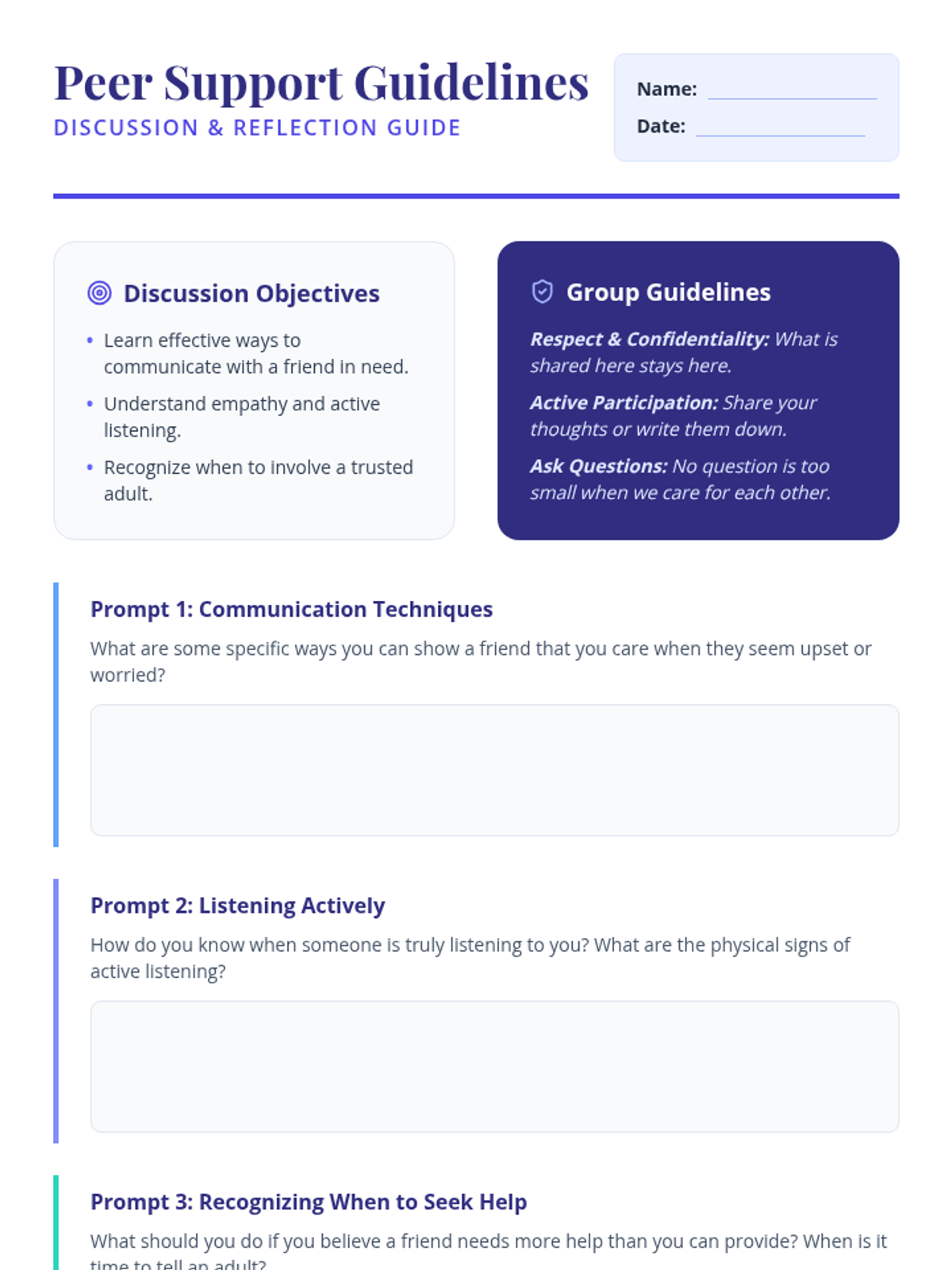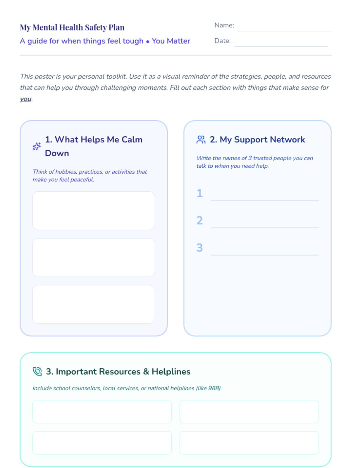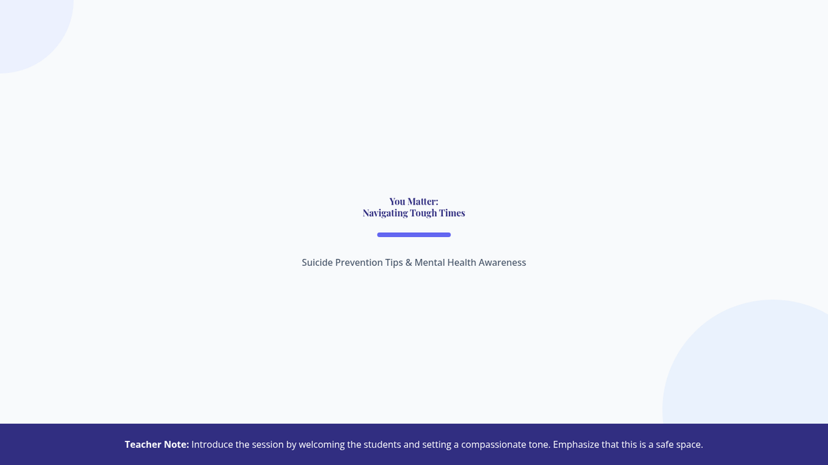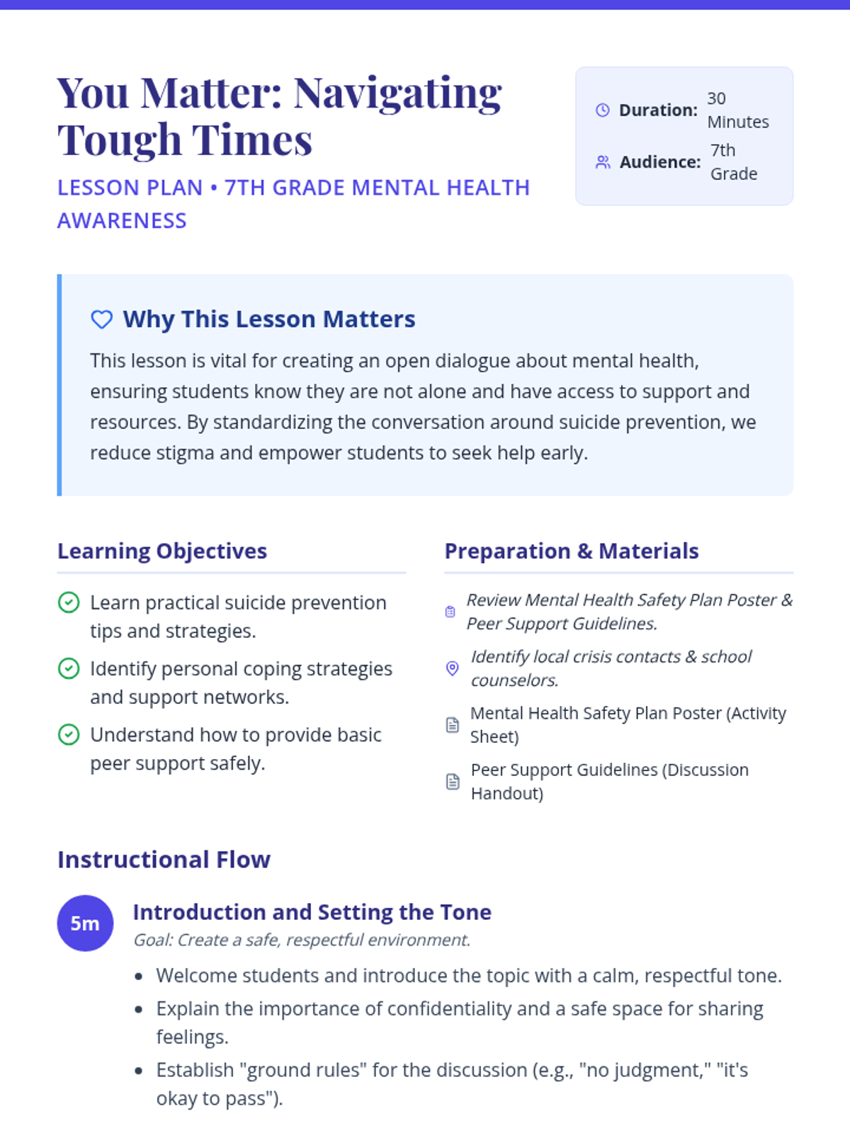 A 30-minute suicide prevention and mental health awareness lesson for 7th graders, focusing on coping strategies, seeking help, and supporting peers.