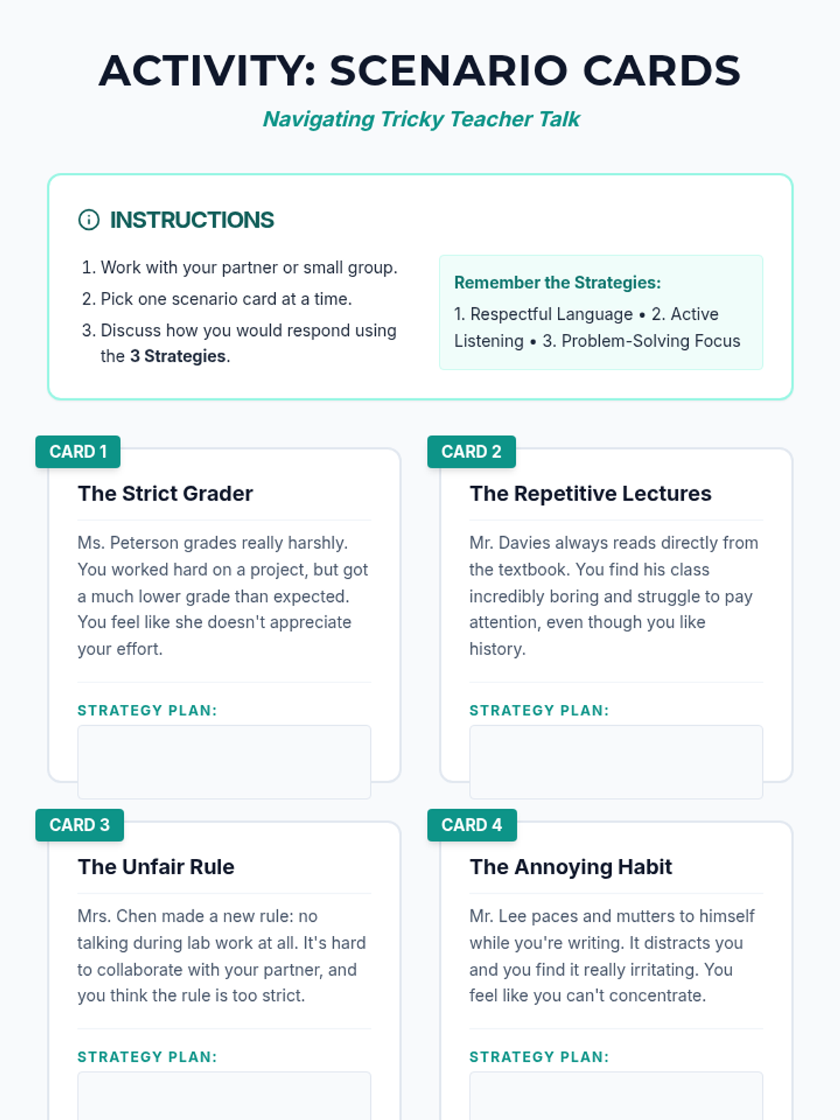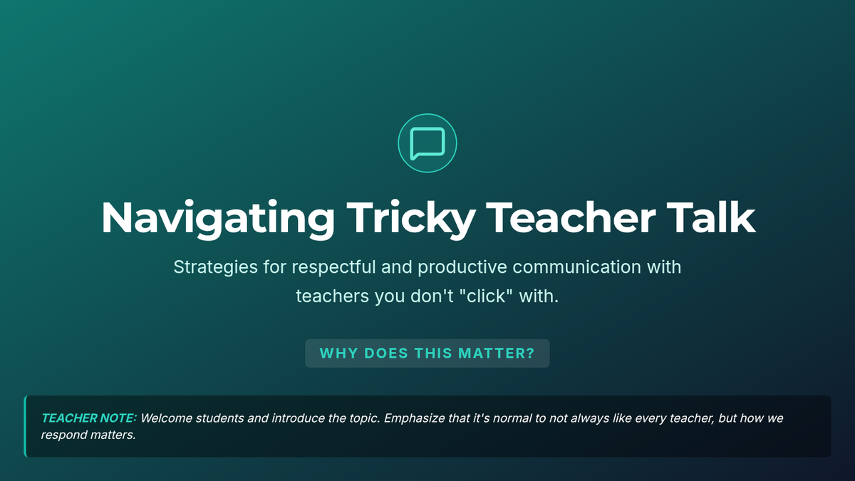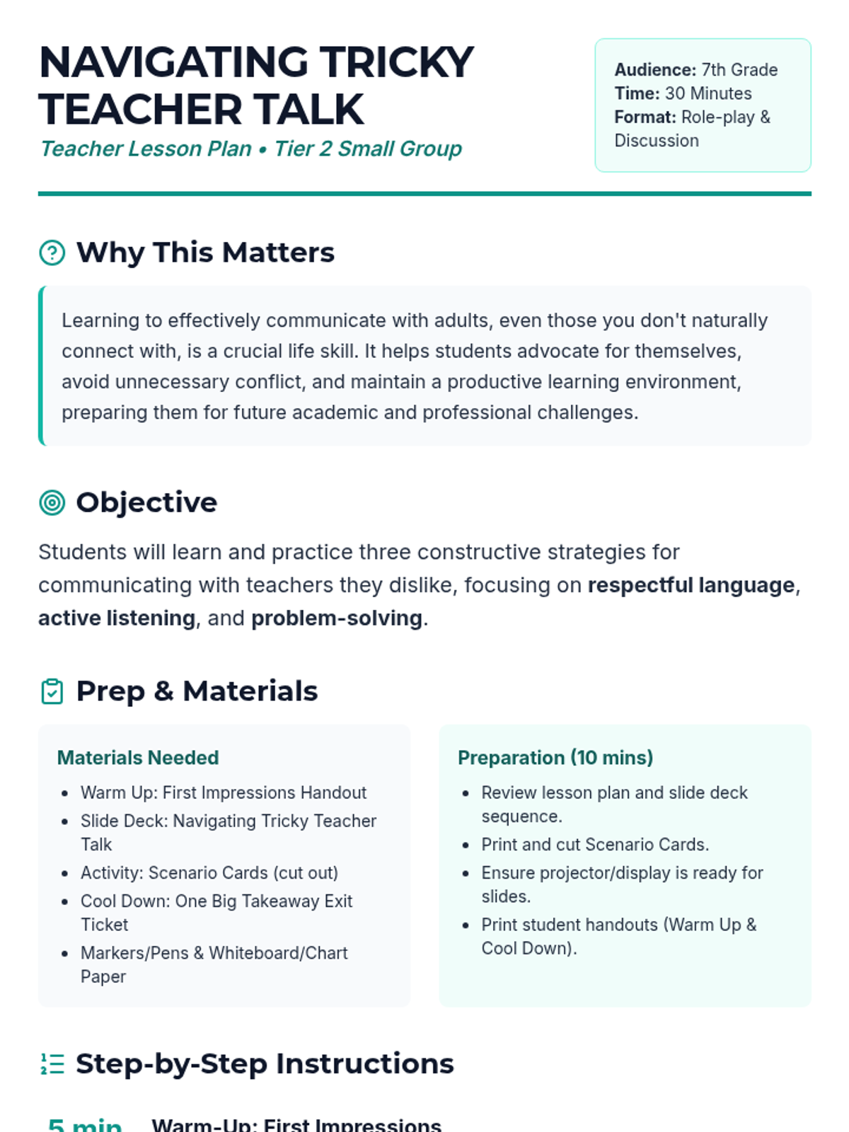 A 30-minute small-group lesson for 7th graders on self-advocacy and constructive communication with challenging teachers. Students learn and practice strategies like respectful language, active listening, and problem-solving to maintain a productive learning environment.