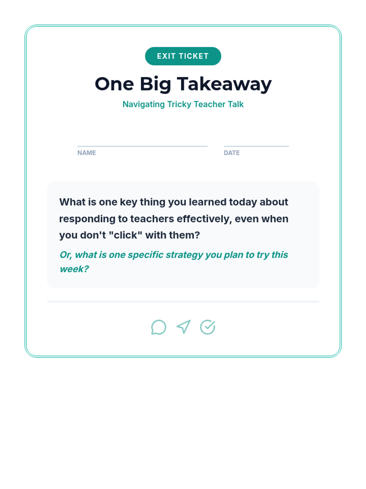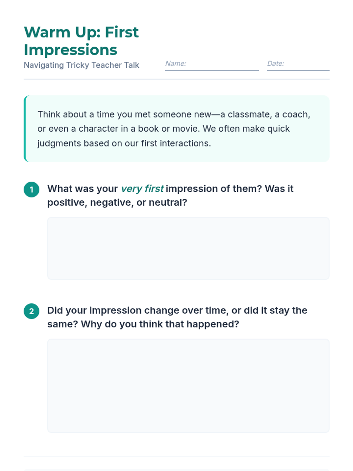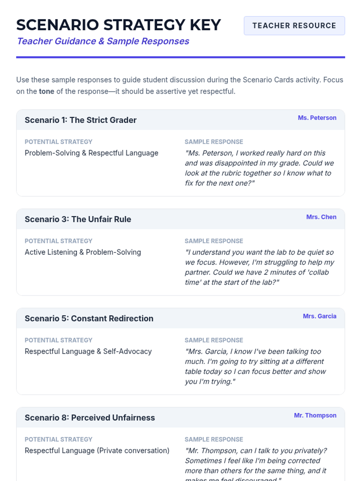 A 30-minute small-group lesson for 7th graders on self-advocacy and constructive communication with challenging teachers. Students learn and practice strategies like respectful language, active listening, and problem-solving to maintain a productive learning environment.