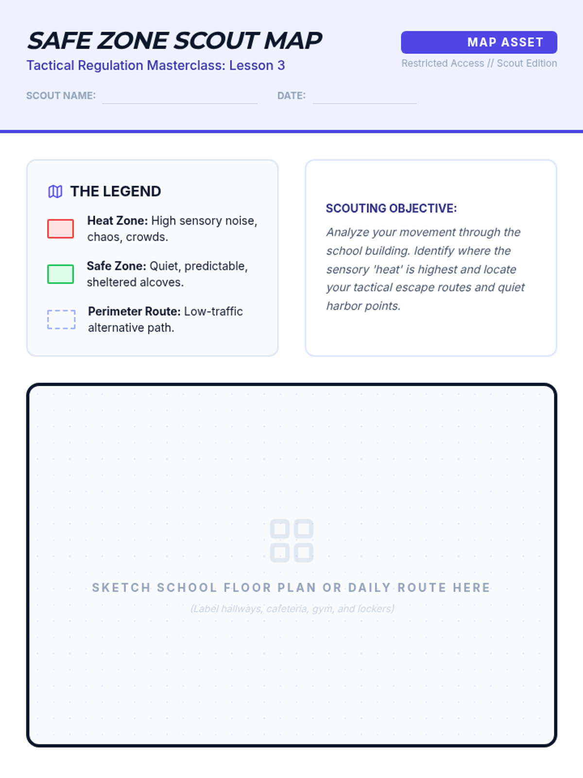 Students navigate the high-sensory environments of hallways and cafeterias by identifying safe zones and planning movement routes.