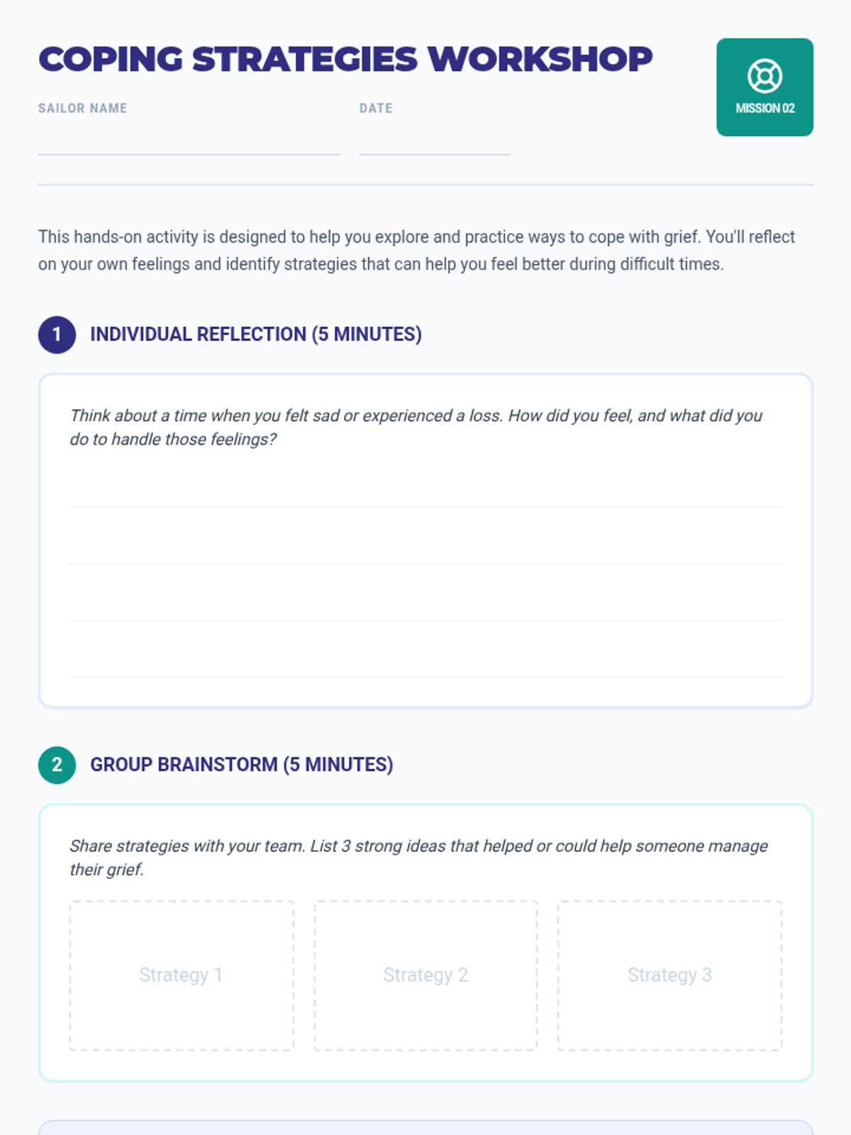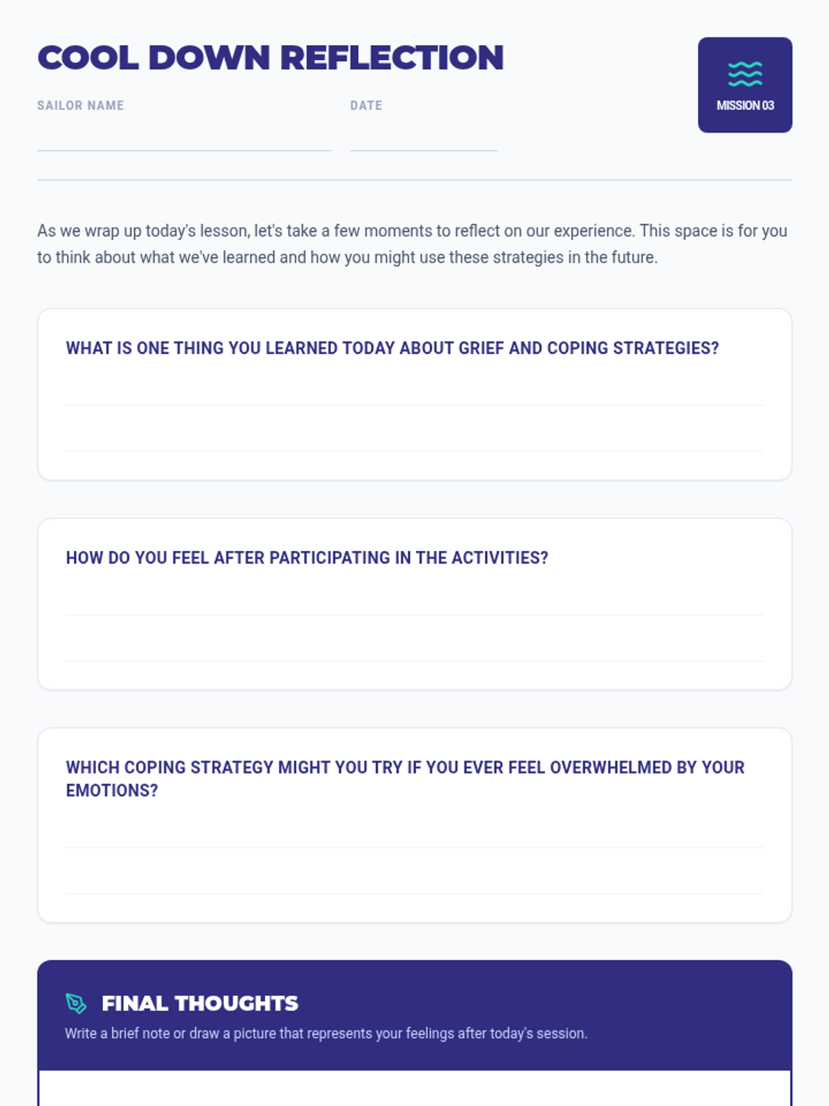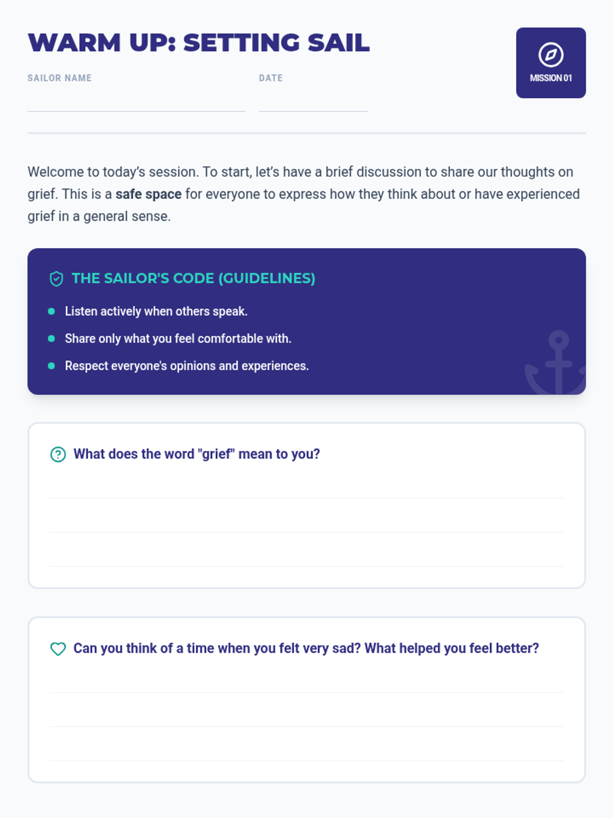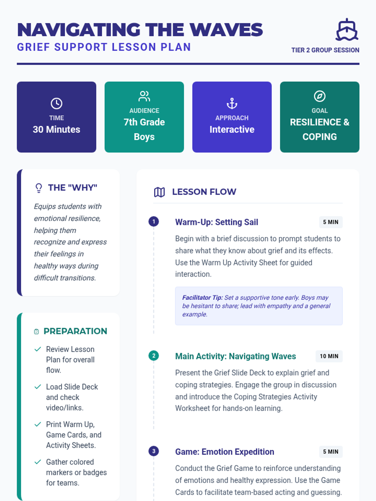 A Tier 2 group lesson for 7th-grade boys designed to foster understanding of grief and develop healthy coping strategies through nautical-themed interactive activities.