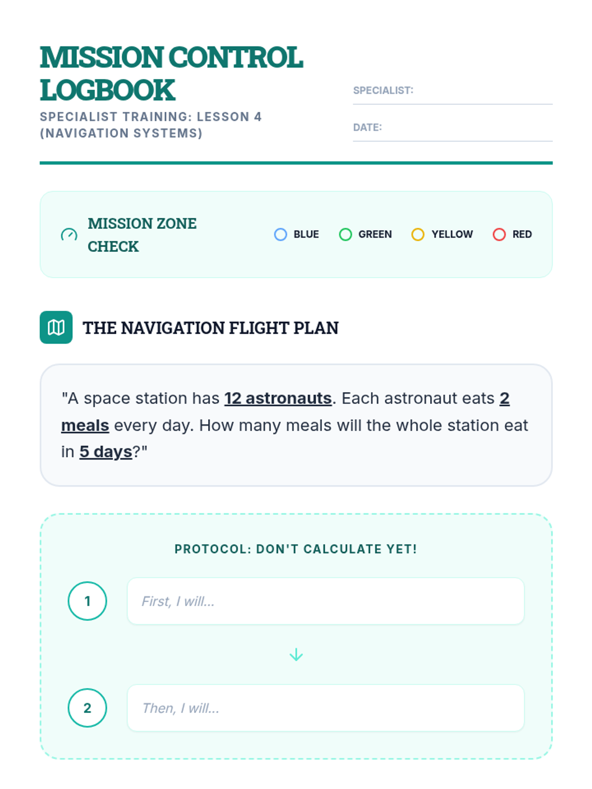 Focuses on "Execution" by teaching the student to create a step-by-step navigation plan before starting calculations, and checking if answers are "within orbit" (logical).