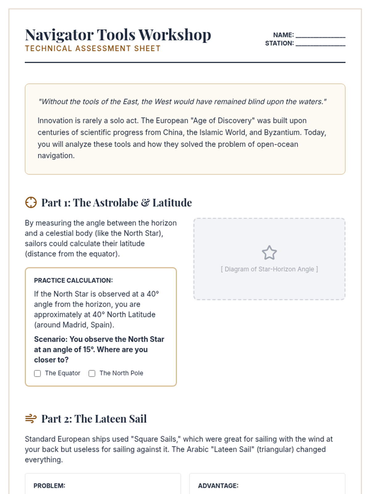 Explore the evolution of navigational tools like the astrolabe, compass, and caravel, focusing on the cross-cultural exchange of maritime technology.